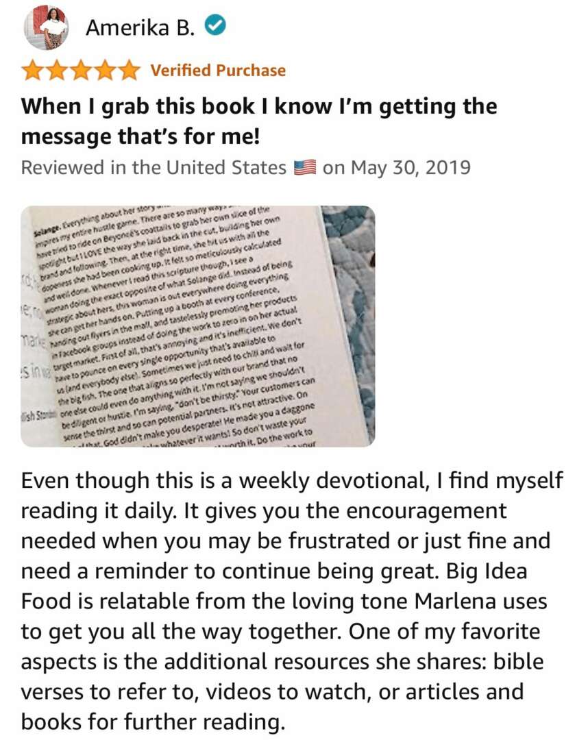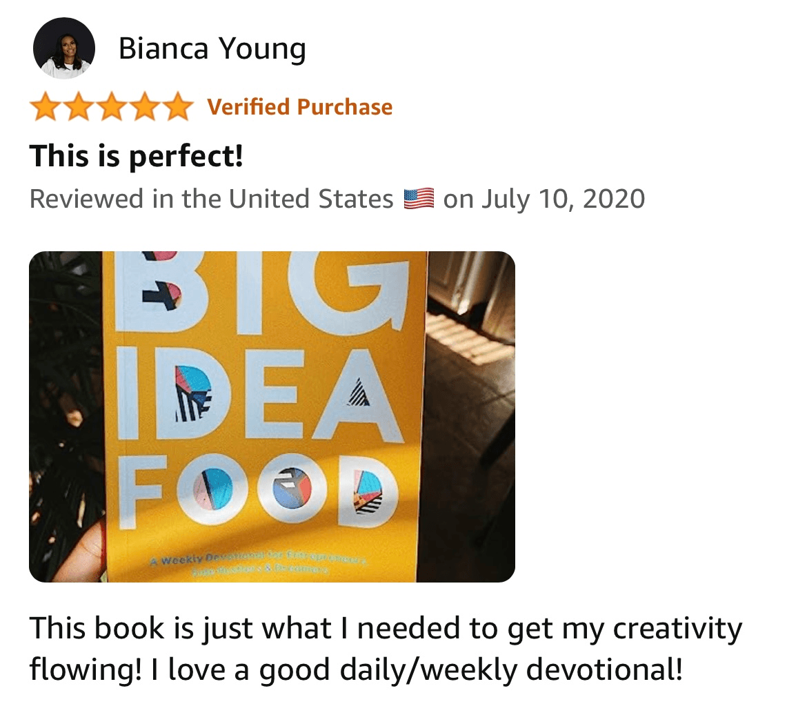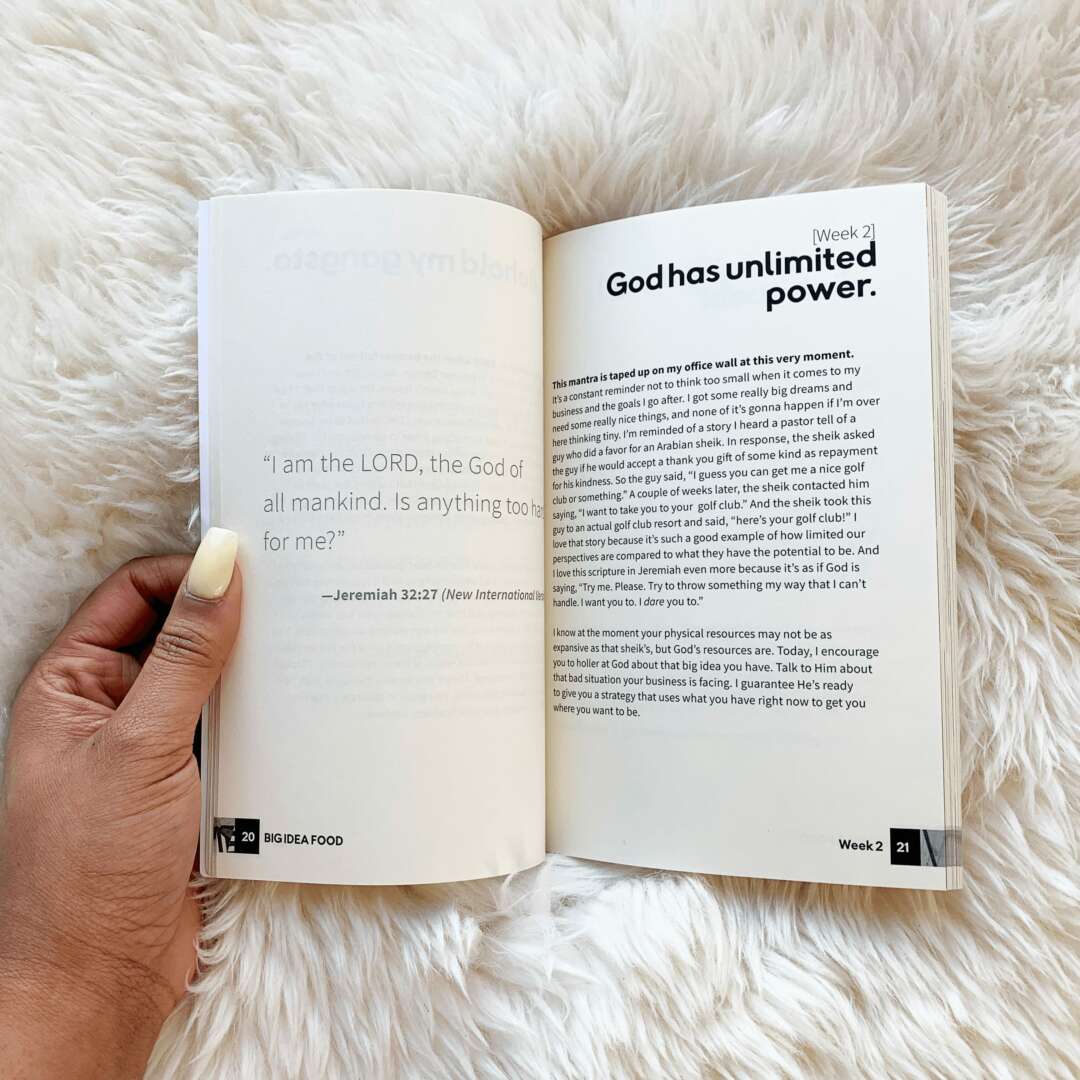 To date, I’ve received hundreds of testimonials from readers all over the world about how much Big Idea Food has blessed them. As a result of reading this book, people have ditched fears, started (and re-started) businesses, made wiser business decisions & connected with God in new ways they hadn’t been connecting with Him before. I’m endlessly proud to have produced something that has had this kind of impact in people’s lives. That’s why I’m very excited to release the next 2 books in the Big Idea Food series: Big Money Food and Big Love Food. Just like my first book, these two will feature relatable, scripture-based devotions from my journey in navigating business while figuring out money & love along the way. Big Money Food is already written and Big Love Food is in progress! I literally can’t wait to get these into your hands, they’re so good!