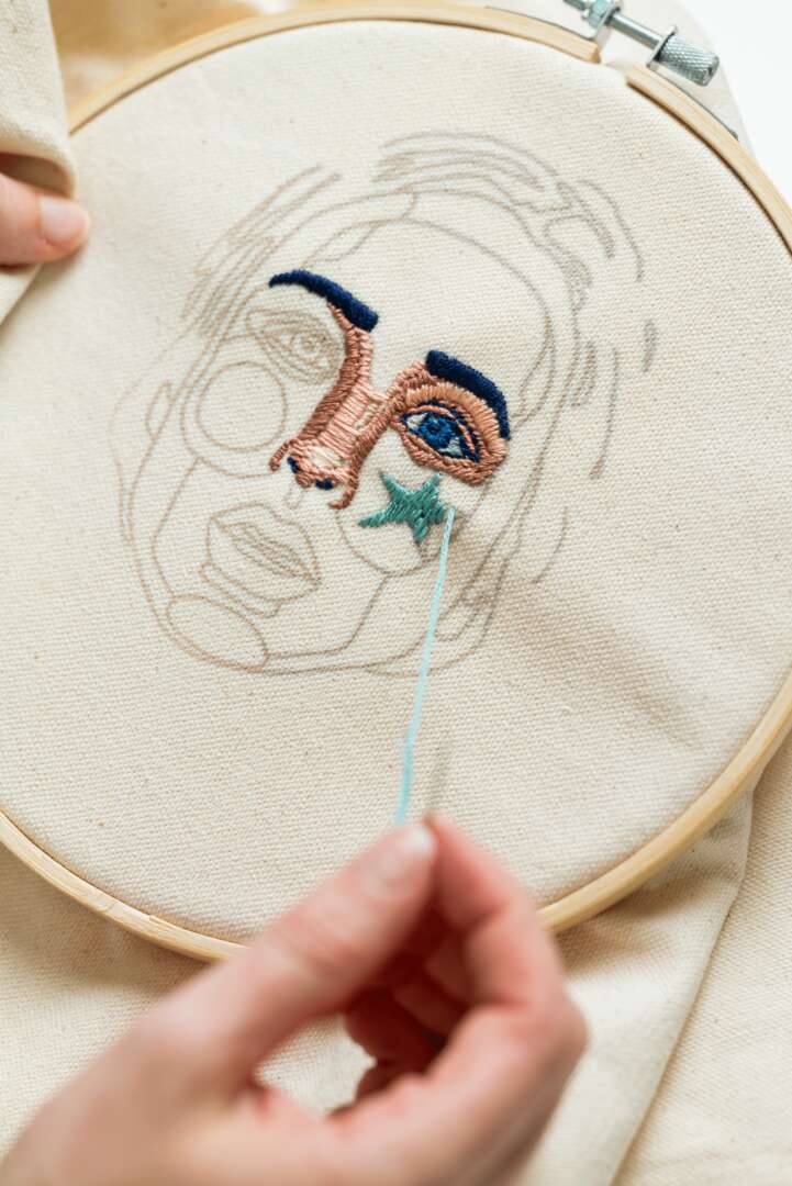 A few years ago, I learned how to embroider with a small pattern I bought on Etsy. My intention wasn’t to become an embroidery artist — it was just a way to keep my hands busy, binge-watch TV, and avoid my long to-do list. But as soon as I began, I felt connected to the work. I loved the repetition of it, the meditative energy of aligning stitches perfectly. At that point, I had been painting for a few years and I was quickly motivated to draw my own pattern for my next embroidery project.