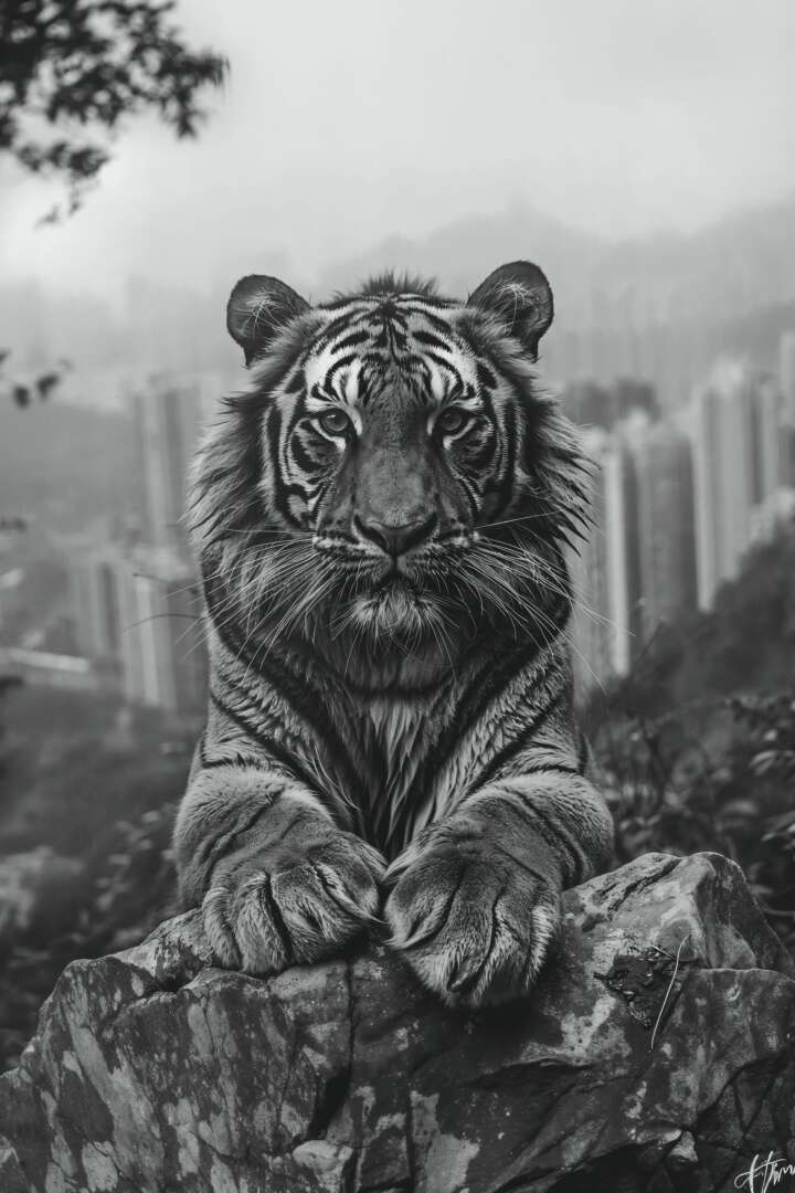 What sets my work apart is the narrative depth and emotional engagement I strive to achieve in every piece. By focusing on the interplay between wildlife and urban environments, I highlight the beauty and fragility of our natural world, urging viewers to consider their role in its preservation. My recent series, such as “BIG CATS | BIG CITY,” exemplifies this approach, showcasing the majestic wild cats (lions, tigers, etc) in their natural habitat, and juxtaposed against the encroaching elements of human development.