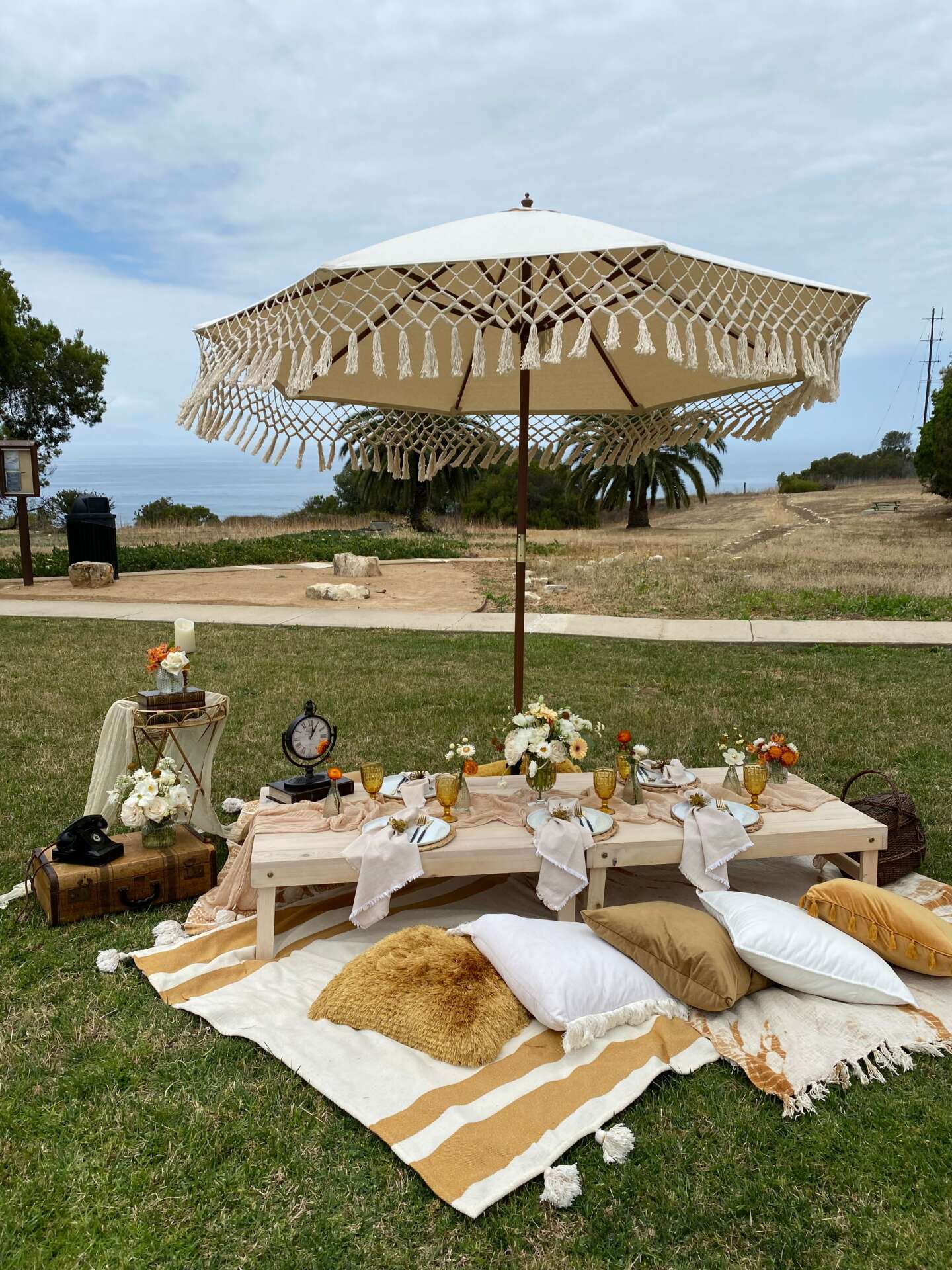 I curate a beautiful picnic setting for my clients for various occasions. I provide low tables, an assortment of pillows, blankets or rugs used as ground cover, and a complete table setting with non disposable items as well as props to go with the theme picnic (ei: boho style, elegant, vintage, etc…). I also make the flower arrangements to add to the table setting.