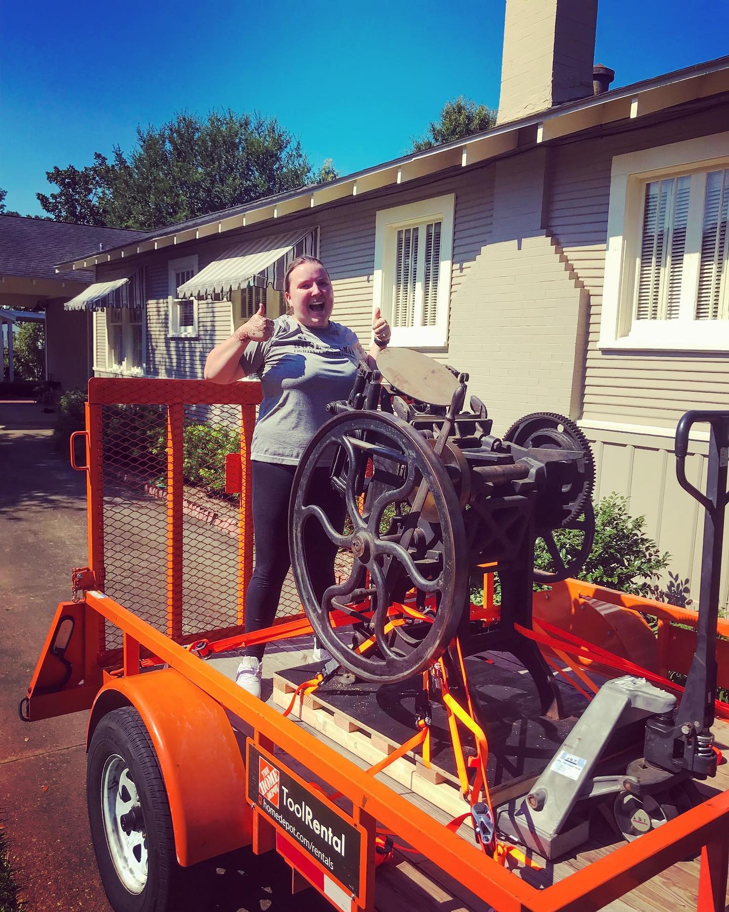 The next week, I coordinated a time with the seller, enlisted the help of my husband and his best friend (who are both engineers and all of us former college athletes) to help draft a plan to move the press. My husband decided he was going to make his own pallet to not only fit a pallet jack underneath the press to roll it, but to lift it over a very thick door threshold. Next, we rented a trailer and pallet jack that would carry the weight of Patsy. All three of us then made our way to Patsy’s location.