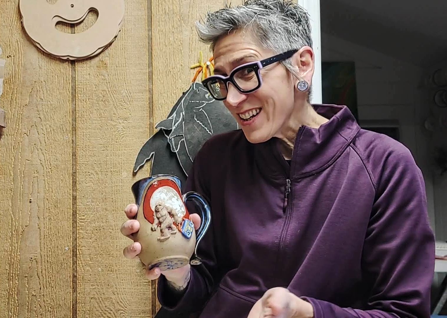 Currently, I’m 53, live in North Carolina with my husband and 2 great danes in a yurt on a sort of fruit farm. I have been self employed in some form of art business off and on for 29 years; mostly in the body art industry. Within that time I have also been an EMT, a River Rescue Tech, a Health and Safety Community Educator, a 26/2 Hot Yoga Instructor, and a Masters Swim Coach. Through many states and multiple moving adventures, and thanks to a super supportive husband, I was able to paint, swim, coach, tattoo, make mosaics, and get back into pottery. He signed me up for a month of studio time in a ceramics studio while we were in Florida, as a gift. It was so much better than taking ceramics in college, and I took to hand-building right away, and extended my studio time to a year. When we moved to NC I found a local arts school and took more ceramics courses so I could learn the ins and outs of running a studio. I started producing more, learned a little more about glazes and kilns, and started selling! In 2020 I bought my own kiln and equipment, and really got my pottery business off the ground. Now, my main focus is on 3-d mugs, glaze painted and underglaze layered cups, and fun statement pieces- like butter dishes and larger bowls and platters. While the majority of my cups and mugs are wheel thrown, my butter dishes, bowls and platters are slab-built. If anything sets me apart from others in my field, it may just be my odd sense of humor/ or sense of reality. I think many people are often way to serious, and take themselves and life too serious. I’m not immune to this, but I like to ask, “what do we really know!?” My objects take on a reality of their own.