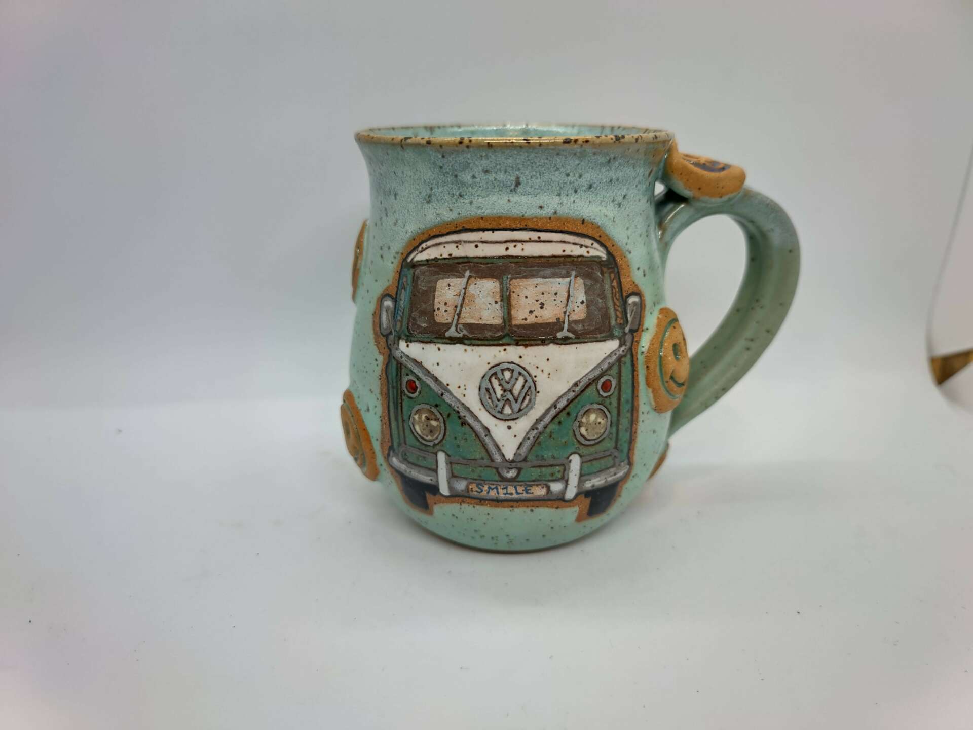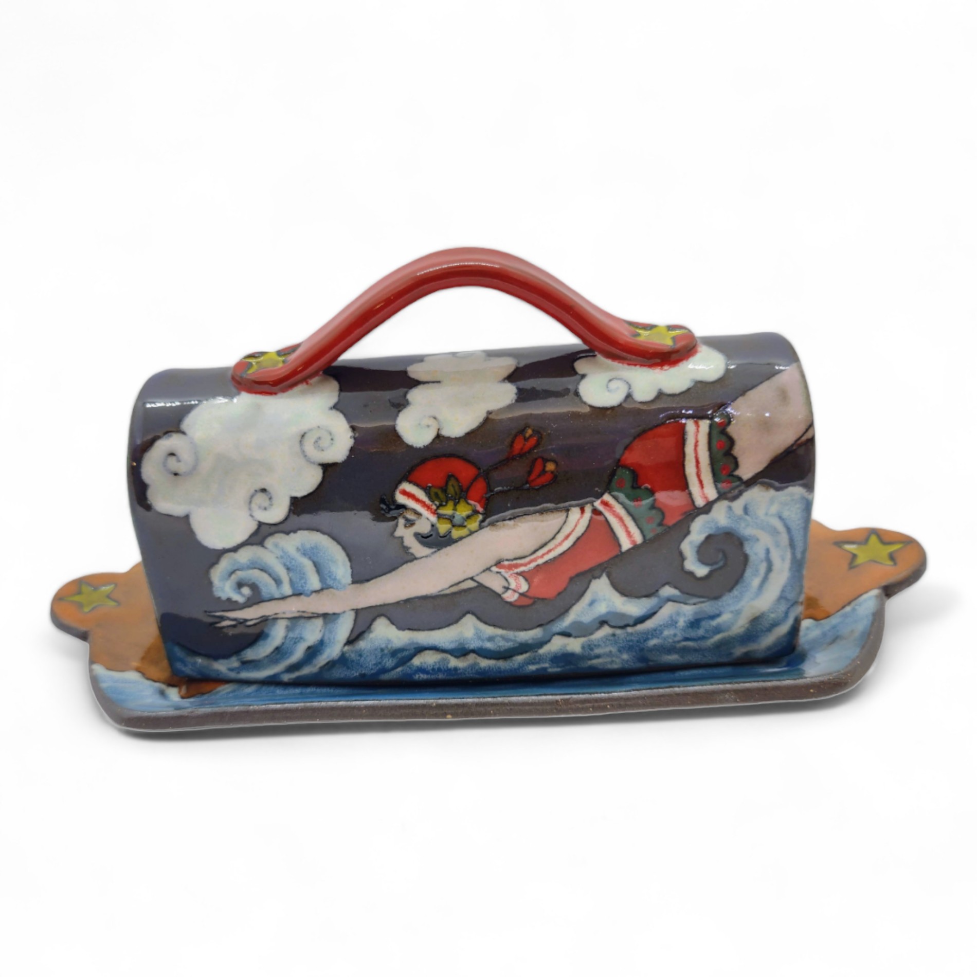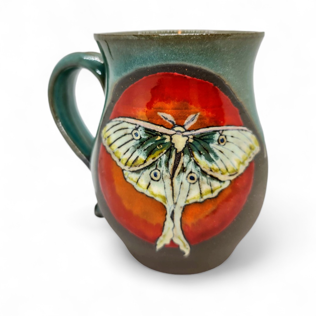 Currently, I’m 53, live in North Carolina with my husband and 2 great danes in a yurt on a sort of fruit farm. I have been self employed in some form of art business off and on for 29 years; mostly in the body art industry. Within that time I have also been an EMT, a River Rescue Tech, a Health and Safety Community Educator, a 26/2 Hot Yoga Instructor, and a Masters Swim Coach. Through many states and multiple moving adventures, and thanks to a super supportive husband, I was able to paint, swim, coach, tattoo, make mosaics, and get back into pottery. He signed me up for a month of studio time in a ceramics studio while we were in Florida, as a gift. It was so much better than taking ceramics in college, and I took to hand-building right away, and extended my studio time to a year. When we moved to NC I found a local arts school and took more ceramics courses so I could learn the ins and outs of running a studio. I started producing more, learned a little more about glazes and kilns, and started selling! In 2020 I bought my own kiln and equipment, and really got my pottery business off the ground. Now, my main focus is on 3-d mugs, glaze painted and underglaze layered cups, and fun statement pieces- like butter dishes and larger bowls and platters. While the majority of my cups and mugs are wheel thrown, my butter dishes, bowls and platters are slab-built. If anything sets me apart from others in my field, it may just be my odd sense of humor/ or sense of reality. I think many people are often way to serious, and take themselves and life too serious. I’m not immune to this, but I like to ask, “what do we really know!?” My objects take on a reality of their own.