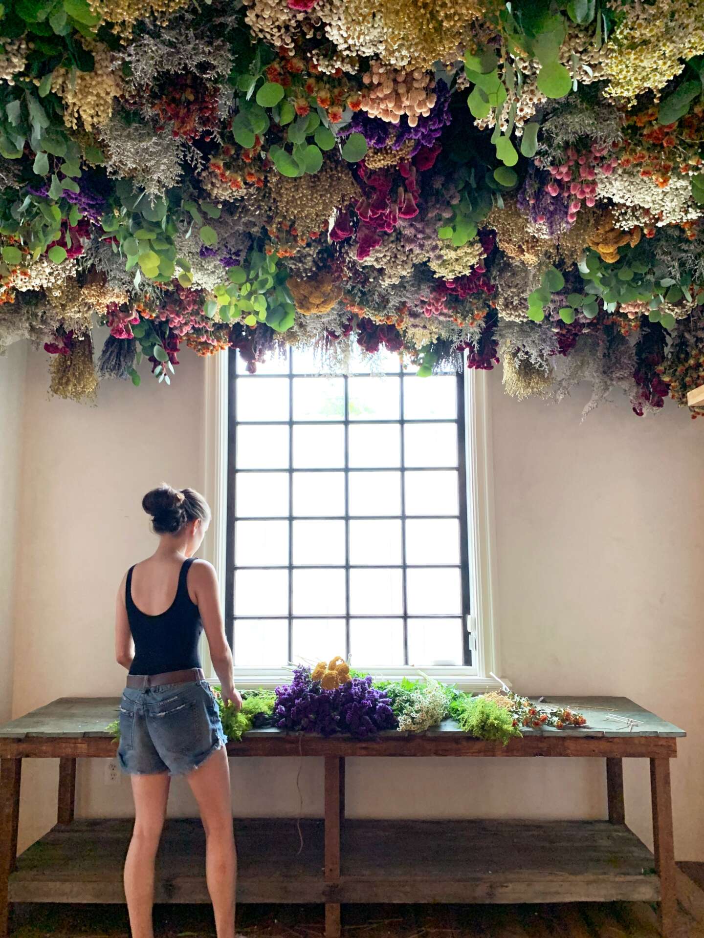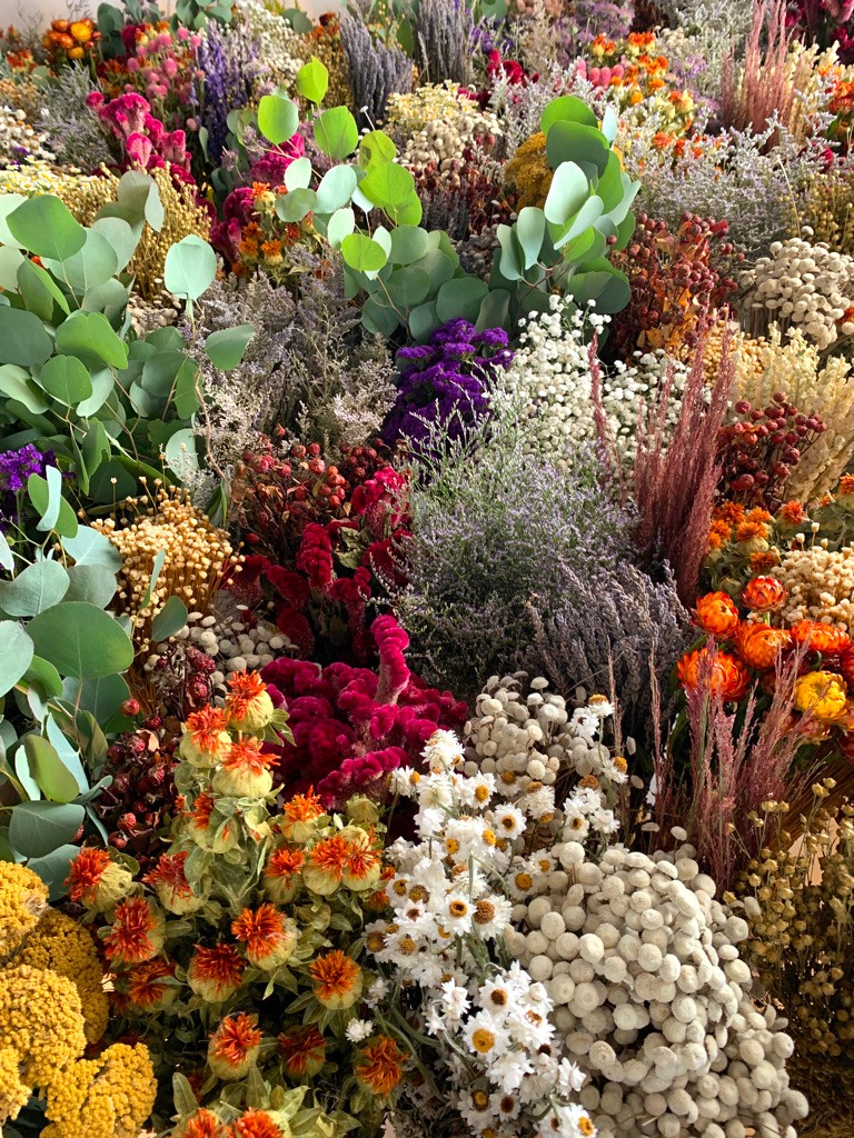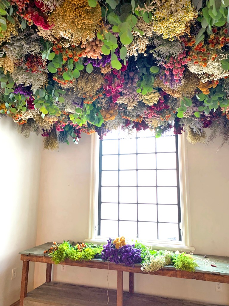 Take, for instance, the experience with a floral ceiling project. The client wanted a feeling of abundance with no ceiling showing through the dried florals. We were working within a strict timeline as the store opening date had already been set and the remaining florals would not be delivered in time for installation. Rather than waiting for post-opening to finish the installation, we opted for an alternative solution. We purchased bundles of fresh eucalyptus, chamomile, and other seasonal blooms to fill in the gaps. These live florals not only blended harmoniously over time as they dried, but they provided an unexpected and vibrant pop of color and delightful scent throughout the store for the opening. This scenario only underscored the power of adaptability for me as the final installation was enhanced by the additional element of fresh florals.