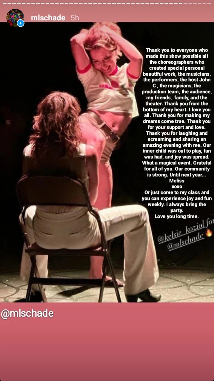 My favorite and most meaningful project would have to be my annual birthday party and variety show. For the last 9 years I have thrown myself a birthday bash. But it is not just a gift from me to me, it’s also for the entire community that surrounds me and has evolved over the years to become an entire event. The birthday party/variety show is called “Hey, it’s me Meliss”. I ask all of my super talented friends to choreograph numbers, sing a song, perform a skit, or create a work of art for me as a birthday present. I curate the show, decide on a theme (this year the theme was “Magic”), pick a host (this year the host was John C. Reilly), choreograph the opening and closing number, and the rest is a surprise! It’s a beautiful gift and surprise for both me and the audience, and because the show is made with so much love it ends up being the best evening ever. There is always a dance party after, and people DANCE because they are so inspired by the show. You will have to come next year. Talk about a joy spreader. This year we sold out a 360 seat theater. It was a blast!
