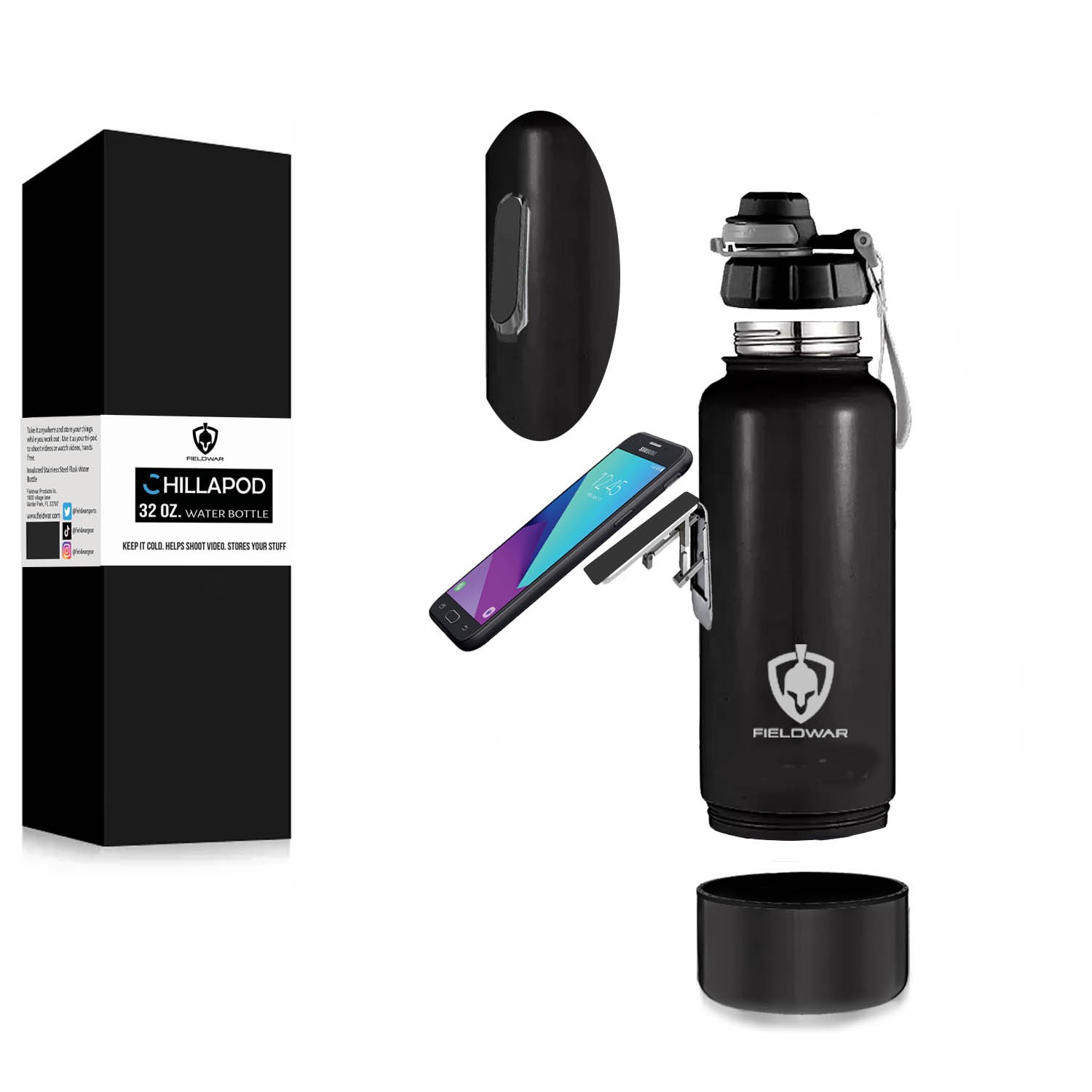 My new major product idea was just a few months ago when I was at the gym and noticed the floor littered with water bottles, phones and keys. It hit me that I needed to create a solution to put all of these onto one device. For people who want to shoot video, carry their phone to listen to music, or whatever, this puts it all together, plus the floors are gross so it keeps your things off of it. Having a background and degree in media production, I decided this would be awesome as monopod quick setup for video for all kinds of situations. so I started sourcing companies in Asia and decided on leading off with a 32oz. insulated steel bottle to do the job. It’s called the Chillapod since it keeps your drinks cold up to 24 hours and its like a tripod for your phone.