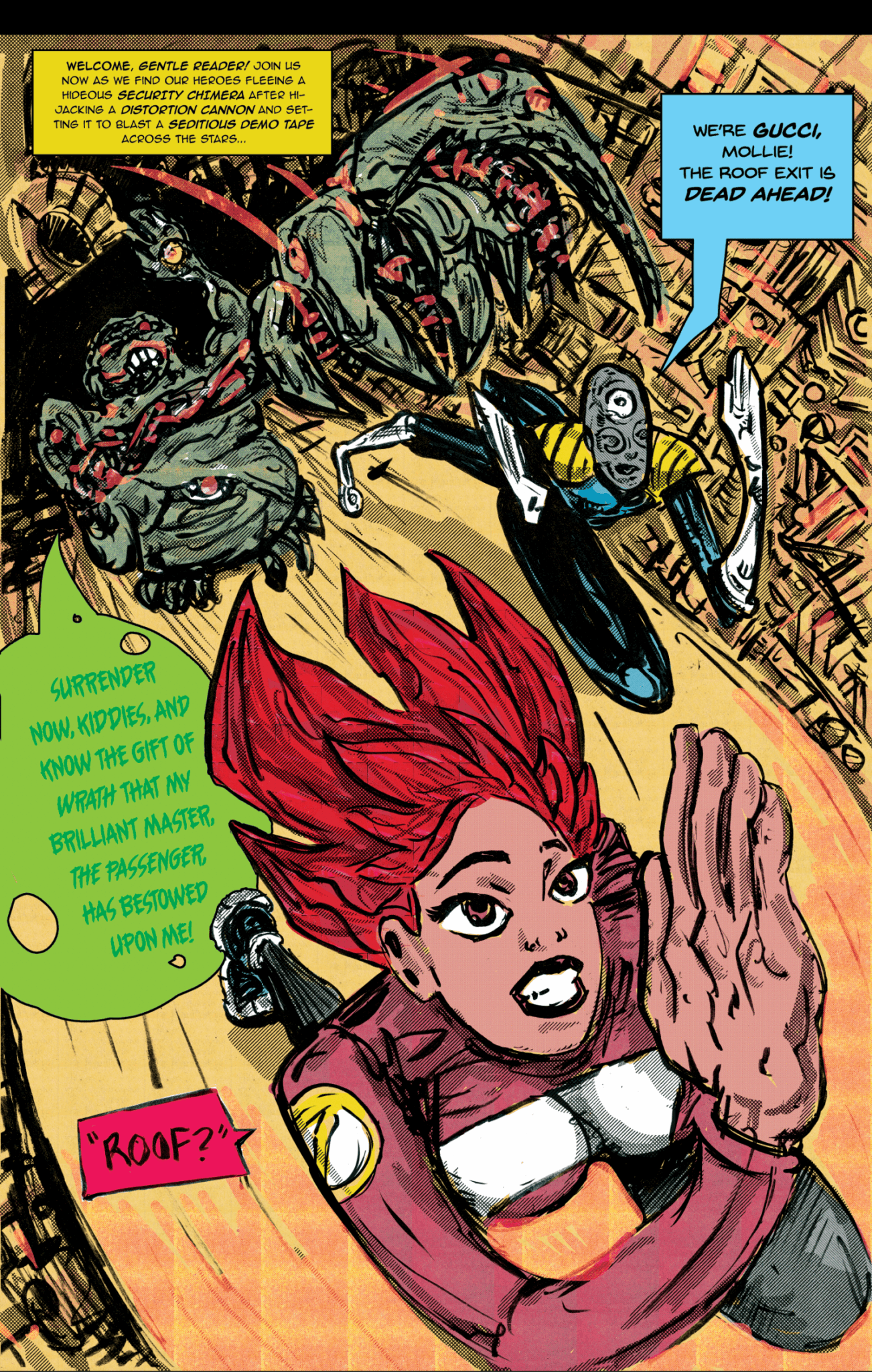 The work I’m most proud of is a psychedelic punk rock space opera called, “Mollie and The Spacediver.” This is an ongoing series of comics about a girl who finds out that her guitar is an alien wizard. Think “Calvin and Hobbs” meets “Jem and The Holograms.” Together they fight alien fascists in a quest to save music itself from being erased from existence. I am currently working on the third volume of this series, and I have never been more excited about a comic. The earlier volumes trace my progress as a cartoonist from an all-digital beginner to someone experimenting with a hybrid ink/digital format. My latest stuff is me claiming my style and “leaving it all out on the field” for my readers.