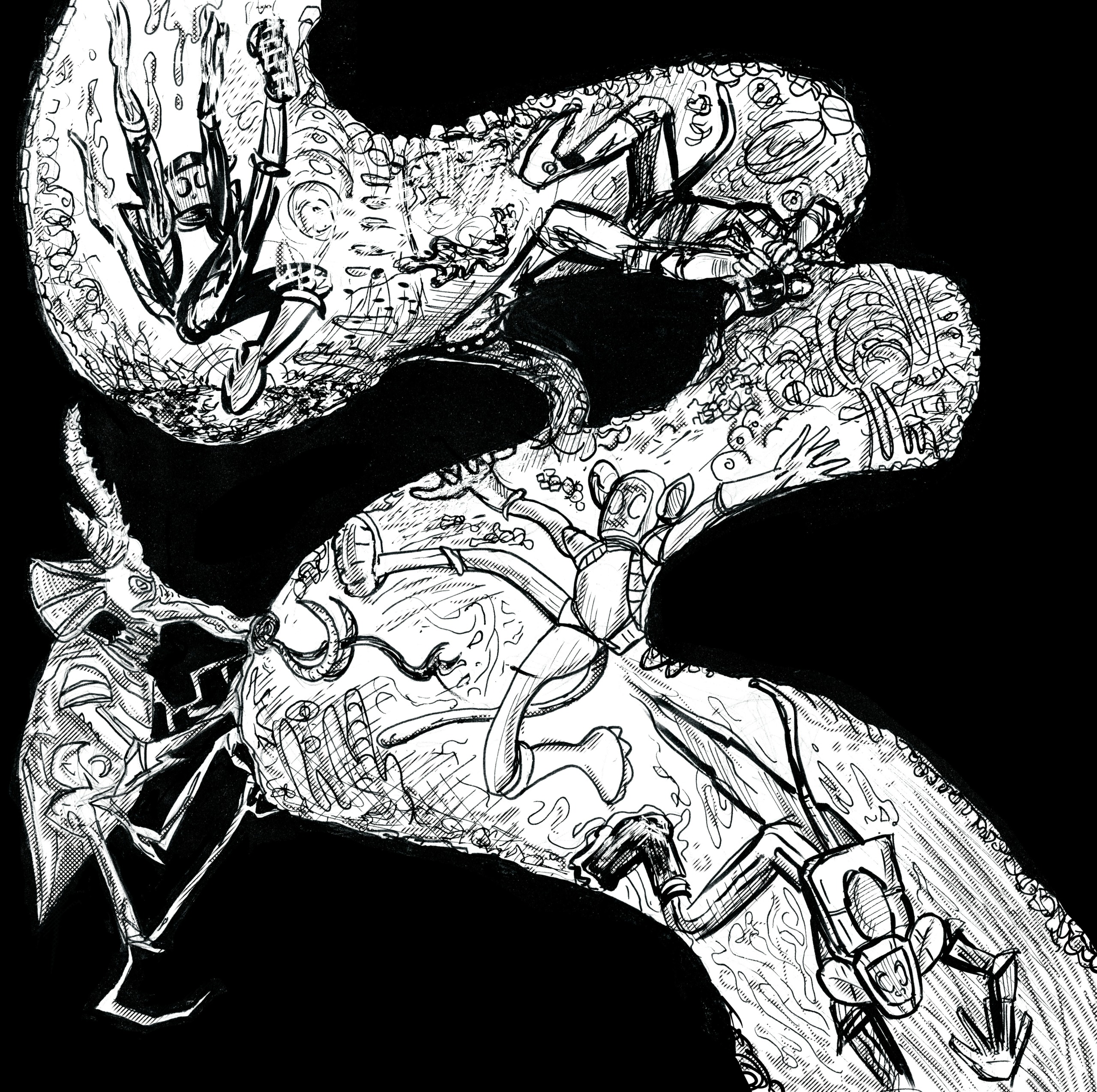 Eventually I caught on and made some pretty good stuff for where I was at. My drawing teacher, Susan Meyers, taught me how to capture the audience’s eye using a compositional hierarchy, and then keep it captured by moving it around the page with dynamic line art, so that the drawing becomes hypnotic. She also threw any strict adherence to realism out the window, saying “the goal of a photo is to capture a moment, the goal of a drawing is to capture your reaction to a moment.” That blew my mind.