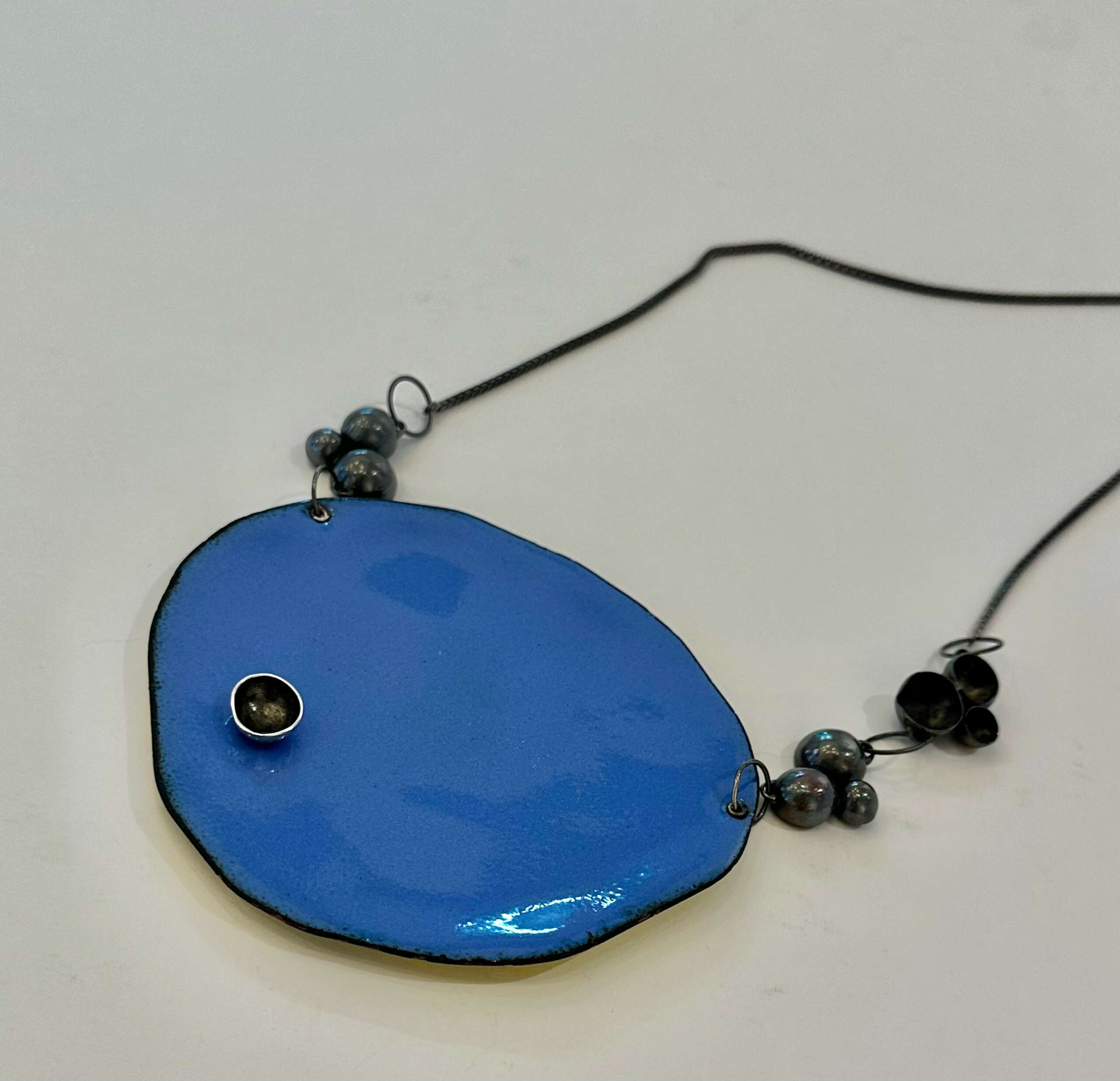 Michel’s newest body of work is comprised if vitreous enamel and cast pieces. “I love the magic of combining these two techniques to create sculptural jewelry with color. I am fascinated by the hues and beauty of the glass juxtaposed with the pure metal.“