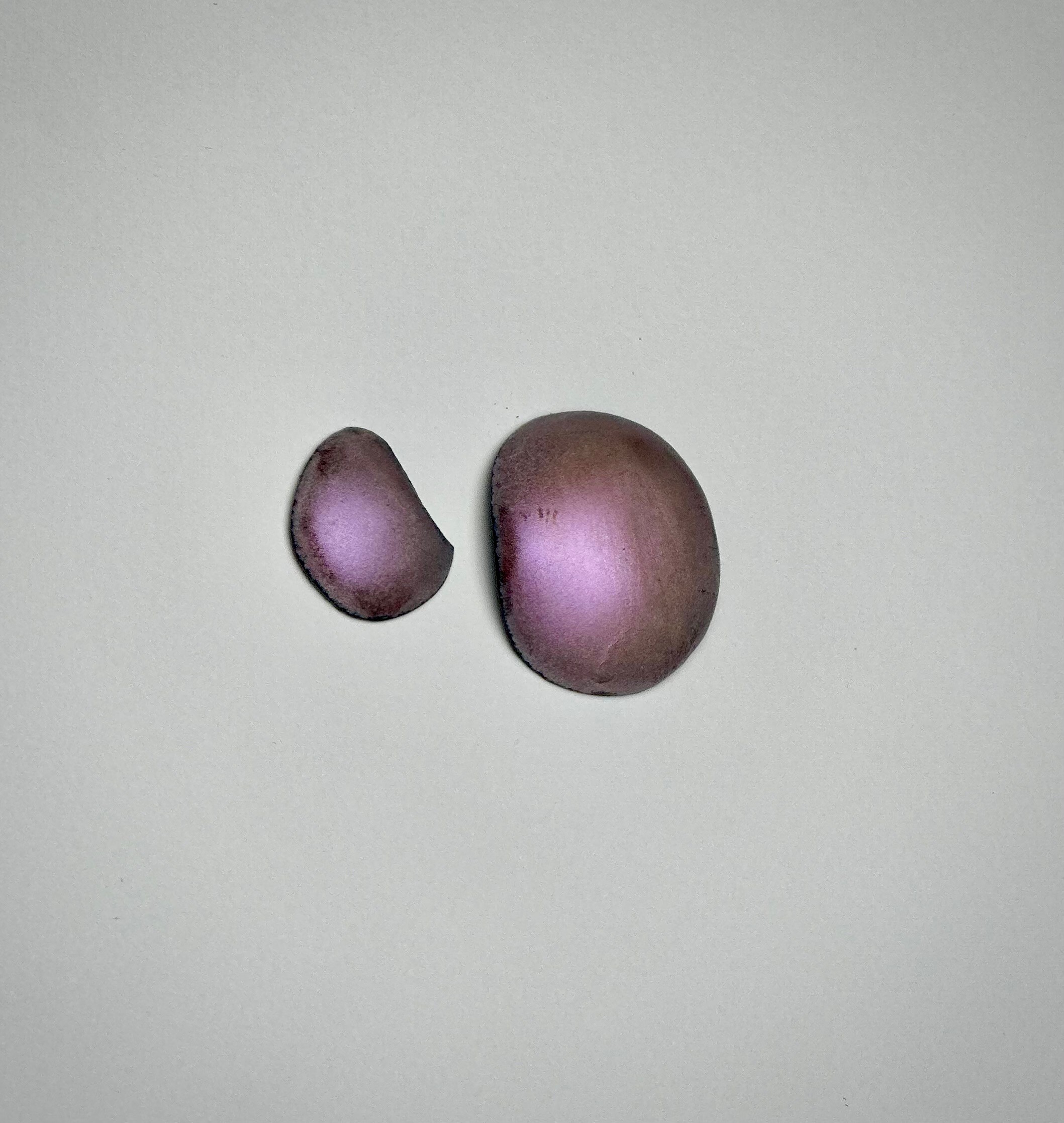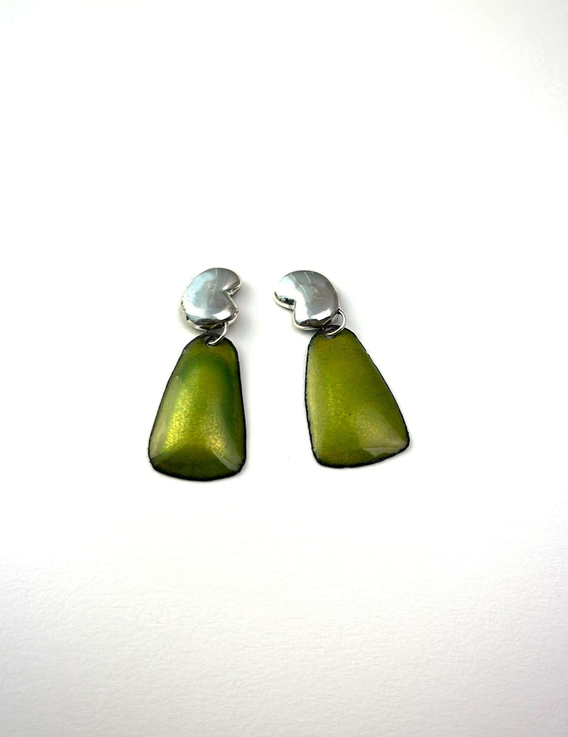 I am very inspired by museums and items found in archeological digs. I love imagining what life was like in long lost civilizations. The beauty and art that was part of their every day lives worn away by time make my imagination run wild. For this pair of earrings I have taken the original button earrings to create a bowl that is “unearthed” from an excavation. It is paired with a triangle that is carved in wax and cast. The cast piece is signed inside. The modern triangle is a smooth piece juxtaposed with the ancient excavated bowl.