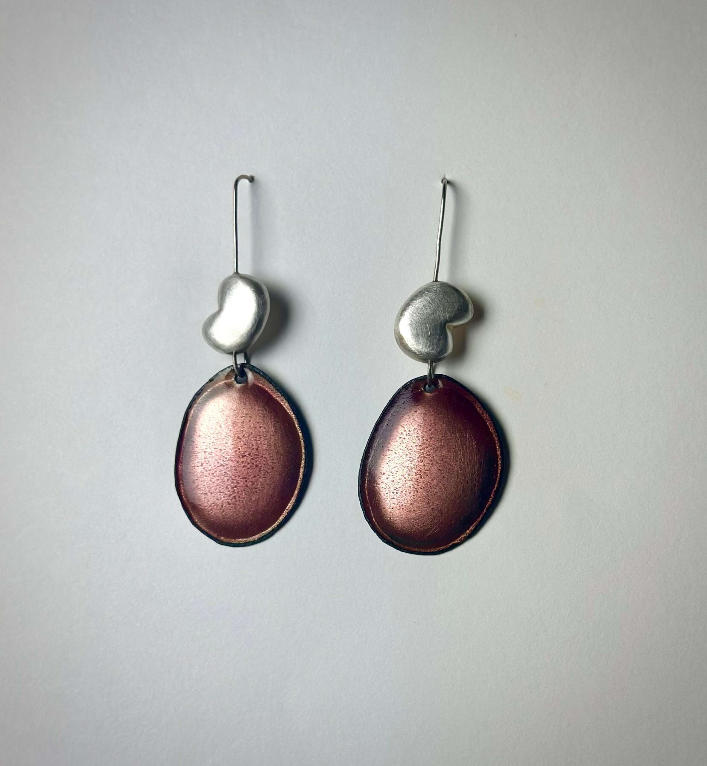 I am very inspired by museums and items found in archeological digs. I love imagining what life was like in long lost civilizations. The beauty and art that was part of their every day lives worn away by time make my imagination run wild. For this pair of earrings I have taken the original button earrings to create a bowl that is “unearthed” from an excavation. It is paired with a triangle that is carved in wax and cast. The cast piece is signed inside. The modern triangle is a smooth piece juxtaposed with the ancient excavated bowl.