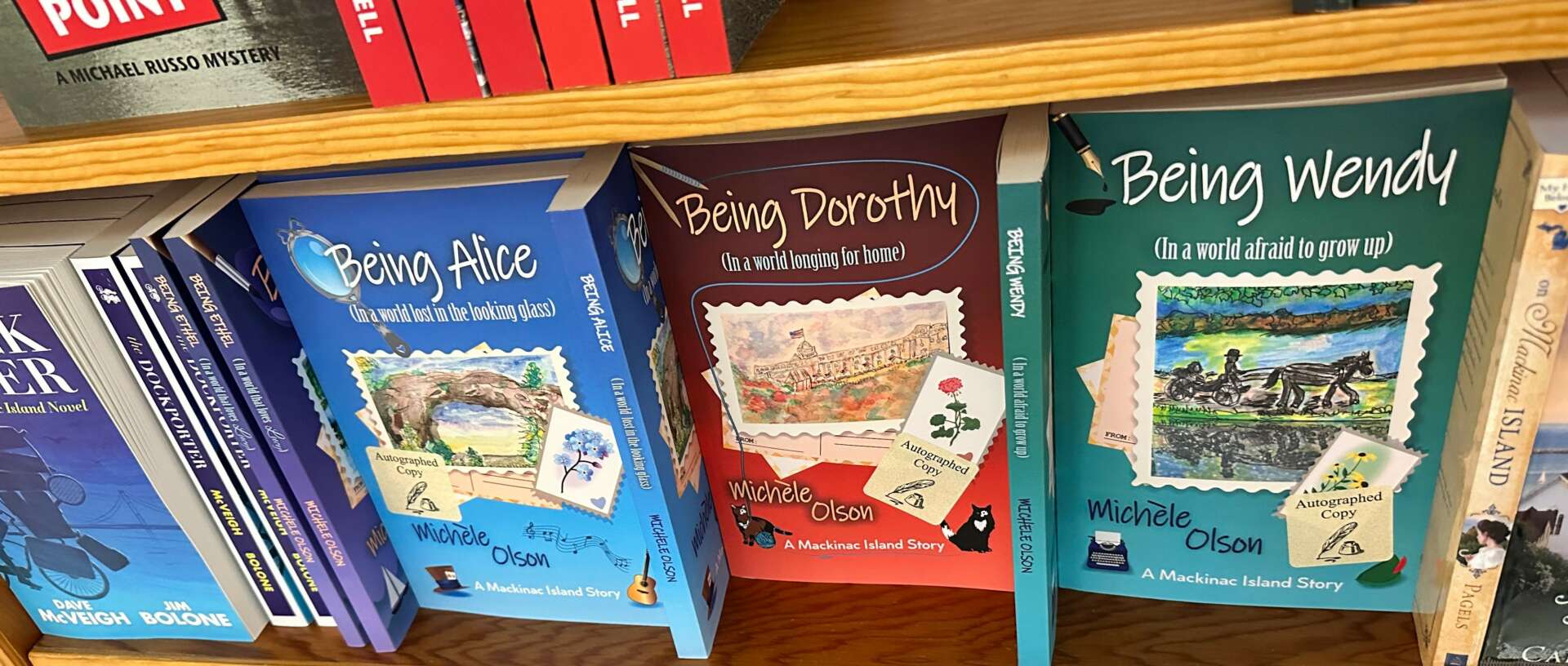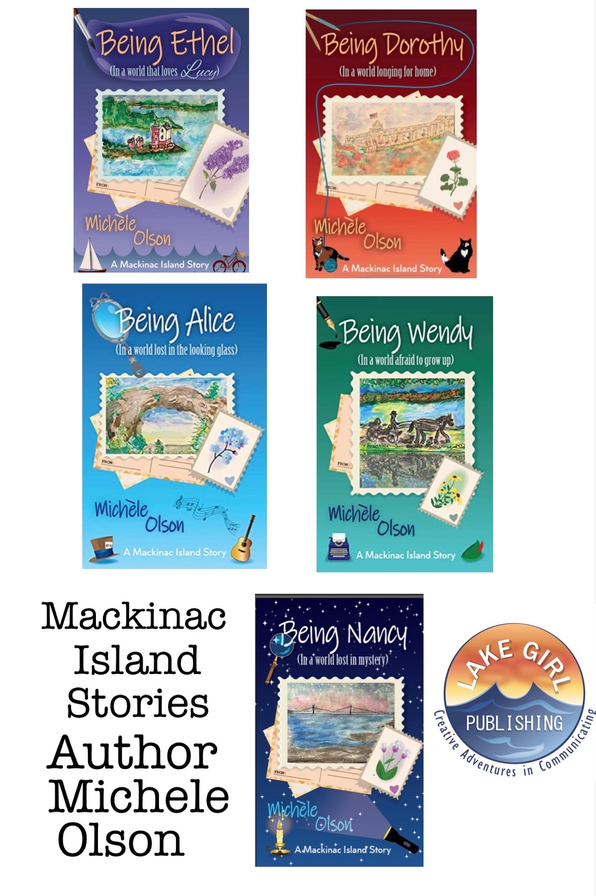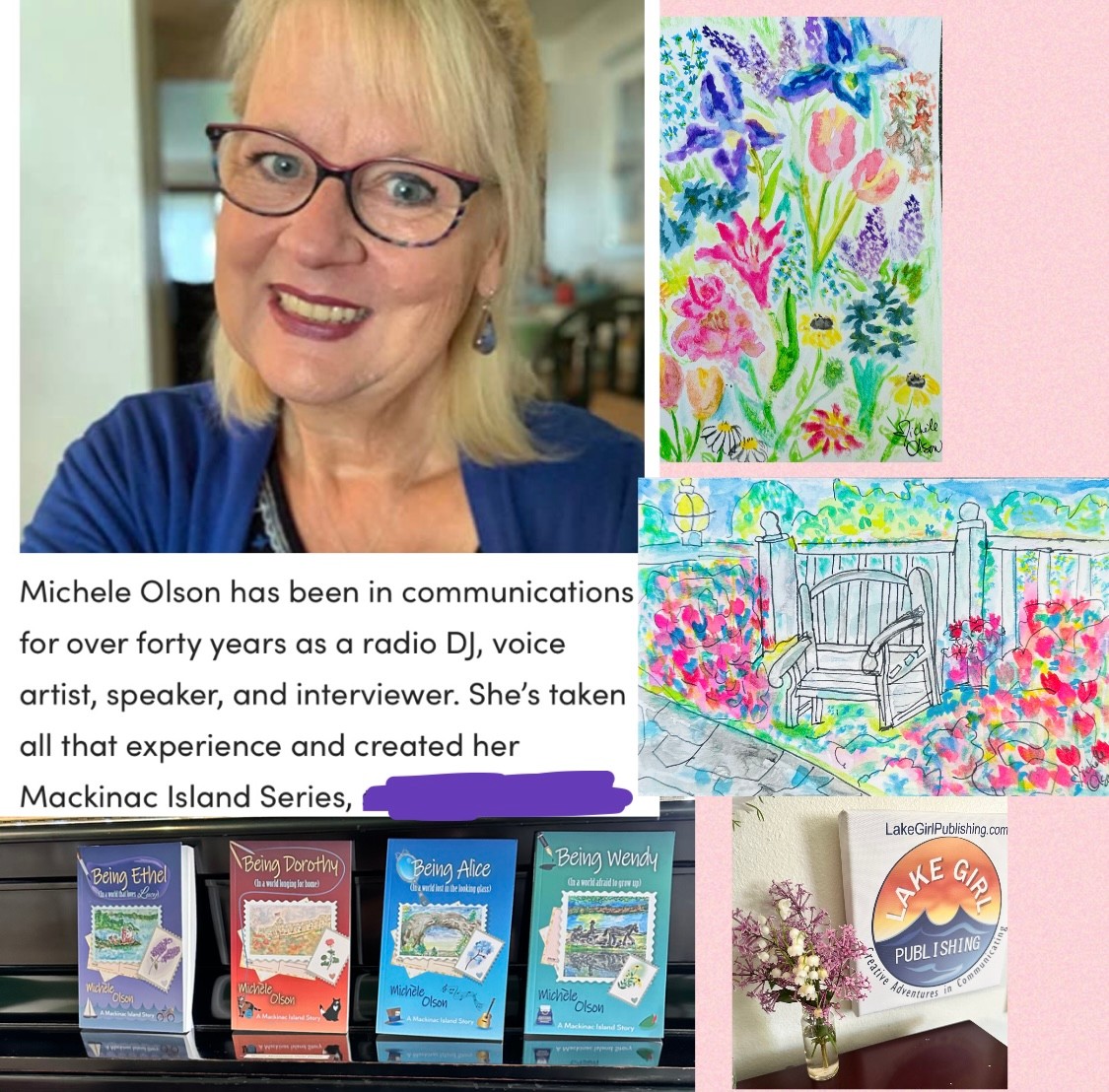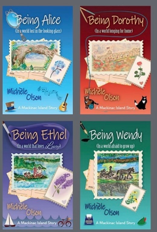 I became an author after a 45-year career in marketing and advertising as a media writer. I always wanted to write a book, but I thought I would write non-fiction. My first book- Being Ethel (In a world that loves Lucy) instead moved into fiction set on one of my favorite places – Mackinac Island. I set it in 1979 for several reasons: there is a mystery in all my novels, and I didn’t want the characters to have access to cell phones! It’s much harder to solve a crime without cell phones and technology. It was also the year they were filming the movie Somewhere in Time on the island, a movie I love. I made my main characters extras in the movie. I took my love of I Love Lucy, old Hollywood, classic movies and TV, and the beauty of the island to bring them all into the initial story of Piper Penn and her unexpected arrival on Mackinac Island. Piper’s story continues in the next novels as she meets people on the island, who often aren’t who they appear to be as in Being Dorothy (In a world longing for home), Being Alice (In a world lost in the looking glass) and Being Wendy (In a world afraid to grow up). Right now, I’m working on Being Nancy (In a world lost in mystery). I use my skills as an artist to do the postcards on the cover of all my books depicting some aspect of Mackinac Island. I also narrated Being Ethel in my audiobook version. I do my art, books, (Including my non-fiction advice book: 5 Easy Steps to a Happy Birthday which I wrote so no adult ever has to have a ho-hum birthday ever again on their terms), and voice work under the creative imprint of LakeGirlPublishing.com All these creative endeavors are my “second act” I started after age 60…which makes it even more enjoyable.