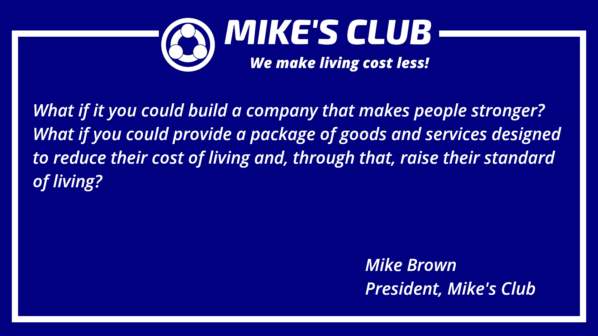 We built a company designed to make people stronger. We are the helping hand you can use to lift yourselves up, to make yourselves more secure. We don’t have all the answers yet, but we’re working on it. One day there will be a Mike’s Club store in every city in the country. And when that day comes, you’ll see some pretty powerful things happening!