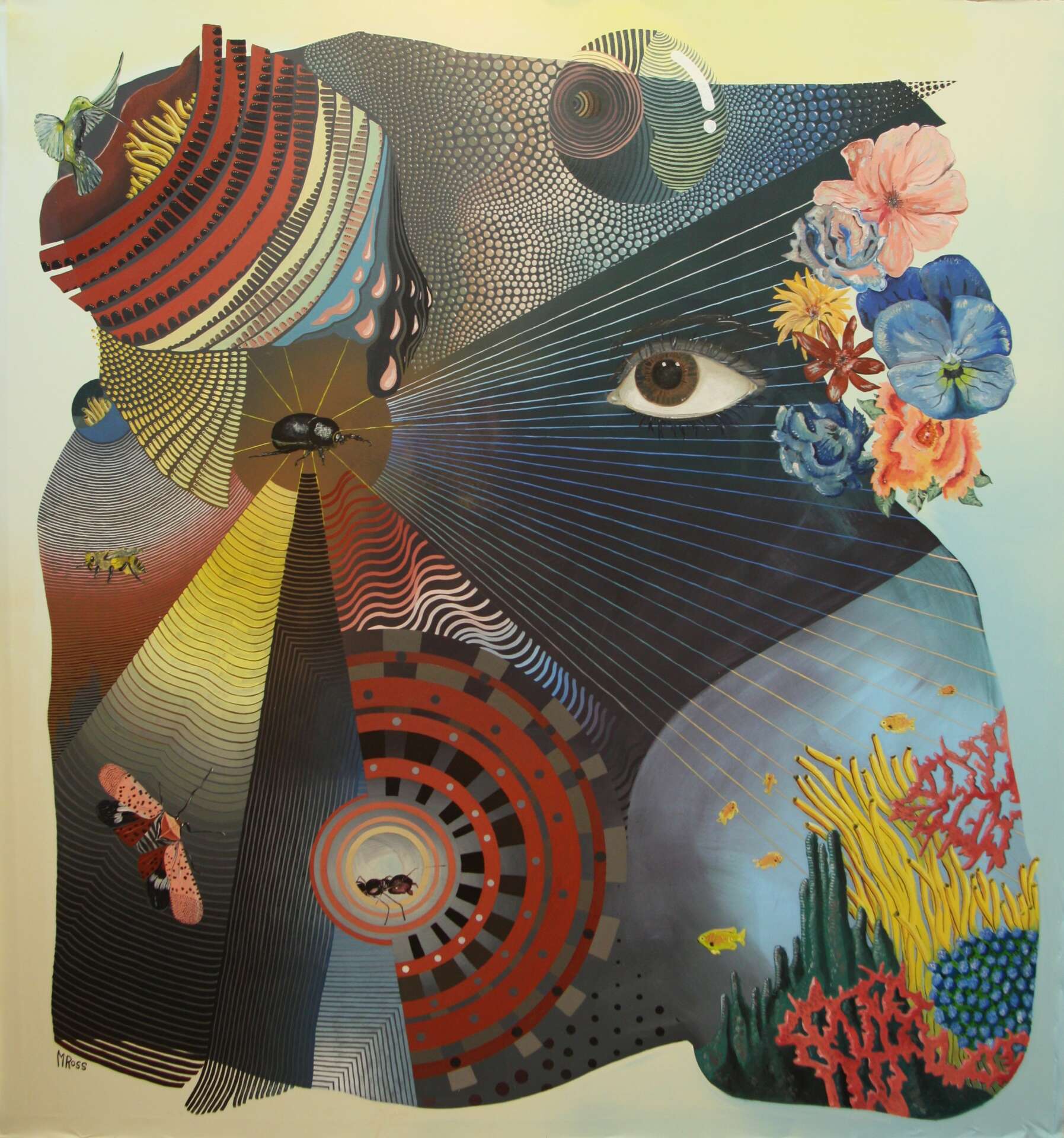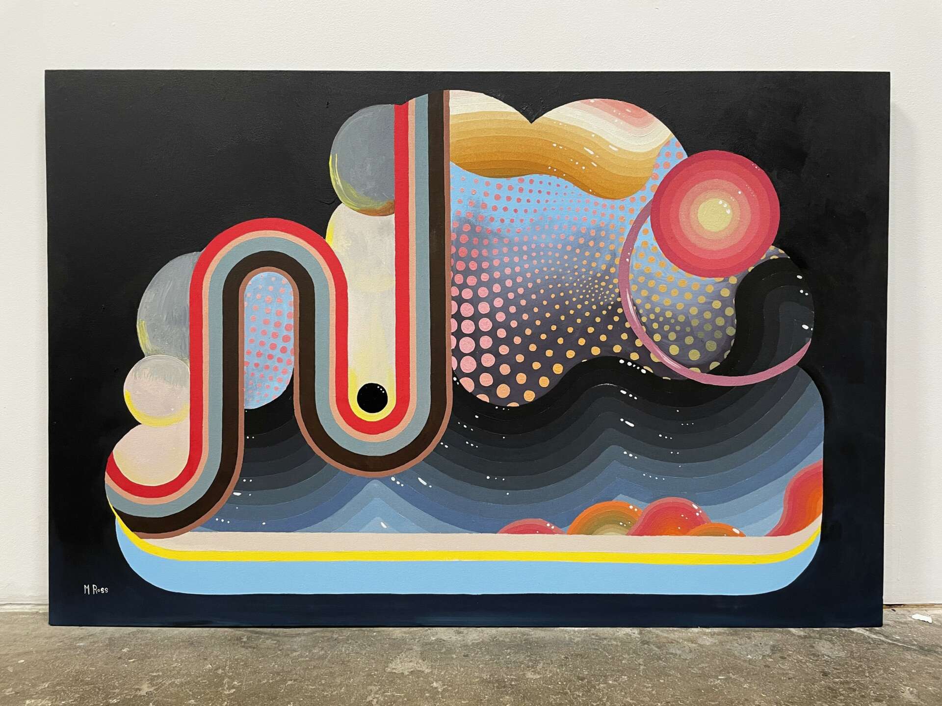 I’m primarily a painter, and an oil painter specifically, but I’m also a muralist and in the last year I’ve become a gallerist as well. I’ve also been known to spin records, but that’s a little bit away from the subject (though music is and always has been a driving influence in my work). My work deals with pattern and color gradients, and is mostly abstract – though there are elements of landscape and figures present in a lot of it as well. I love the human form, and I love faces – any painter who has spent any time with portraiture will tell you that every face is beautiful and they are a pure pleasure to paint. Just like Mondrian would always spend some time painting a vase of flowers amidst his practice of painting geometric blocks of color, I love painting people.