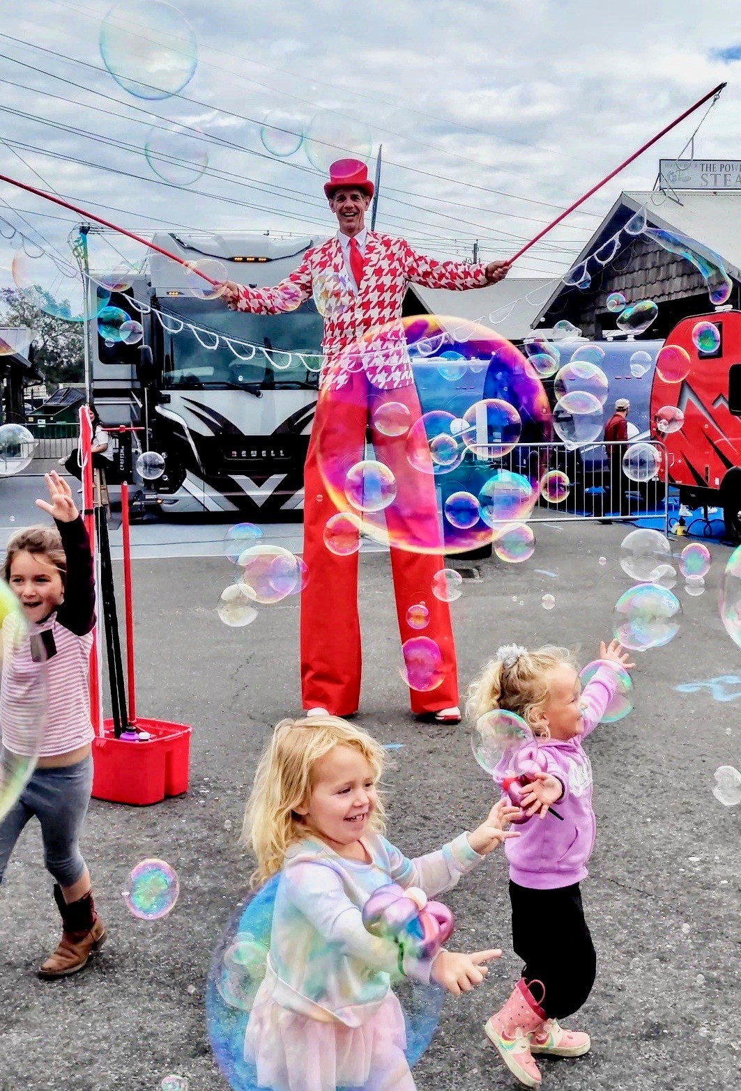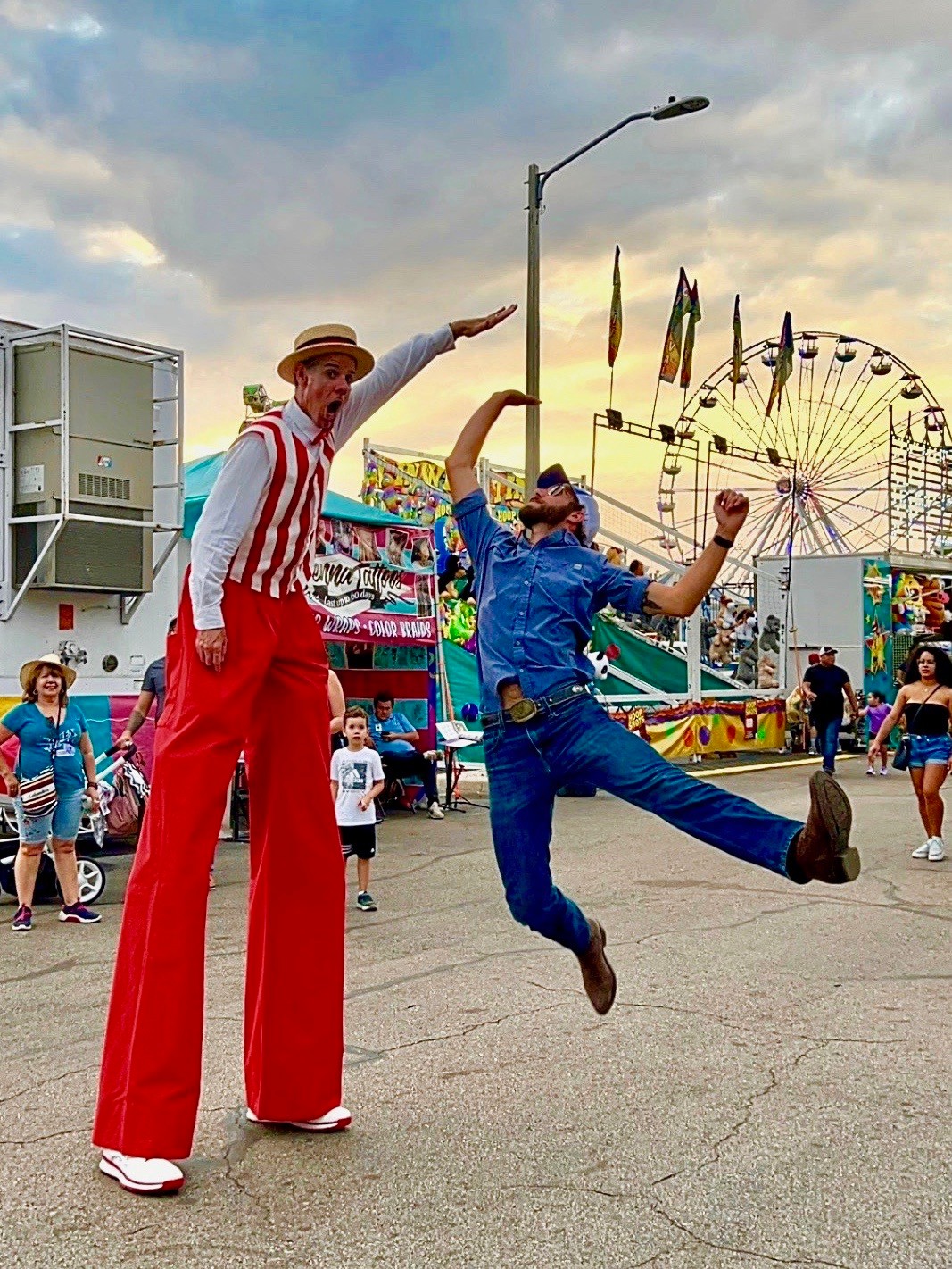 As a stilt walker, I provide strolling/atmosphere entertainment I’m able to continuously roam around & interact with people. I do things like pose for photos, dance, juggle, make giant soap bubbles, twist balloons, and give out the highest high-fives around… all while standing just over 9 feet tall in the air. I really know how to create that “WOW” factor, and provide guests with a memorable experience they’ll always treasure.