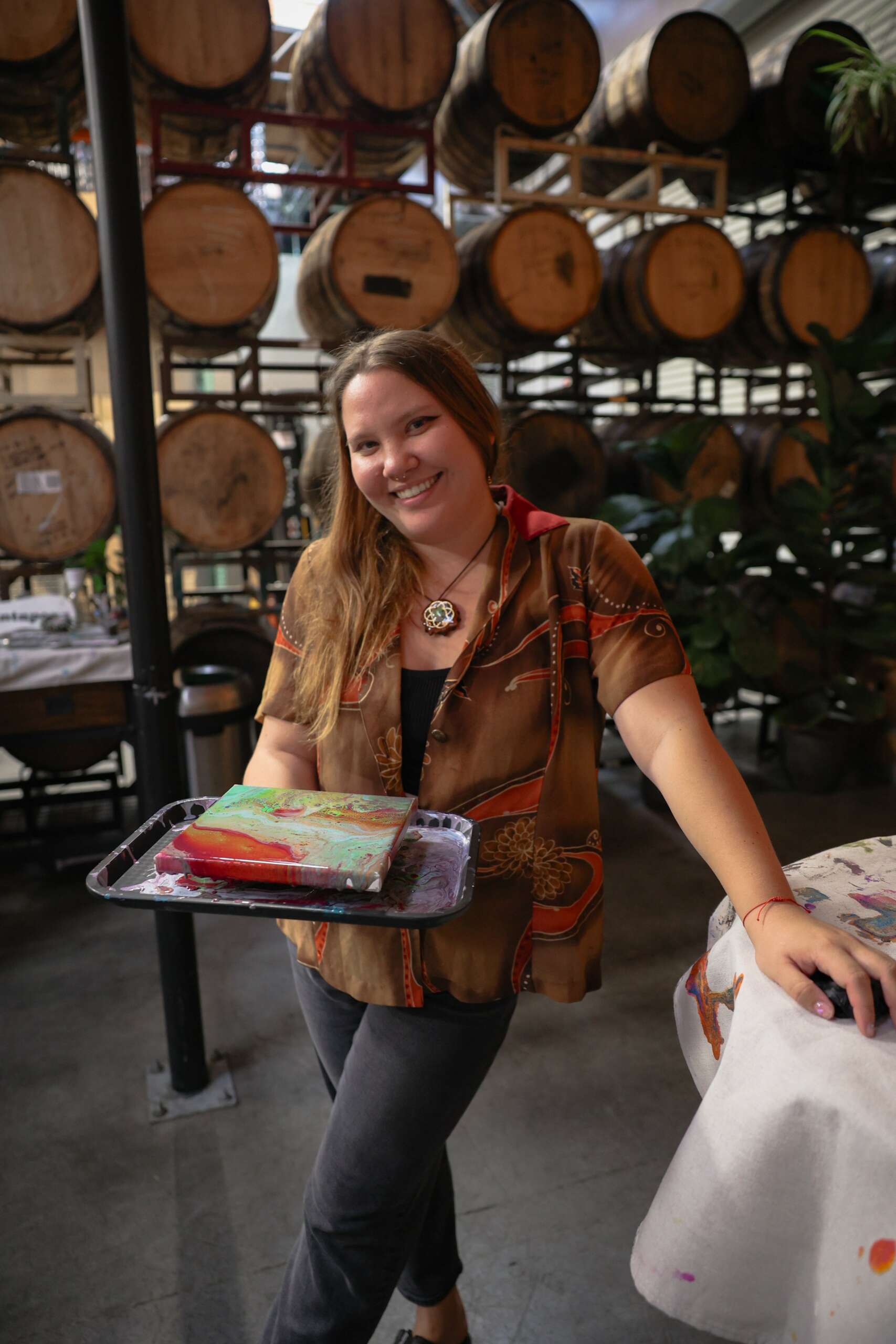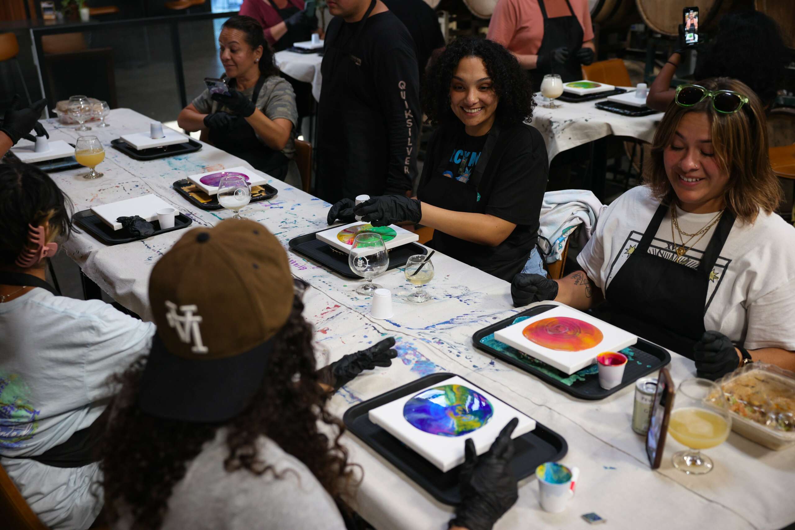 My name is Miranda Vibes and I’m a small business owner and art instructor of Paint and Pour, an unconventional paint and sip class that pops up monthly in Oceanside. I teach fluid acrylic art techniques like the #satisfying paint pouring videos you may see online.