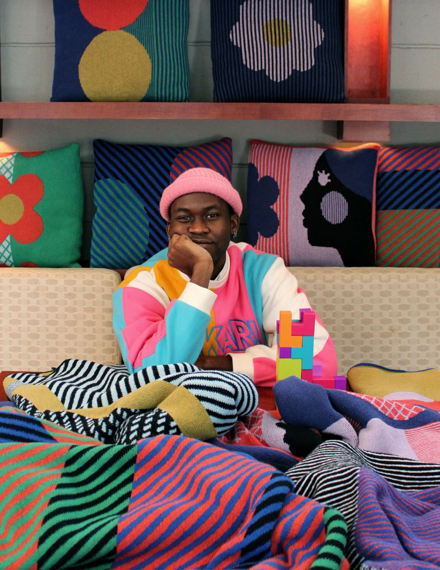 My studio practice is multifaceted, including textile design consulting for manufacturers, licensing my designs, commissioned art and installations as well as running my home textile company, DITTOHOUSE. In addition to extensive industry experience in woven, knit and printed textiles, I also delight in a joyful hand-weaving practice to tactilely experiment and improvise. These free and fun woven studies inform my other work greatly. The scale of my work varies from intimate- small, slowly hand woven textiles, to batch produced jacquard knit blankets, to large-scale, place-making pattern installations. No matter the process, I strive for my textile designs to have great visual activity. Oftentimes in my work, an intentional secondary pattern emerges, color combinations pulsate and use of lines create an optical reaction. When I achieve this visual response I am celebrating the rhythms of life and hopefully giving that gift to whoever looks at my textiles!