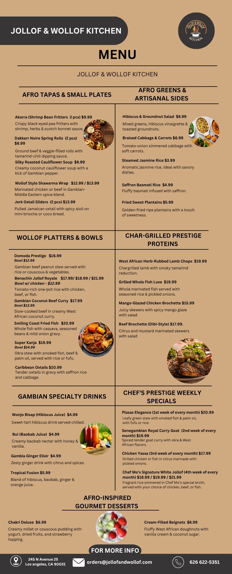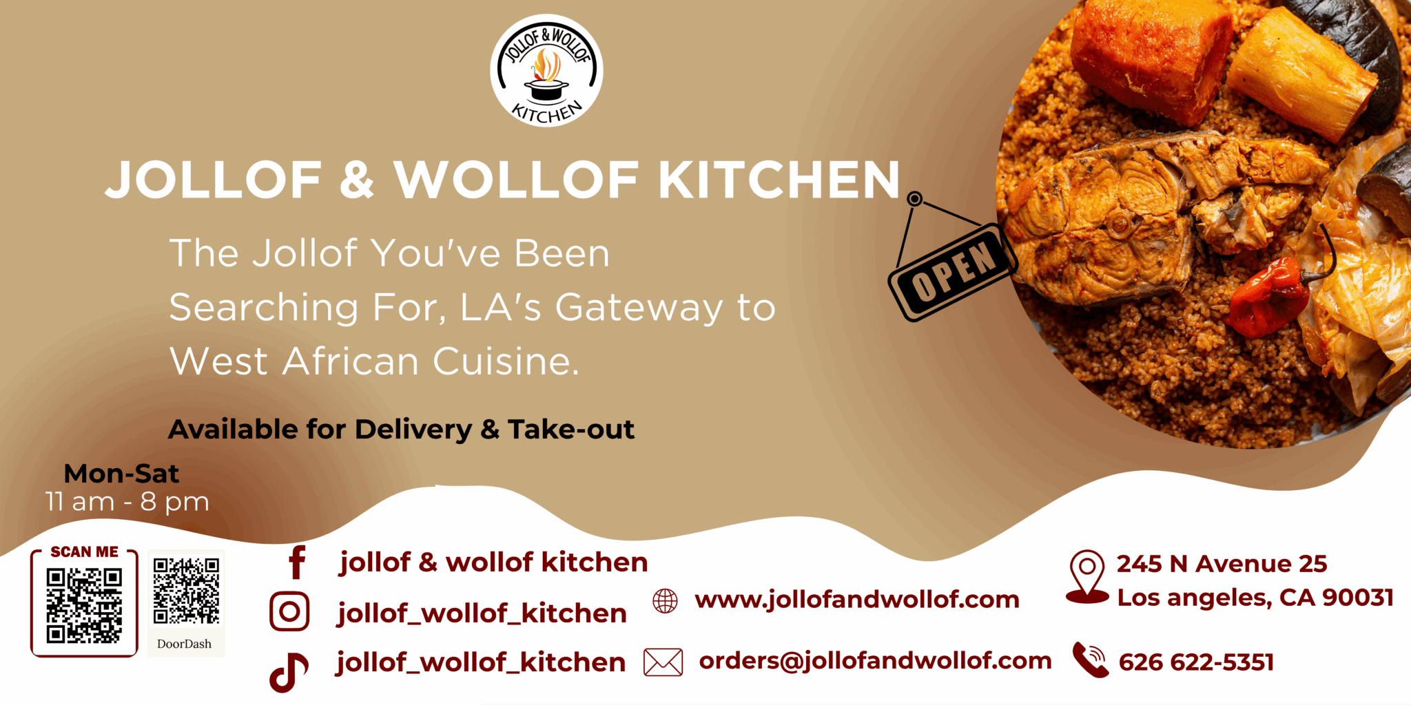 Jollof & Wollof Kitchen is the culmination of that journey. We specialize in authentic Wolof and West African cuisine, elevated with the techniques and presentation of fine dining. Our menu is rooted in tradition but reimagined to tell my personal story: the journey from Gambia to the UK to Los Angeles. On top of our daily pick-up/delivery menu, we provide catering, private dining, and curated culinary experiences that do more than feed people, they immerse them in a cultural narrative.