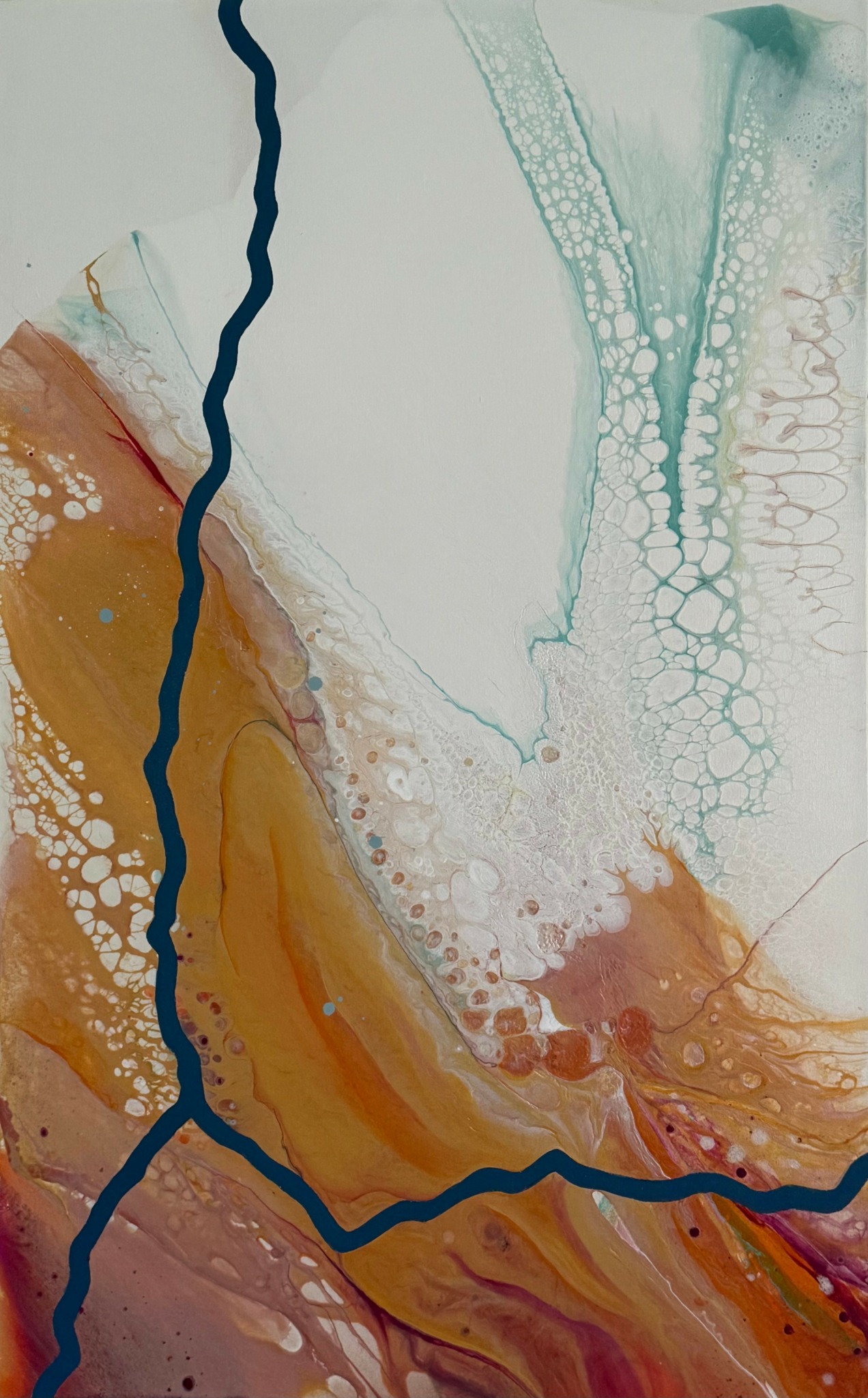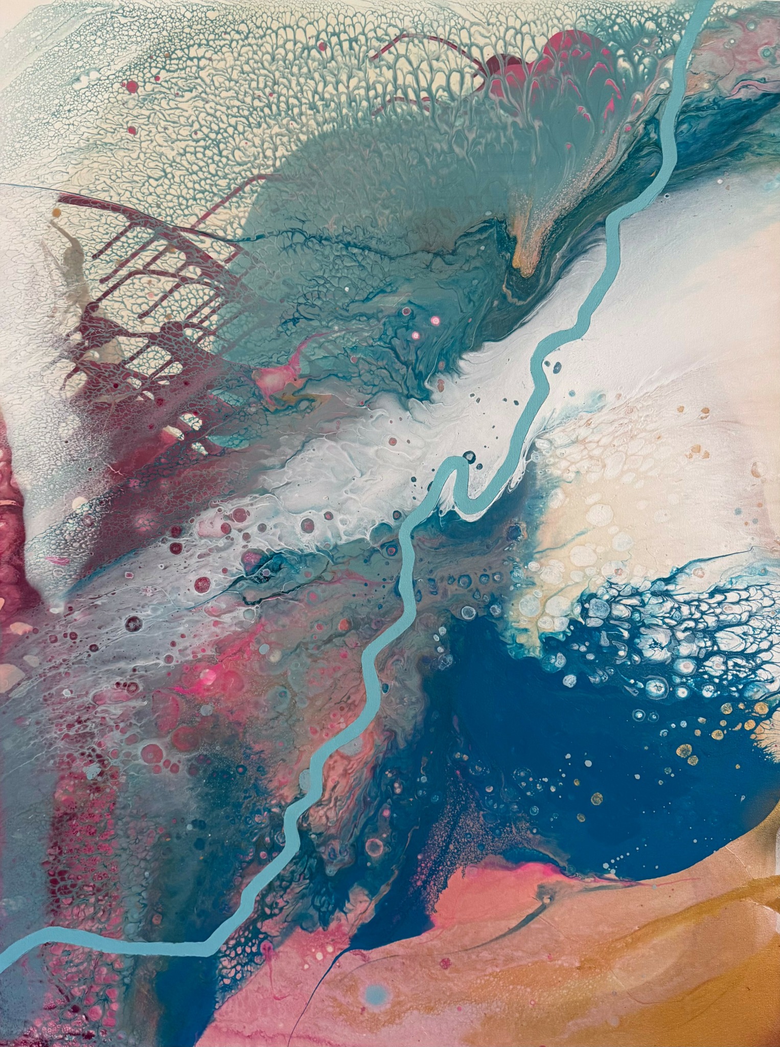 My early work was abstract and figurative, even though I hadn’t formally studied abstraction. Years later, after time away from the studio, I began exploring fluid art techniques, intrigued by how artists use specific recipes to create controlled chaos. I experimented, adapted methods, and began working large-scale again, developing a visual language that felt uniquely mine. When studio renovations displaced me this past summer, I pivoted to oil landscape painting, a slower, grounding practice that kept me tethered to making and my natural surroundings.