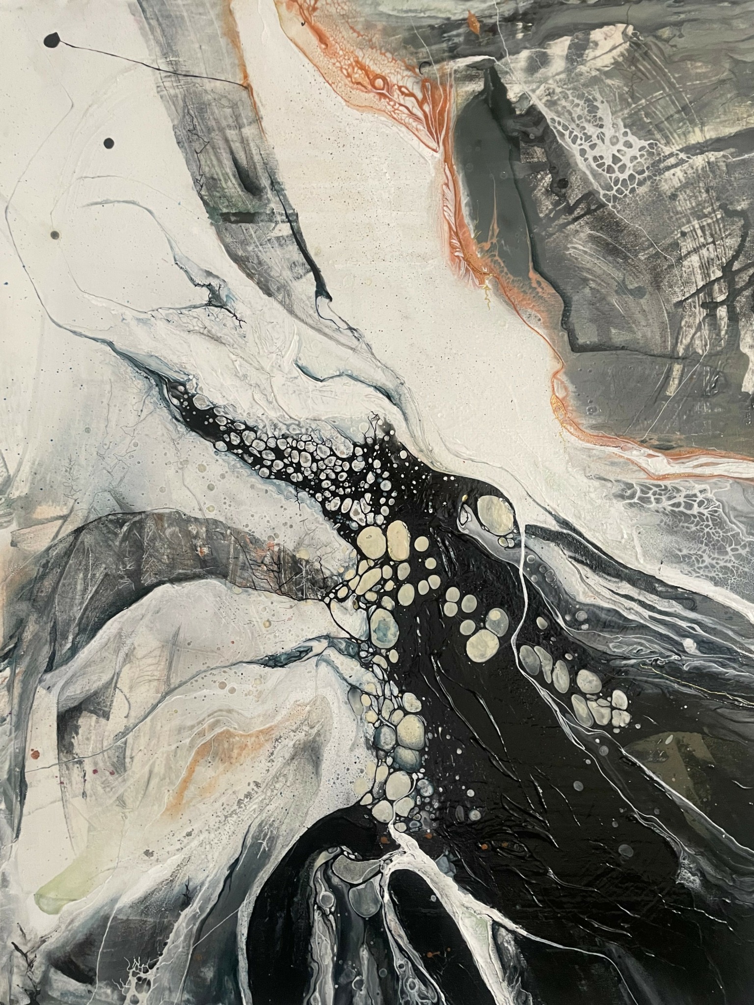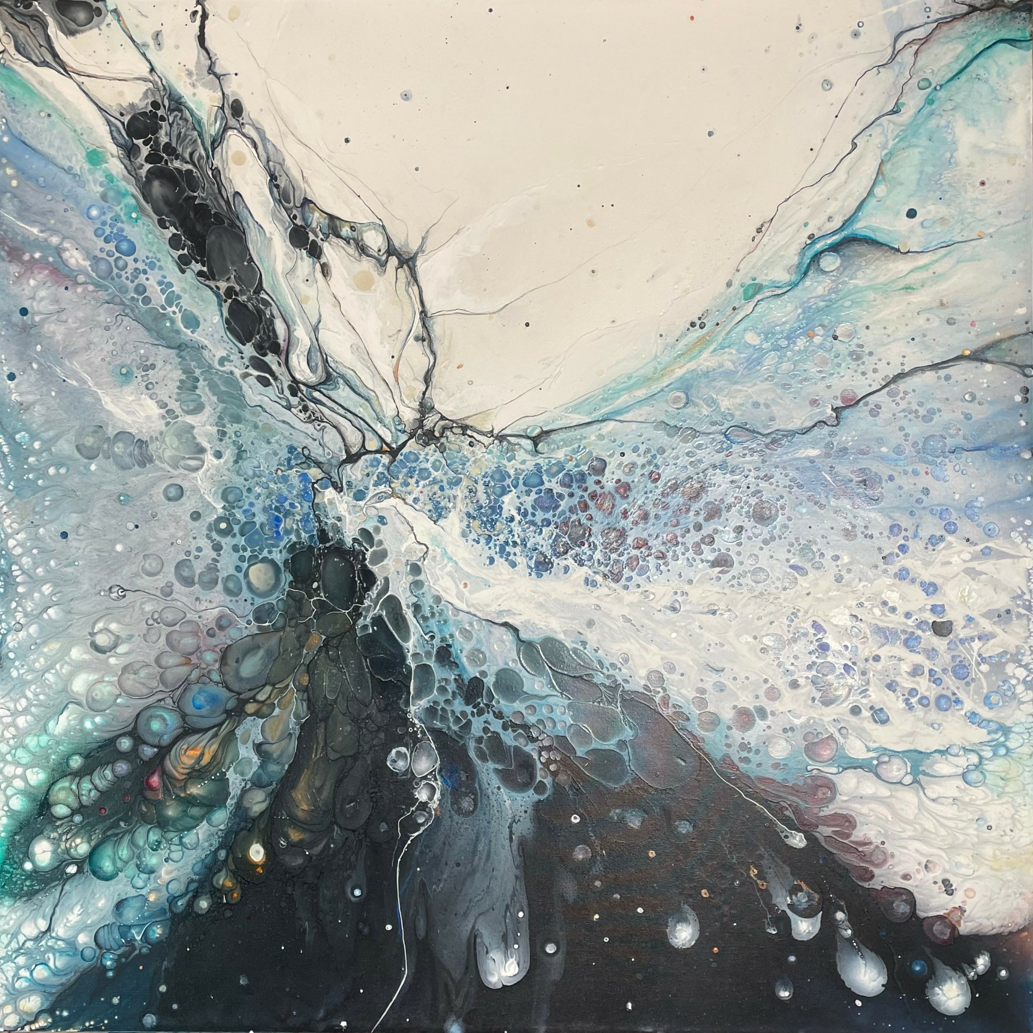 Now, as part of the sandwich generation (ie, caring for children and an aging parent), I find that time and energy are often diverted elsewhere. I’ve learned this though – I can’t pour from an empty cup, and painting fills me. It tethers me to myself, and in that reconnection, I become more capable of showing up for others. I continue to evolve, and not just as an artist, but as a person learning to listen more deeply to what needs to be expressed and how. In this way, the work unfolds naturally, changing as life does. The process itself teaches me, and I trust that each piece is part of something larger than just the moment it was made. I’m grateful to be on this adventurous artistic path, learning every step of the way.