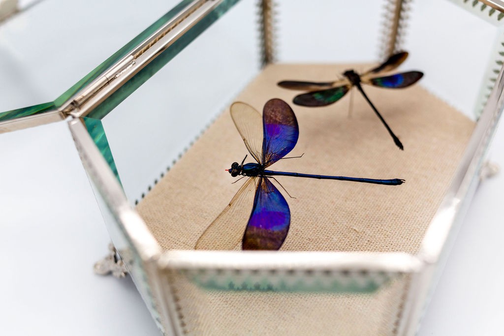 My husband and I started this business together in April of 2021. Micah, my husband pinned a butterfly specimen for me as a gift, and we enjoyed it so much that we decided to try it at our local farmers market. He’s really the muscle behind everything we do. We noticed that most insect taxidermy offered to the public has a very dark, gothic style, and wanted to offer artwork that was very modern, and style fluid. The public generally loves insects, and we found a way to provide artwork to anyone, whether their home is mid century modern, traditional, farmhouse, etc. The insects speak for themselves, and don’t need any addtional adornment, in my opinion. We certainly make custom commission for people, with their style in mind though!