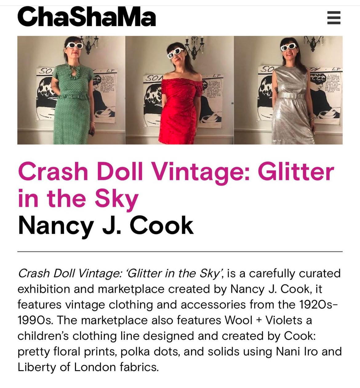 The woman behind the glasses is Nancy Cook. Vintage Seller, Stylist, Photo Editor, DJ, Talent Booker, Artist, Musician, Curator and Designer.