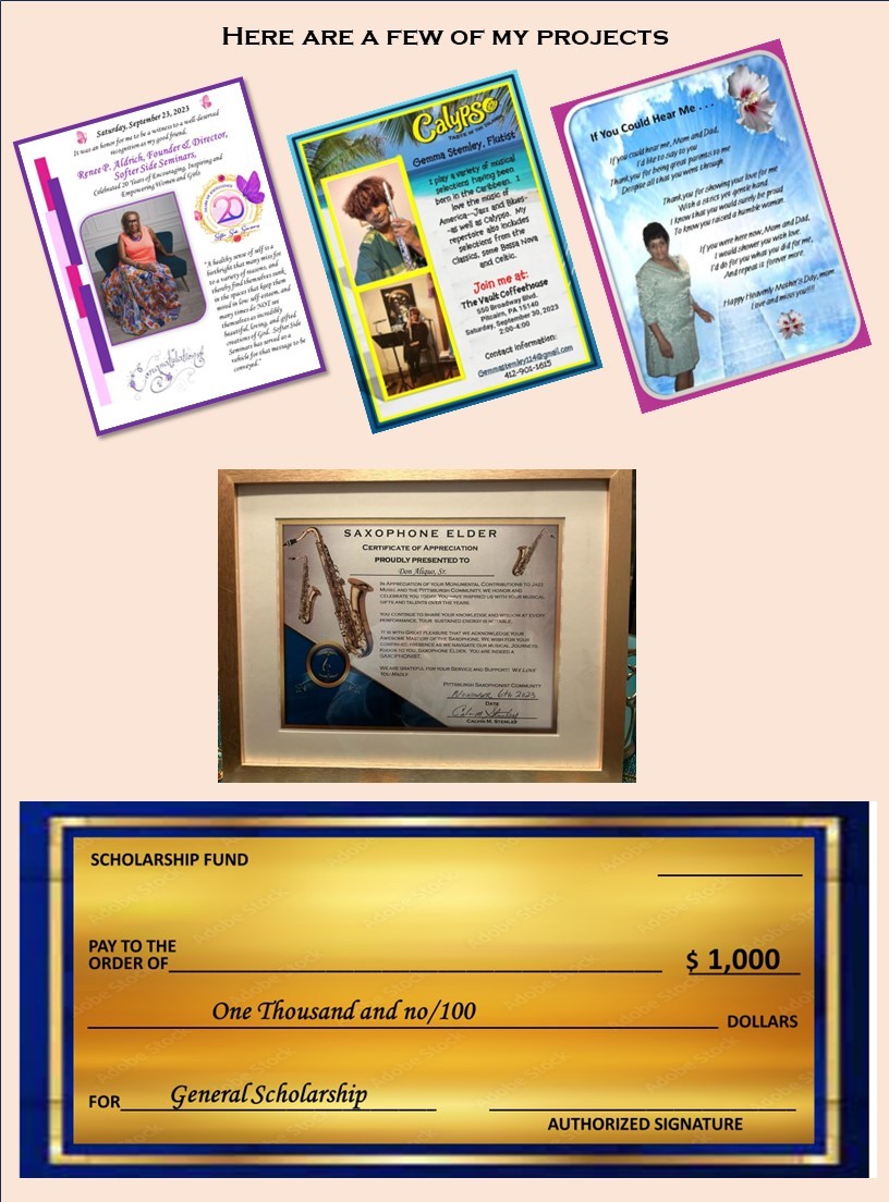 I offer the creation of personalized business and entertainment flyers, sympathy, birthday, holiday and specialty cards, and funeral and class reunion programs, just to name a few. I also take specialty requests. I prepared a 115 slide PowerPoint presentation for a family reunion, a 48”x24” simulated check for a scholarship presentation at a high school assembly, and several musician award recognition certificates with gold frames. The latest and most unusual request I received was to “bling up” a walker for a lady having a knee replacement. She figured if she had to use a walker during her recovery, she wanted to look stylish and unique. So, I bought several sheets of self-sticking rhinestones and covered the walker. She was well-pleased.