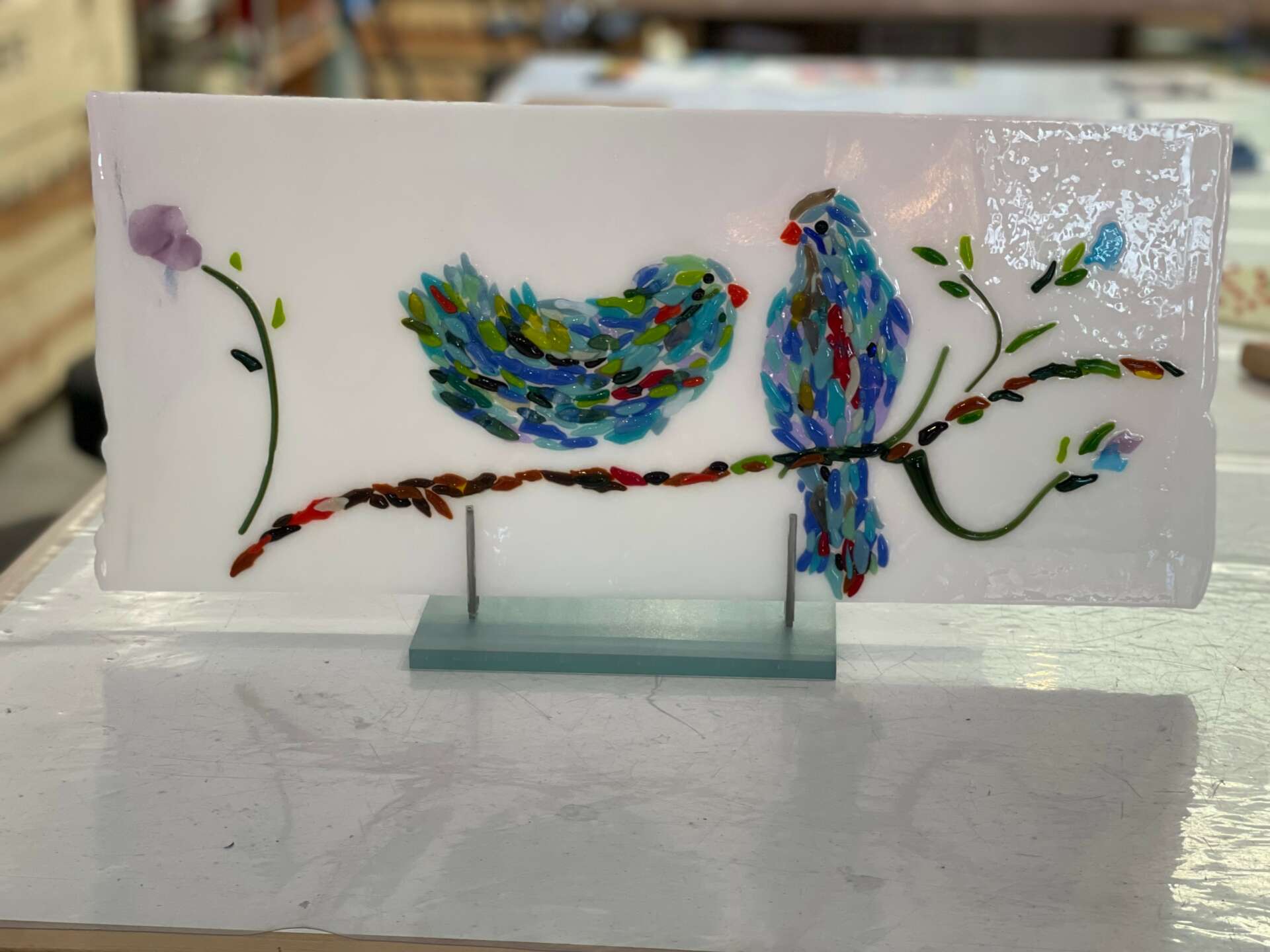 What is fused glass? It’s taking pieces of glass and arranging them in a design that can be abstract, a memory, or a detailed design. All made in a comfortable environment, unlike glass blowing which is front of a 2,000 degree blow hole and you can’t stop through the process.