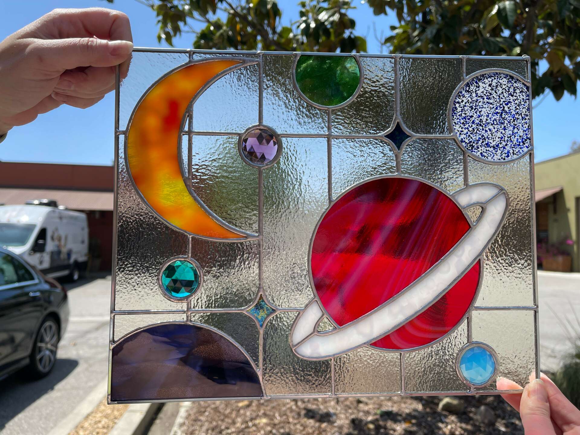 I didn’t think I had a creative bone in my body! I loved coloring as a child, but as I grew up, nothing felt comfortable or made me excited. My folks are in a local assisted living facility and Mom was taking classes in fused glass. I wanted to have something we could share so I took a course. I admit I had a lot of self doubt in doing the class, but I knew Mom doesn’t care if I’m any good at is, she’ll just appreciate my desire to share it with her. After the first class which I liked, we had a birthday party for my Mom and some of her friends at the assisted living facility at a second studio. The teacher was so warm, the studio had so much energy, it all resonated with me and after that party, I was hooked on fused glass!