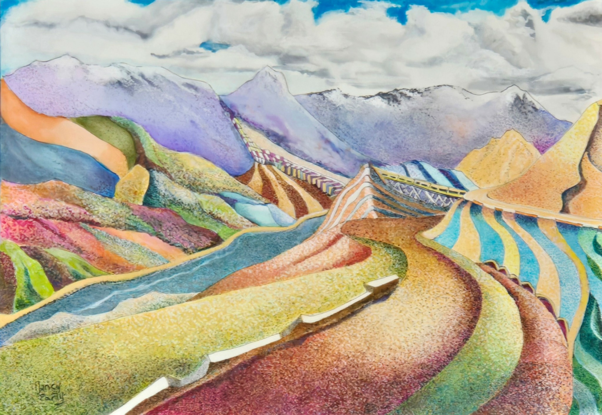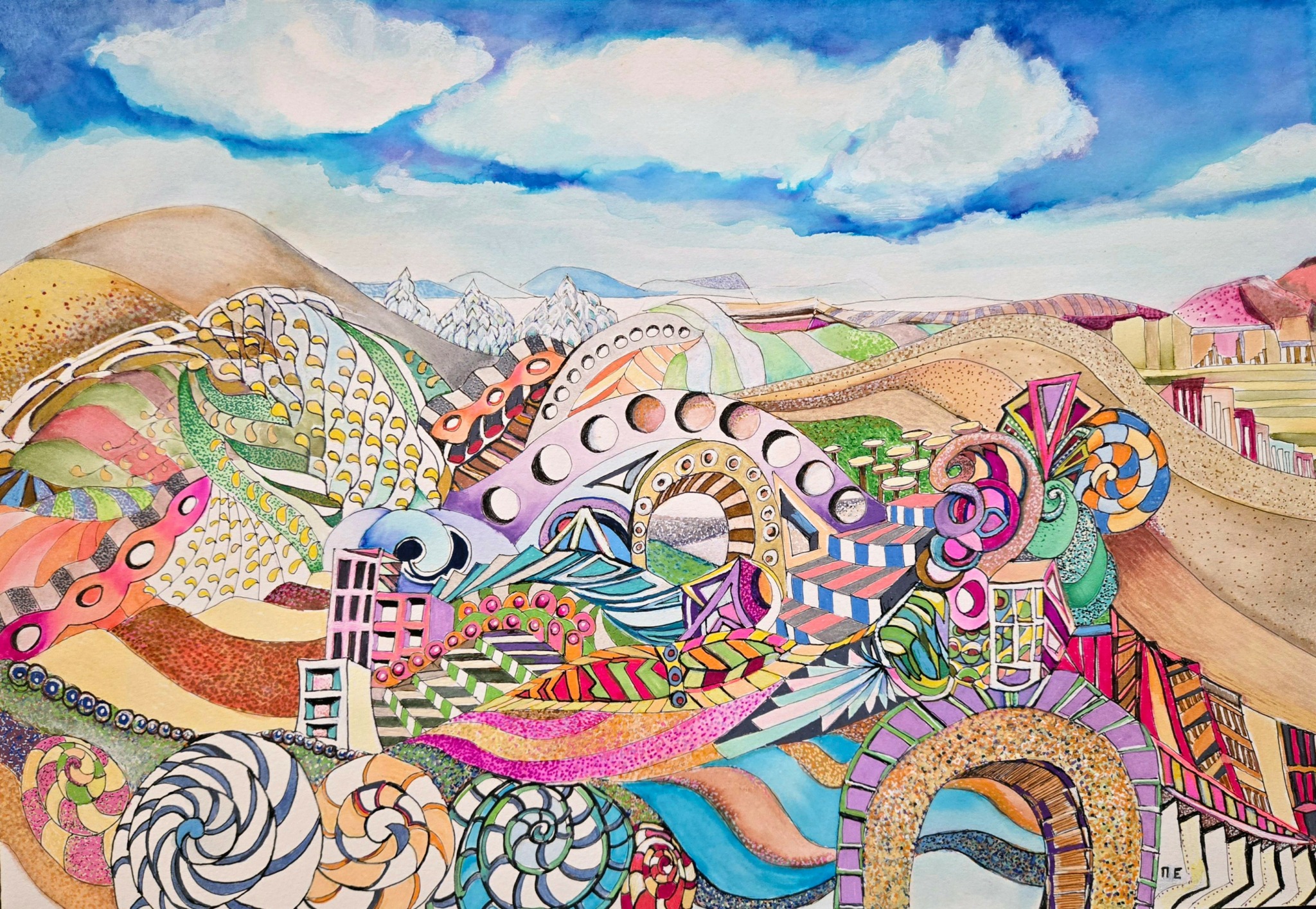 While I jump back and forth in my styles and series, I am currently working a series of fantasy underwater and landscape scenes in a pointillism style using acrylic paint pens that is colorful and playful. My purpose in this series, is to bring attention to climate change, the political climate, and the human condition using subtle symbology that isn’t always immediately apparent.