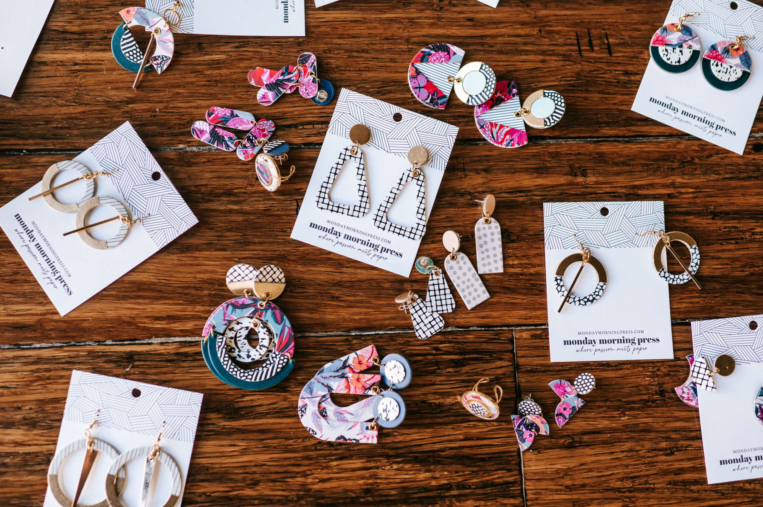 I started Monday Morning Press in 2015 as a custom letterpress stationery business. My focus was on luxury wedding invitations at the time. In 2019 I had the idea to use some of the beautiful papers I had around the studio to try making earrings. I started playing with different paper types, letterpress textures and colors to design my first earring styles. I was completely hooked and shifted my focus to paper jewelry design! Through a lot of trial and error over several years, I developed my own systems and processes for making the earrings.