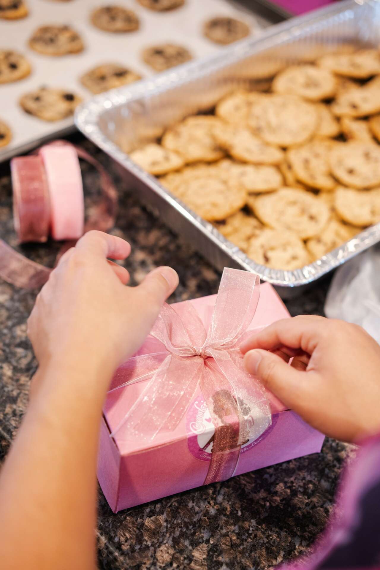 Seriously if I have an idea for Cookie Nookie, he finds a way to make it a reality. For example, our packaging. He found the pretty pink boxes I wanted, the pink food grade tissue I wanted. I wanted each box wrapped with a pretty pink bow and not only did he find the ribbon, HE TIES THE BOWS! I discovered early on that he ties a waaay better bow that I do!