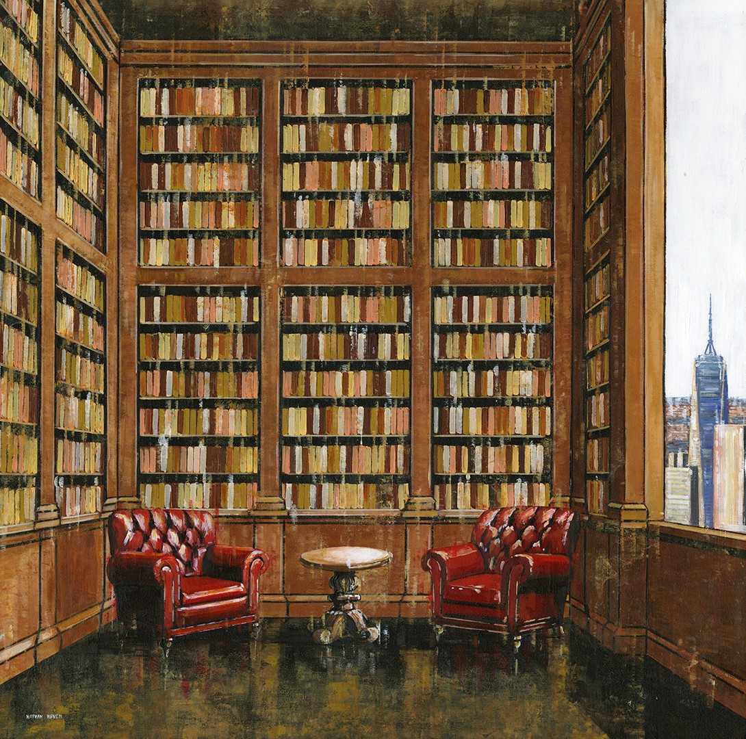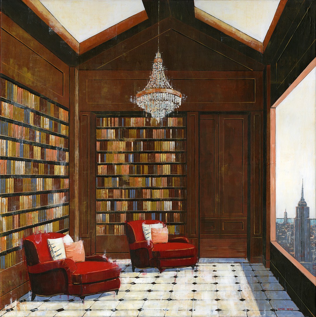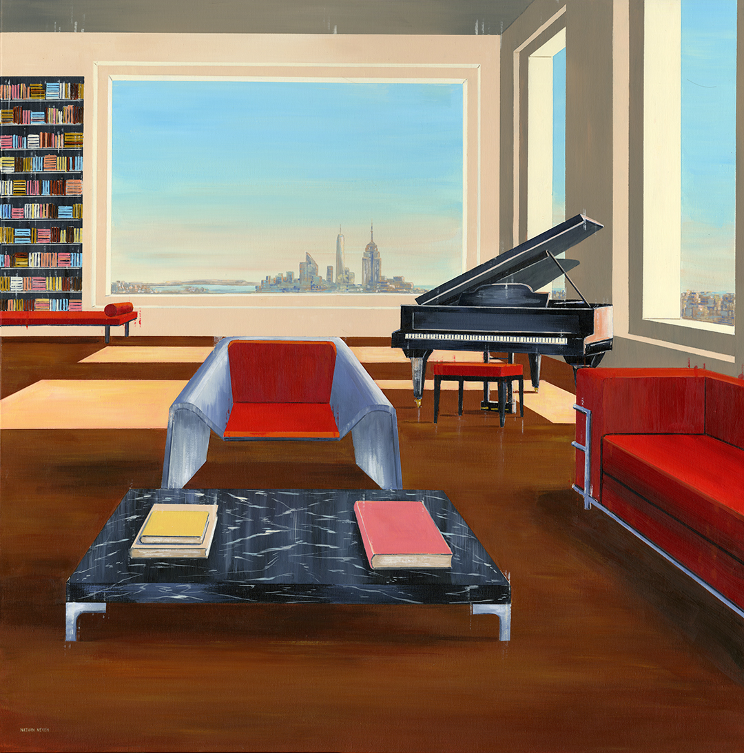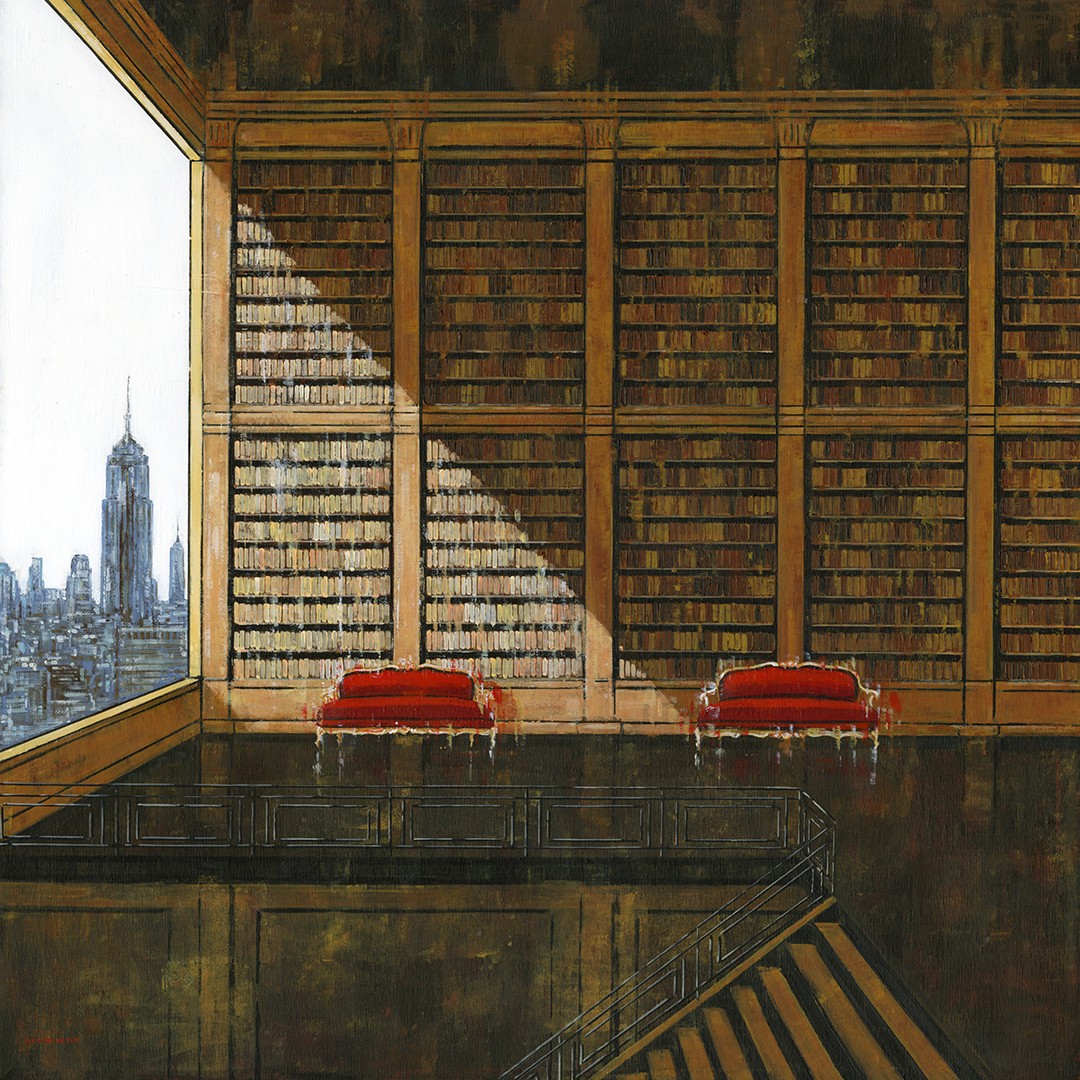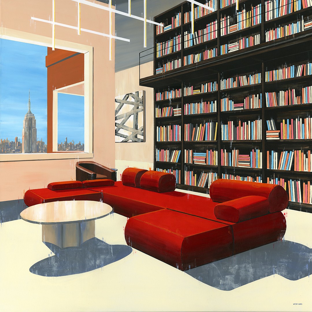 A unique feature of my work is the seamless integration of interior and exterior space. Large windows and open arches reveal sweeping cityscapes that blur the boundaries between the comfortable and the unknown, from the towering Empire State Building to the twinkling lights of the city in the distance. This juxtaposition weaves a subtle narrative. The interior is quiet and introspective, while the city outside the window pulses with movement, energy and possibility.