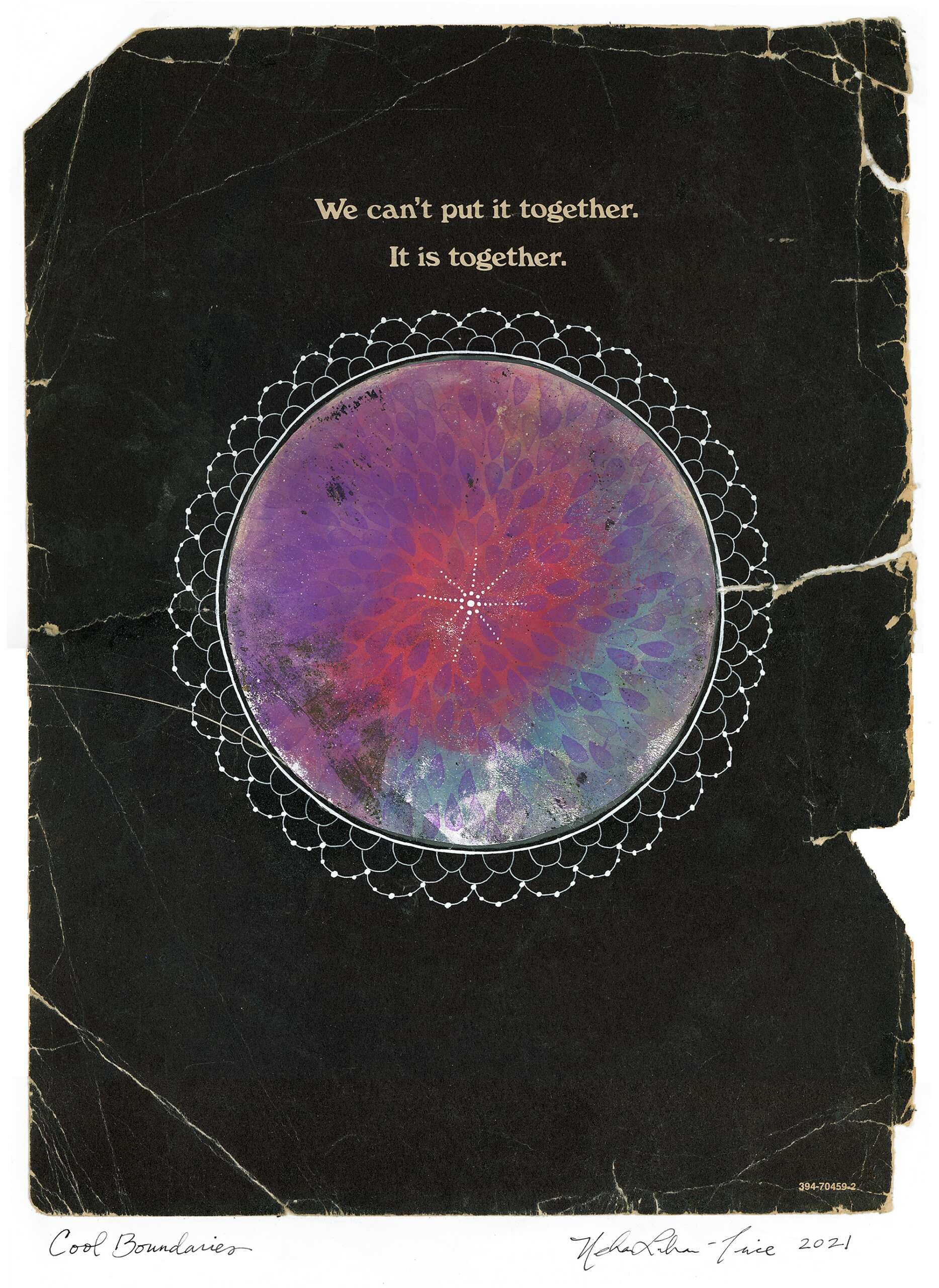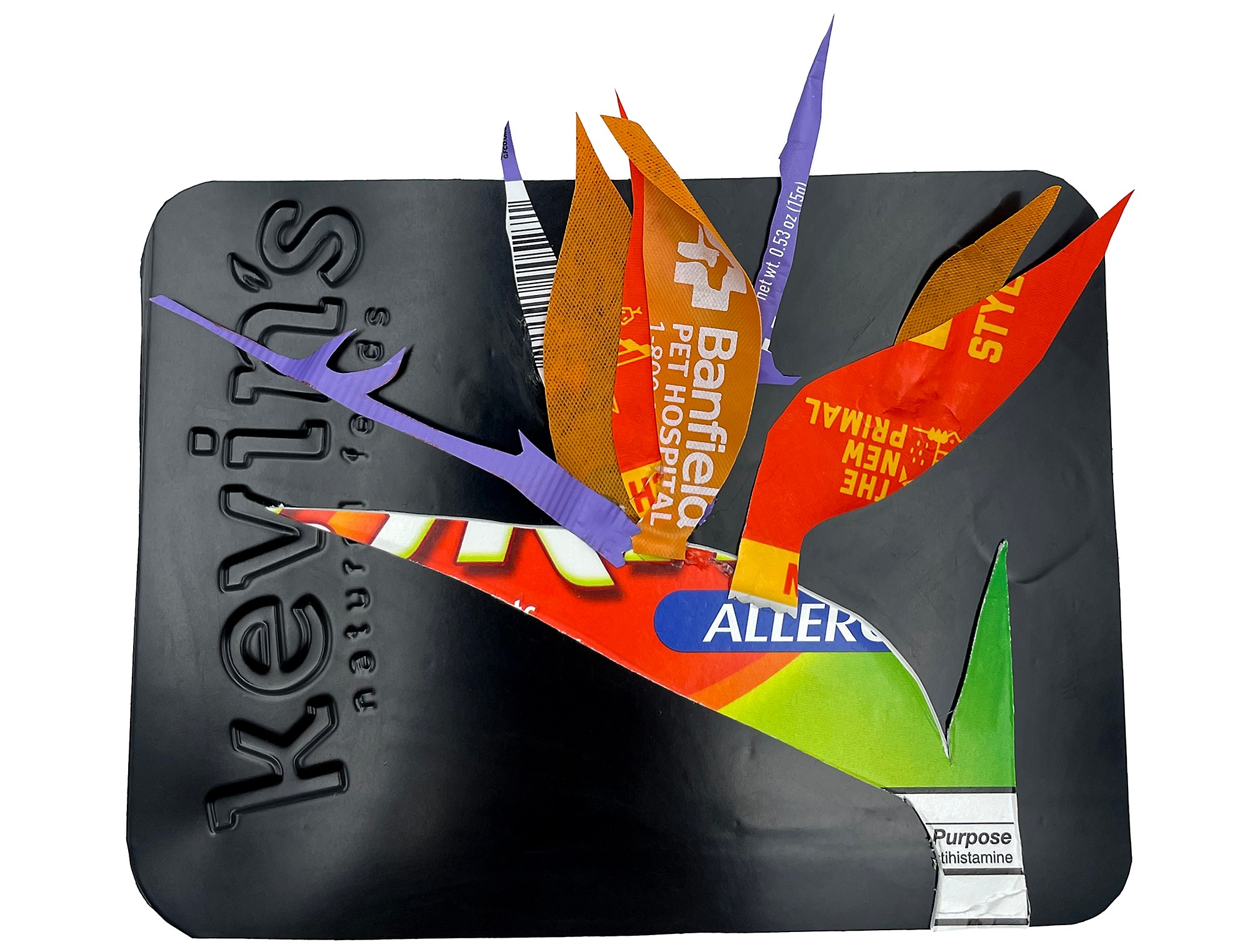 Armed with a small collection I’d already started at home, I signed up for the challenge and went on a journey of discovery through each day’s exercise. It is alarming in our disposable culture just how many of the items we consume are wrapped or packaged in non-recyclable material. Every night I’d look at the “art supplies” I had to work with for the day and, at first, found myself rather frustrated. But then I started challenging myself by experimenting with heat, adhesives I’d never tried before, a stapler, and even needle and thread. Eventually I reached the end of the month and was surprised that not only had I completed 30 days of prompts, but that my “let’s just try and see what happens” approach resulted in some desirable results. Everything I made was glued onto cardboard from the recycling bin and (**bonus**) I saved a good many plastic items from polluting the soil in my neighborhood. It’s important to me that my work brings awareness to that which we do not always have time to notice in our busy lives. Be it a red solo cup dangling from a tree branch or a colorful candy wrapper blowing around in the gutter, we have the power to wake up from auto-pilot status, notice the world around us, and consider how we may take better care of the planet. I’m looking forward to incorporating more plastics and paper into my work and hope we can take more companies to task for their unethical practices and irreverence for future generations.