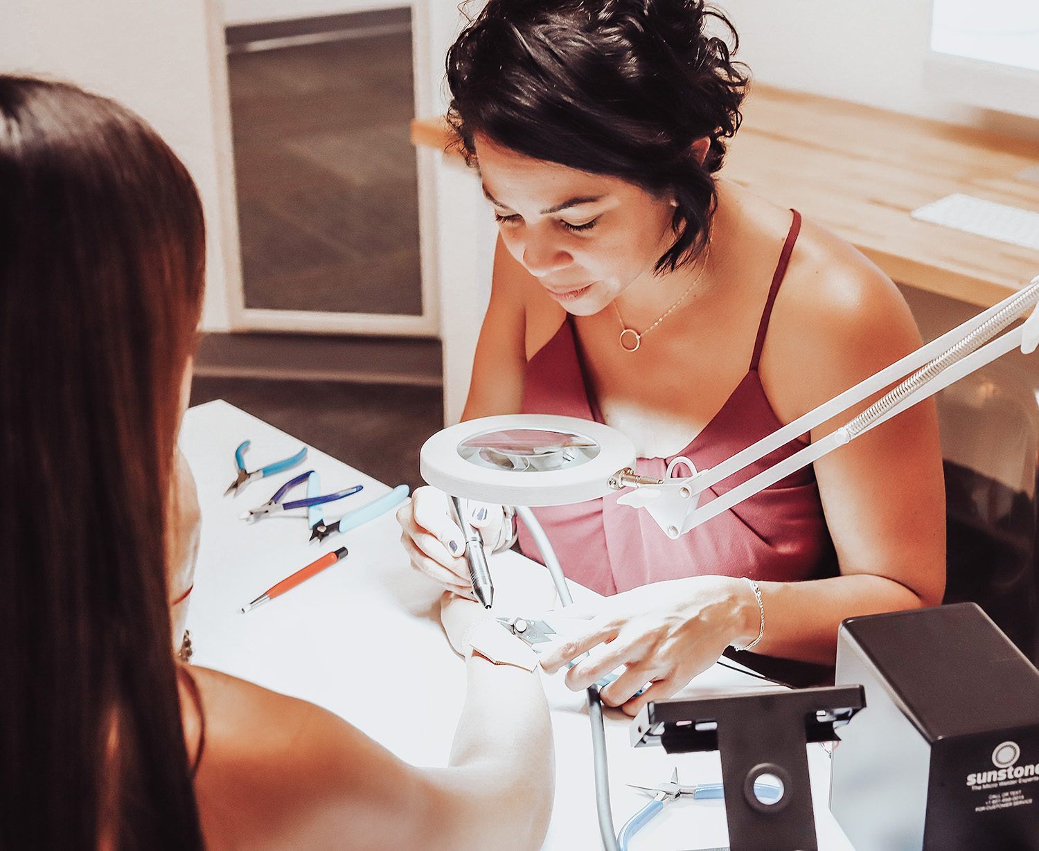 In my studio located in Wesley Chapel, FL., I process orders placed from all over the world through both my Etsy shop and Shopify Shop. Everything is personalized and handmade by me, carefully packaged and ready for gift-giving. Beyond the online realm, I also offer a permanent jewelry experience service in-studio, at markets, and at private events such as birthday parties, weddings, girl’s nights out, corporate holiday parties, and networking events. This unique experience allows people to bond over jewelry they can customize and match with those who mean the most to them.