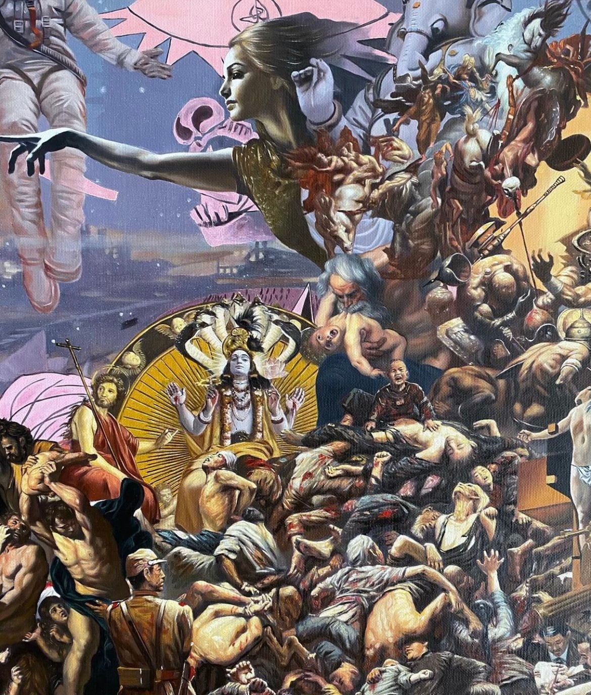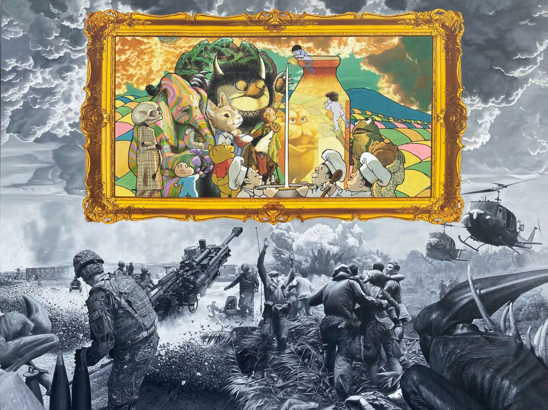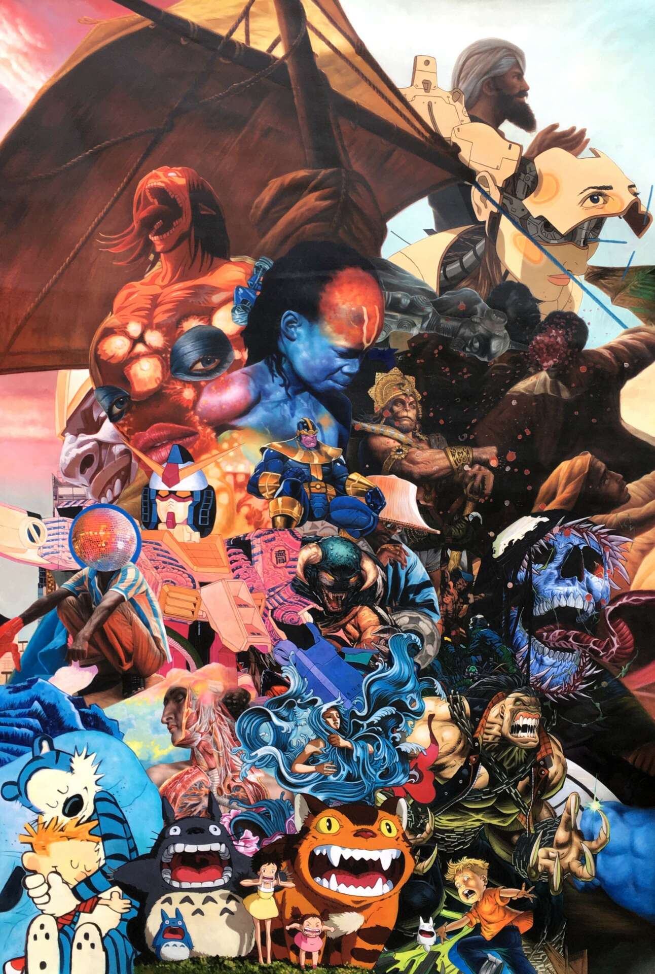 I’m 41 years old now and I started as a professional fine artist at age 27. That’s somewhat of a late age and my lack of experience and connections have made art a difficult path. My first works were drawing but I quickly moved into sculptural pieces with materials that ranged from layered etched glass to cast iron and bronze to wood and granite. From there I transitioned to oil painting, making massive works that consisted of borrowing only from other artists. My compositions are filled with famous paintings, movies, memes, cartoons or whatever else I feel like.
