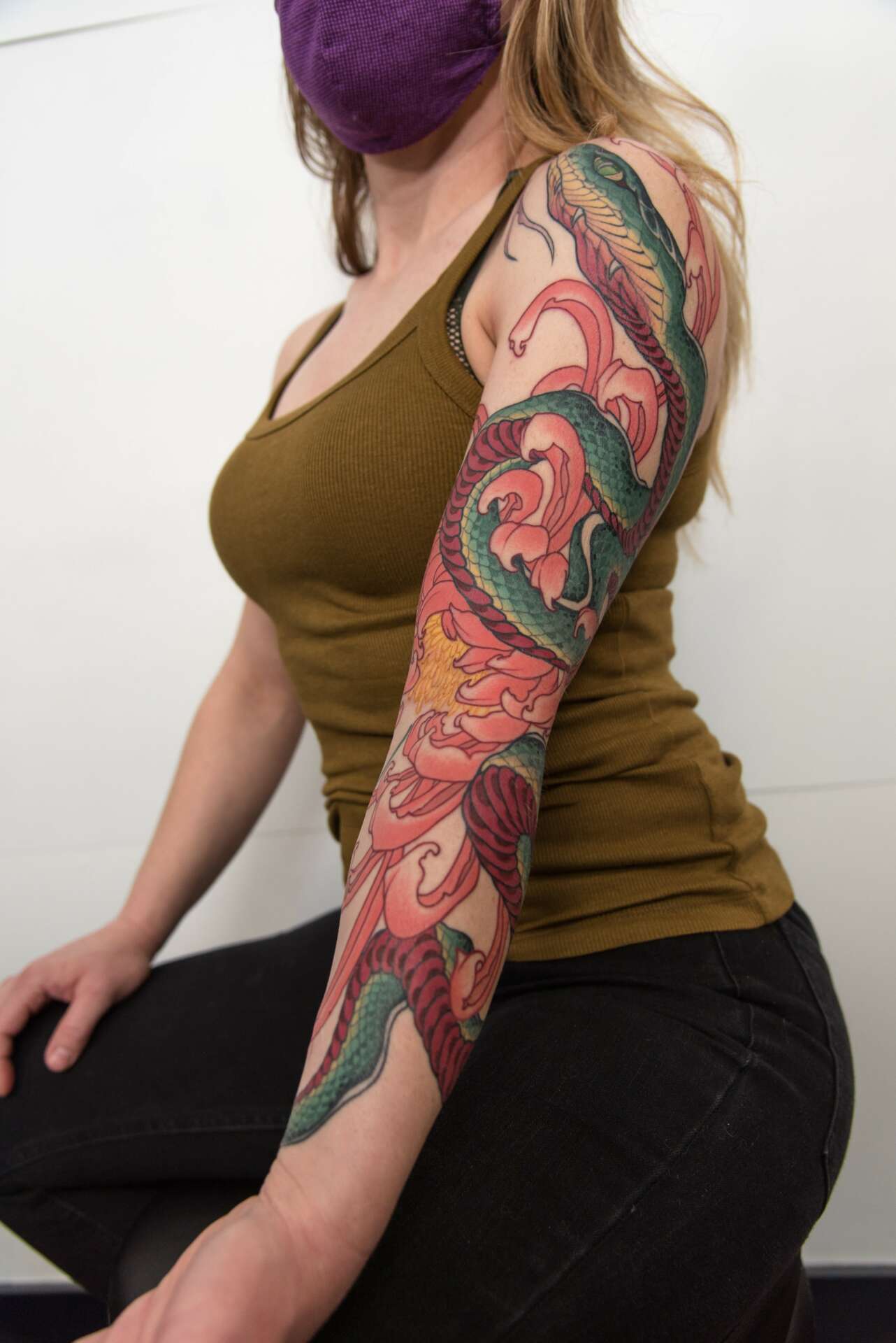 I’m most proud of my clients who trust me to do large scaled work on them, such as back pieces/body suits. It’s a humbling feeling to know that clients trust me to be able to work with them with their most valuable canvas: their skin. To know that I can create something lifelong that will bring them joy is an enormous amount of pressure for me, but one that brings me great joy. I love to work my mind when creating a design that can implement diverse subject matters, variety of colours, all into one that tell a story for them that they will love and cherish.