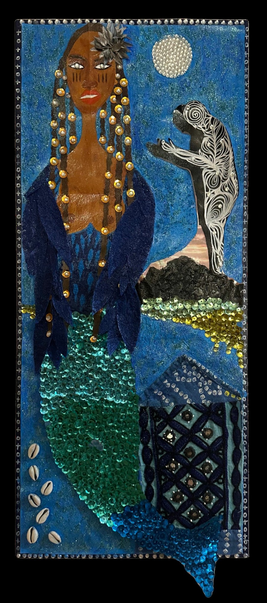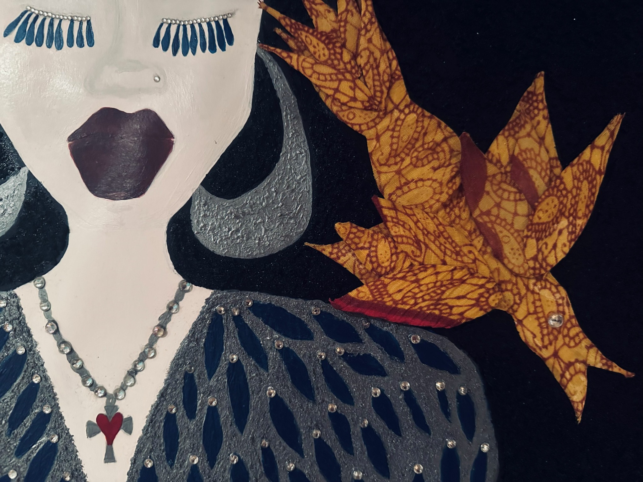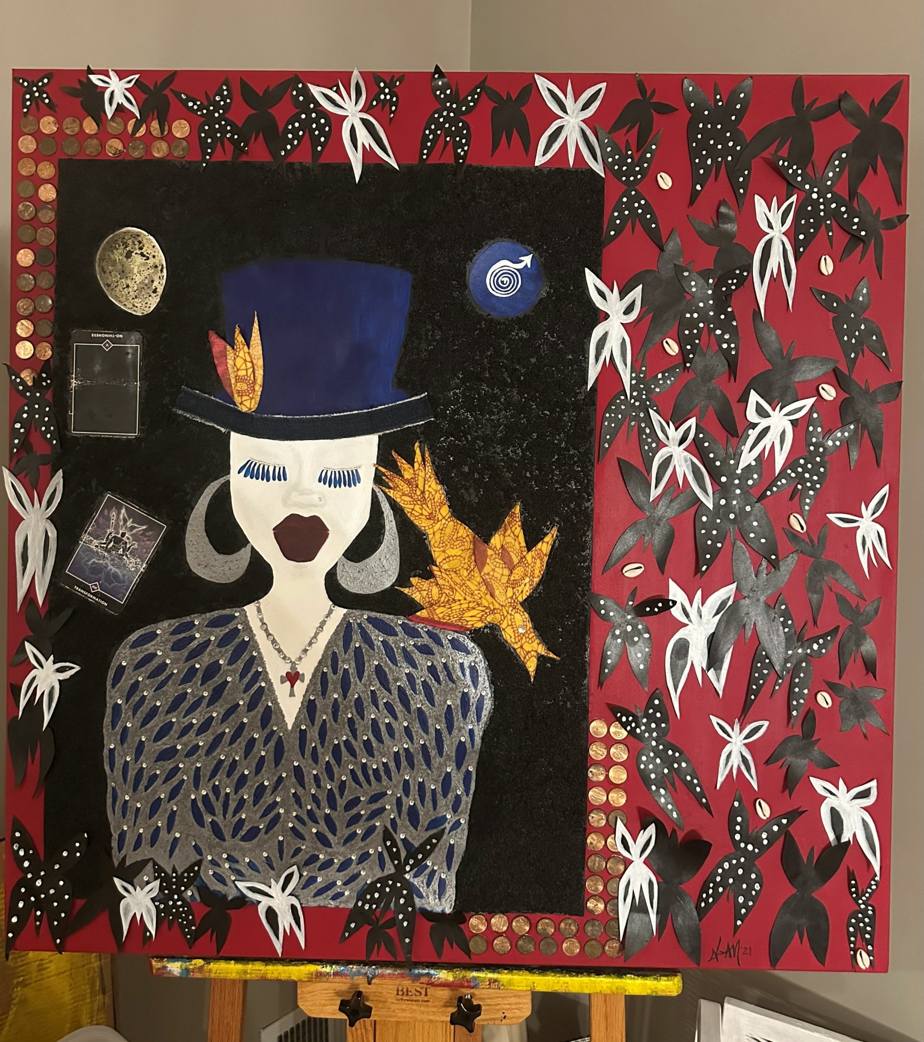 In 2019 I was invited to join a cohort of artists in a program in NYC stewarded by my good friend, artist and therapist Tanisha Christie. Through that program, artists were able to rent studio space in the South Bronx at a discounted rate. I planned to take some time to build an environment to perform inside. But the time there intersected with the pandemic. I had to bring everything home. And it was during that time that I really came into the understanding of how making this visual art is devotional gris gris for me. I am making talismans. I needed to make these prayers, these testimonies to spirit. I need these manifestations of faith urgently during those months of the quarantine. I lost a few people close to me. Some became ancestors. Others just had to go away, or I did. I began committing to larger pieces. I began letting go. I just want to keep making, growing, discovering. It’s medicine for me. It’s also another way of exploring story, narrative, character, texture, tone. I appreciate a process that has different registers. And I feel a sense of immediacy about the importance of building connection through story now. I think our humanity depends on it. The earth will go on. It will do what it needs to do to survive. But we have a lot to shed as human beings on this planet. I believe art is a way to do that. We can find new ways to relate. We can heal. We must critique the powers that seek to drown us out. We can experience deep pleasure and joy.