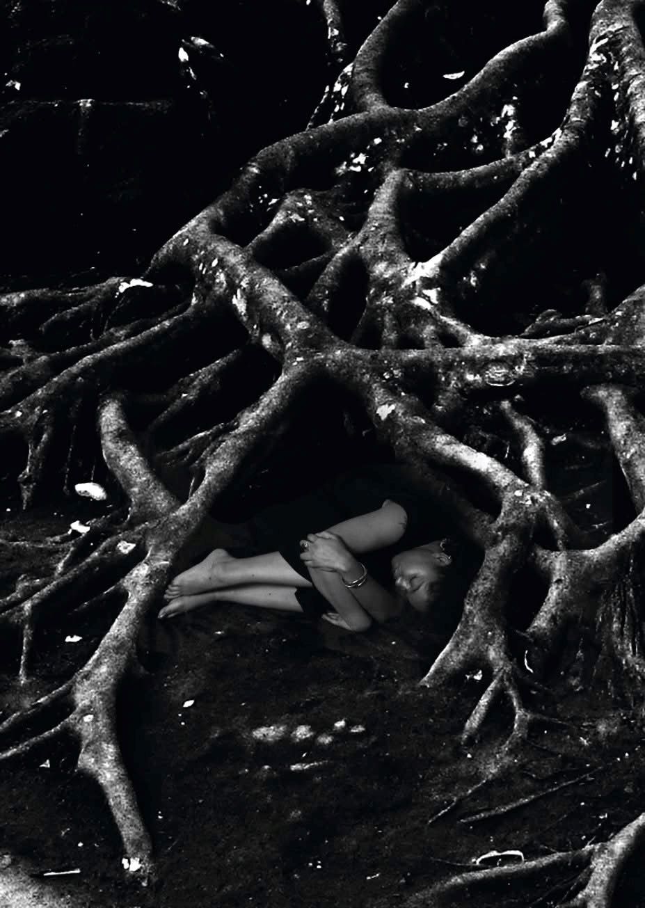 9. Still photograph captured from the video poem/installation “Invocation for Jose Antonio Aponte” from the Visionary Aponte exhibition. Video poem directed by Toshi Sakai, performance by NAM, original photograph of tree roots by Tosha Y. Grantham.
