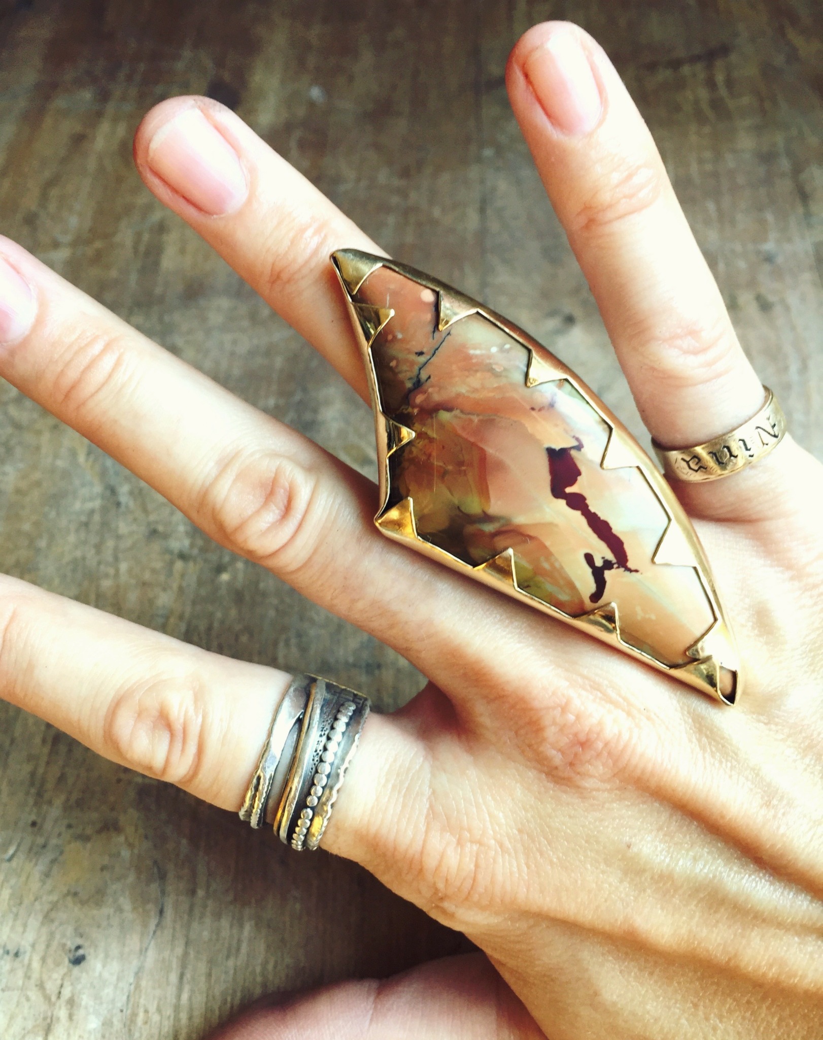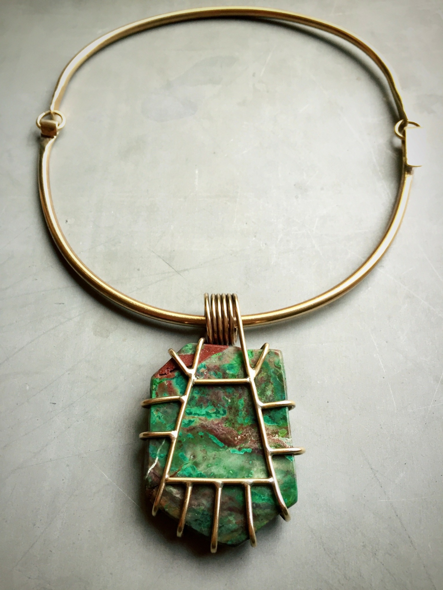 It all started out with a crash course in welding. I was enamored with the aesthetic and the physicality of steel, and I went on to spend some years making metal sculpture. I was actually the only girl working in the welding studio at that time, and it was difficult at first because nobody took me seriously. And while I wished there had been more females in that space, it was a point of pride and motivation for me- to be the only one, and to be good at it. I mostly made furniture pieces and kinetic sculptures with precision and detailed finishing. I found a real love for the tools and the process, and I eventually took a metalsmithing class to expand on that and also to scale down. But when I zoomed in and started using precious metals, I was still making kinetic sculptures, only they were wearable! I made a lot of big spinning rings and necklaces that looked like assemblage pieces. Over the years, jewelry and metalsmithing installed itself in my life. Sometimes it was my main focus but most often I had other jobs. But I always made sure I had a jewelry studio, somewhere! It was essential to give myself that access and ability to show up for my own practice. I’ve kept a studio in my apartment, the office of a punk rock newspaper, an old recording studio, in the back of my own fine art gallery that I owned in NYC’s Lower East Side and now in the sunny hills of East Los Angeles. You ask if I could’ve done anything to speed up the learning process, but jewelry making has played such a constant role in my life that I don’t think I could’ve done anything differently without dramatically altering my life. And you know, I don’t really think I want to go back in time and step on that butterfly. Although it wasn’t necessary to learn faster, I will always want to learn more. I continue taking occasional classes and workshops to this day.