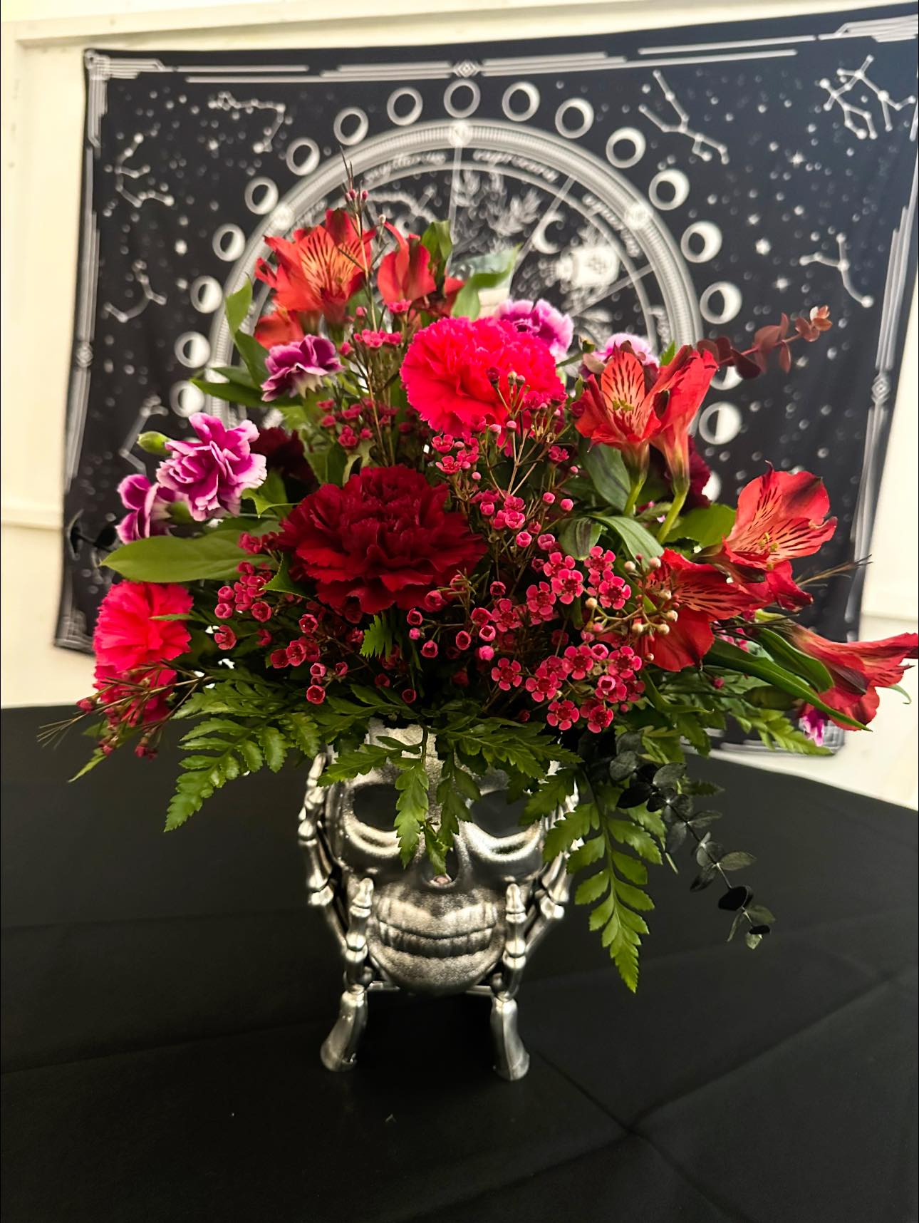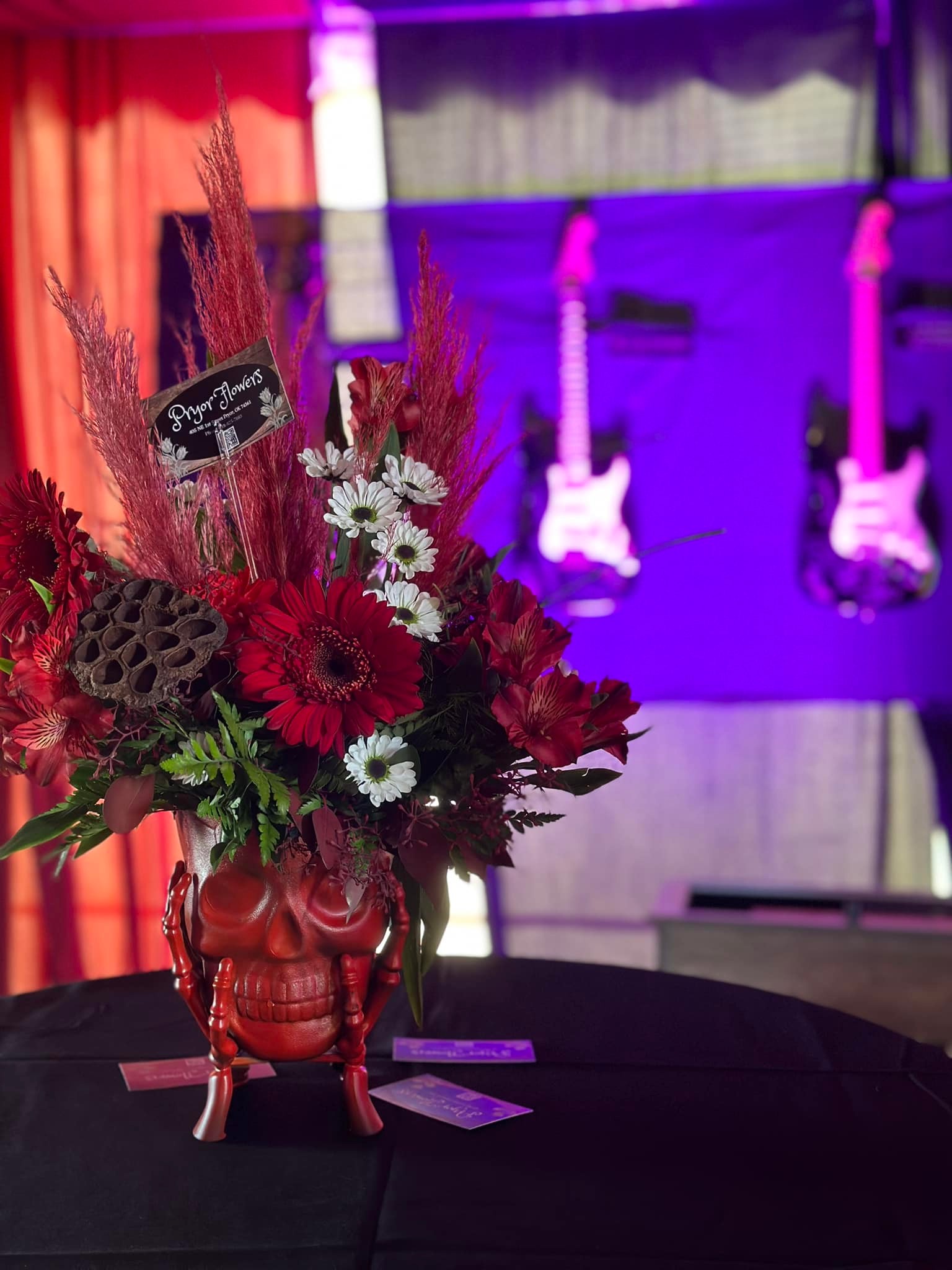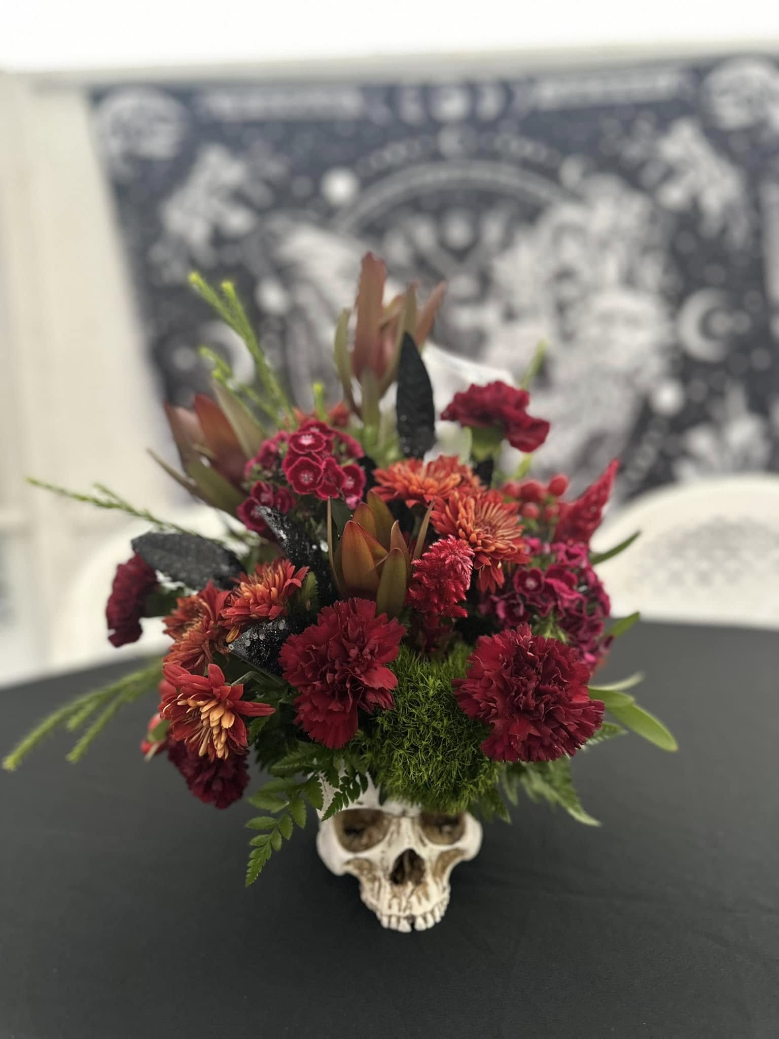 We live in a small rural town close to Tulsa Oklahoma. Our local town of Pryor has the largest Rock and Roll music festival in the state on labor day weekend called “Rocklahoma”. Our shop works with production company and put together rock-and-roll-themed flower arrangements for the VIP lounges and tents at Rocklahoma in & are decorated with nearly 100 centerpieces throughout the entire event. Some of us get star struck by performers like Evanescence, Shinedown, Alice Cooper and Three Days Grace to name a few. Our arrangements consist of skulls, red roses, succulent arrangements, and much more! This kind of exposure for a small business is life changing and we get so much publicity from local news networks and organizations giving huge shout outs for our creativity and floral designs.