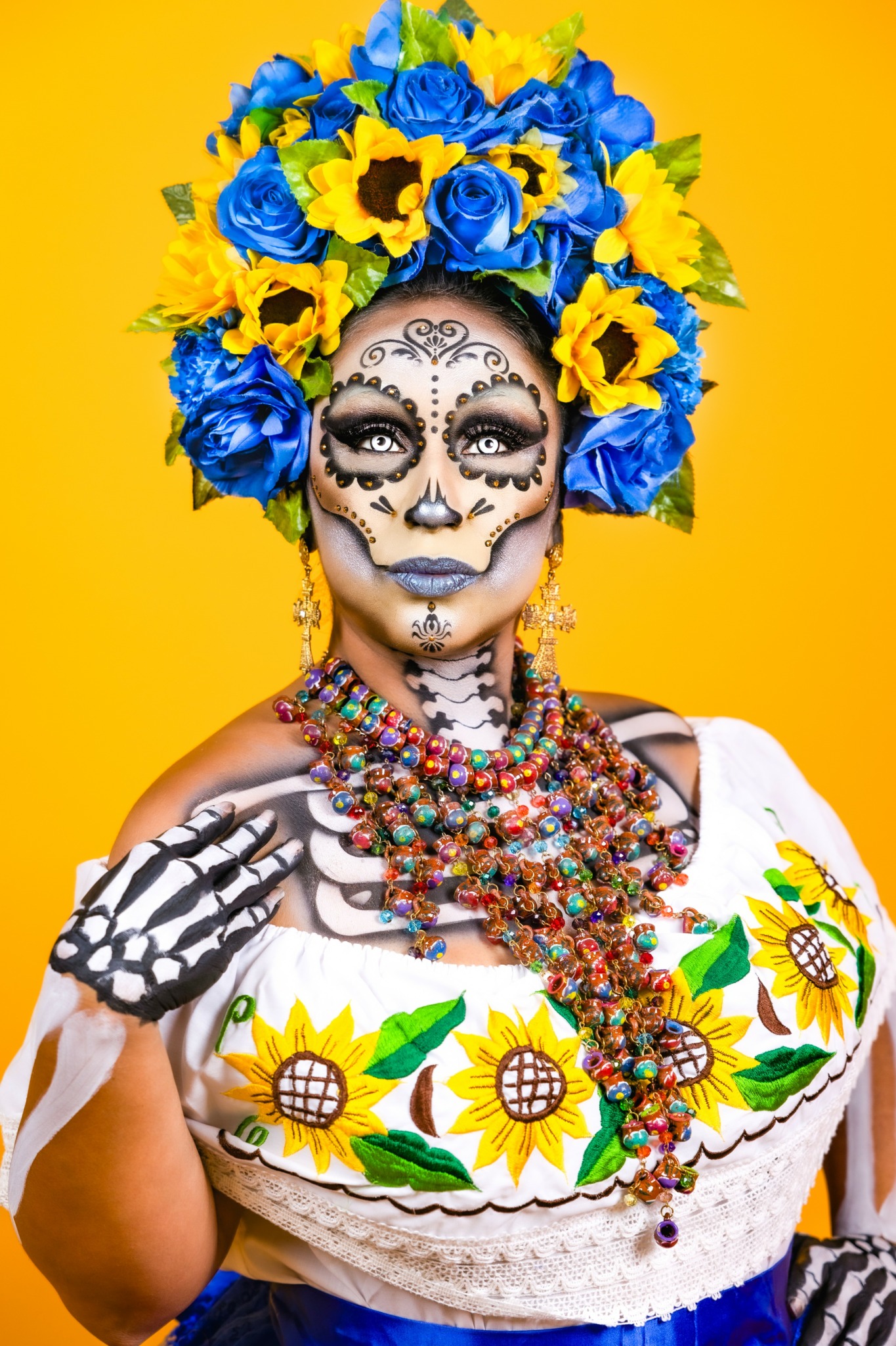 Creative Credit Yellow backdrop: Dia de Los Muertos Catrina, Makeup and outfit: Belleza Tarasca