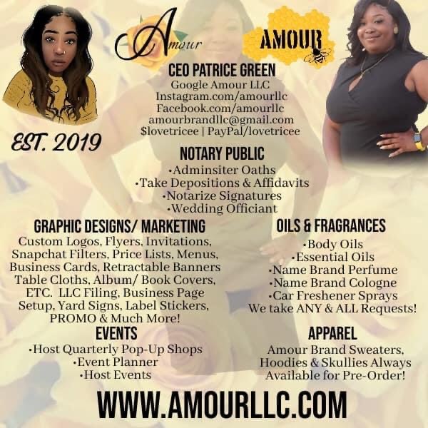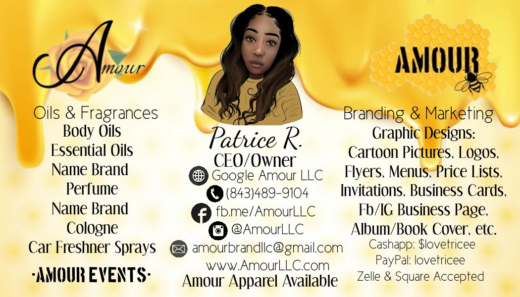 The market I chose was Body Oils and Essential Oils I later added Car freshener sprays and name brand Perfume & Cologne. I accept any and all request for all oils and fragrances. To let the public know what I was selling I hosted my own very 1st Pop-Up Shop and it was a huge success! While in the preparation process of hosting that event I learned how to graphic design, starting with my business cards and eventually flyers, logos, menus, price lists, you name it! I always say God sat that talent on my lap! In the 1st year I made over 200 designs and gained 1,000+ followers on Facebook. I then created multiple logos for myself and started to offer apparel. Amour LLC offers Tshirts, Sweaters, Hats & Skullies available on AmourLLC.com In the midst of that I Hosted, Co-Hosted and planned several more events: Altogether 11 community flea market events as well as a paint and sip and a free community kids fest. The next one coming up on Memorial Weekend. In 2021 I began to manage Local rapper MGM LongWay of Money Gang Mafia and became a South Carolina Notary Public. In the future I would like to create my own brand perfume and cologne and I’m in the process of writing an urban non fiction book, “Love Trauma” a first of many books to come. What started off as a small oils business has grown and multiplied tremendously into several different businesses and I enjoy every bit of it . I love everything I am now involved with and can’t wait to publish my book and use it to start a non profit organization for domestic violence, Yvette Survivors. My motivation is my Son a miracle in several different ways and this quote inspired my Logo Designs. I felt applied to my Son and the battles he faced as a micro-preemie and since my Brand is named after him….. 💛 “According to all known Laws of Aviation, there is no way that a Bee should be able to Fly. Its wings are too Small to get its fat little body off the ground. The Bee, of course, flies anyways. Because Bees don’t care what Humans think is ”IMPOSSIBLE.” -Jim Cummings “Bee Movie” (2007)