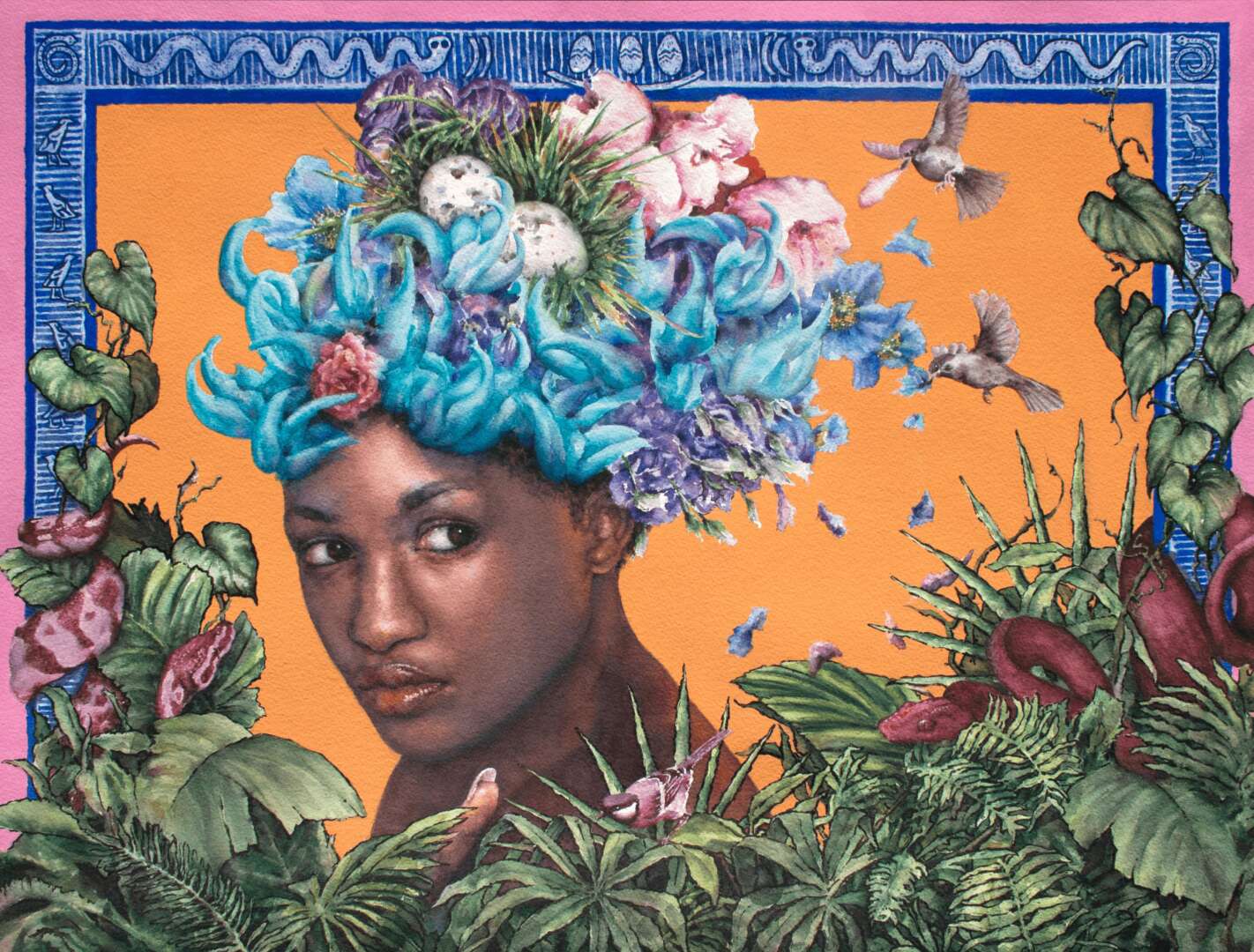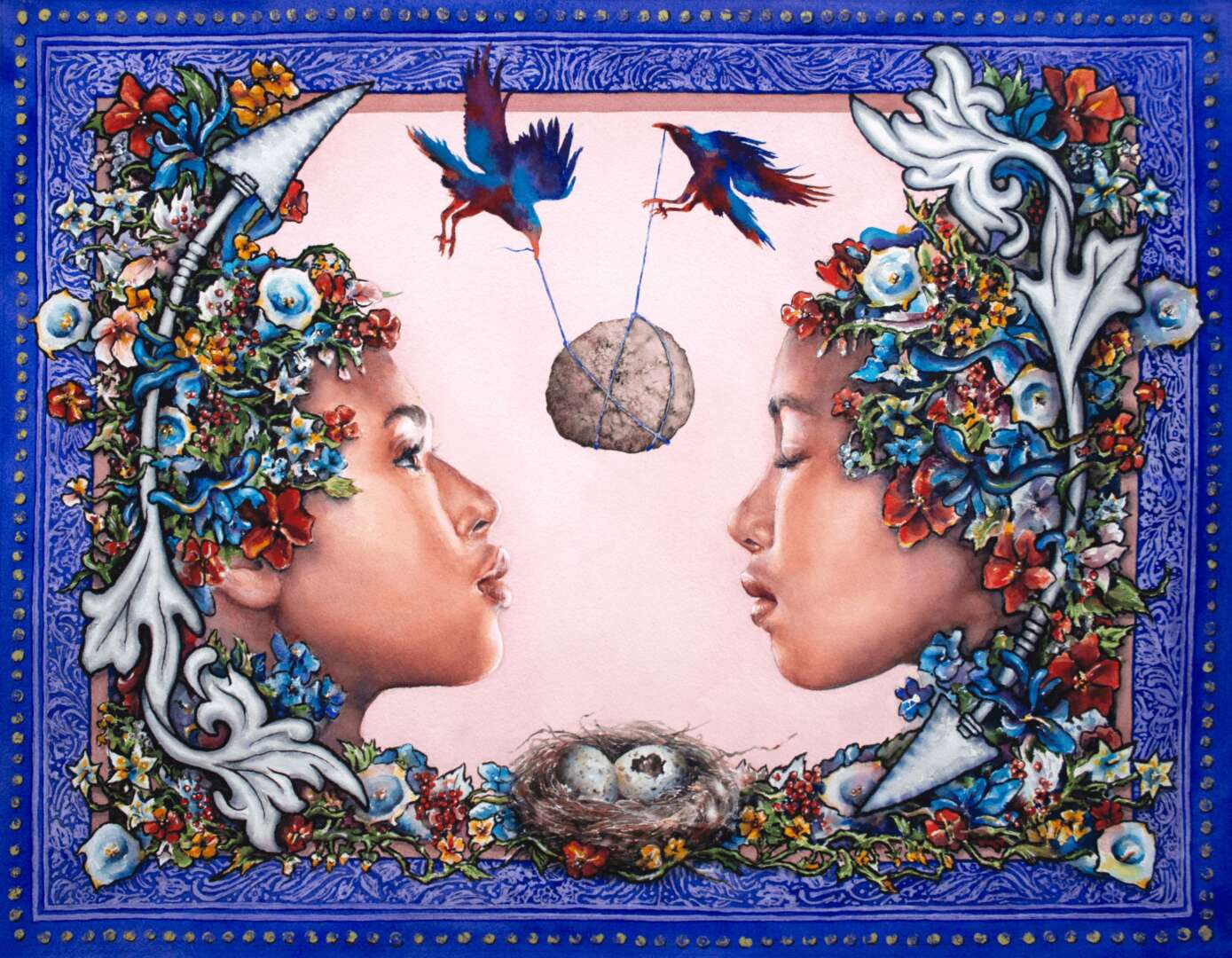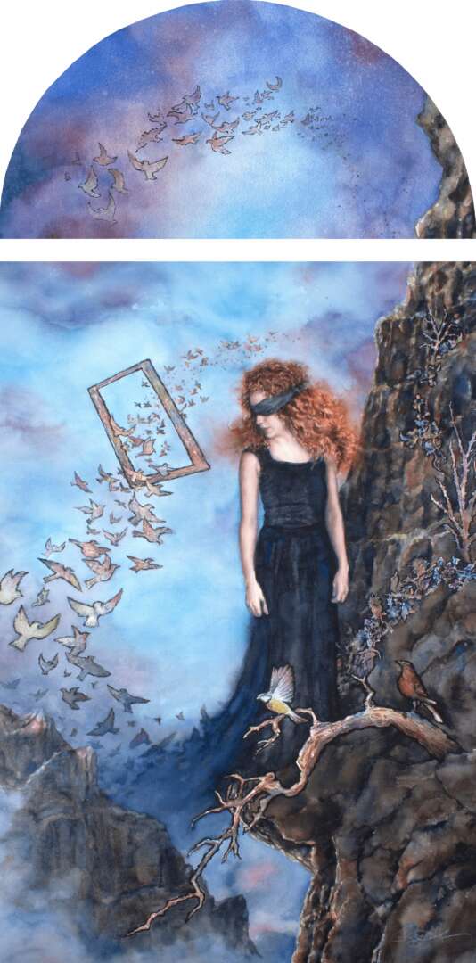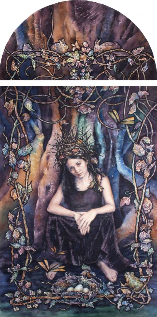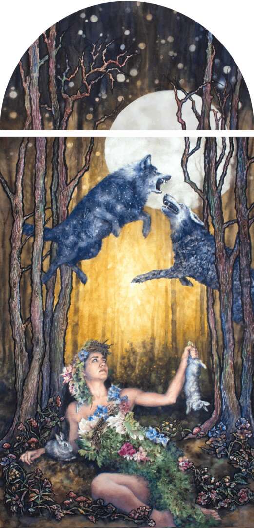 Untangling Our Roots, explores the evolution from childhood beliefs and cultural influences to developing a unique path and voice as an adult. Each painting in the series addresses a different universal struggle and is infused with a solitary figure, enigmatic nature as a healing and guiding force, and/or spiritual and cultural symbolism. This series strives to embody mystery, beauty, exploration, and discovery.