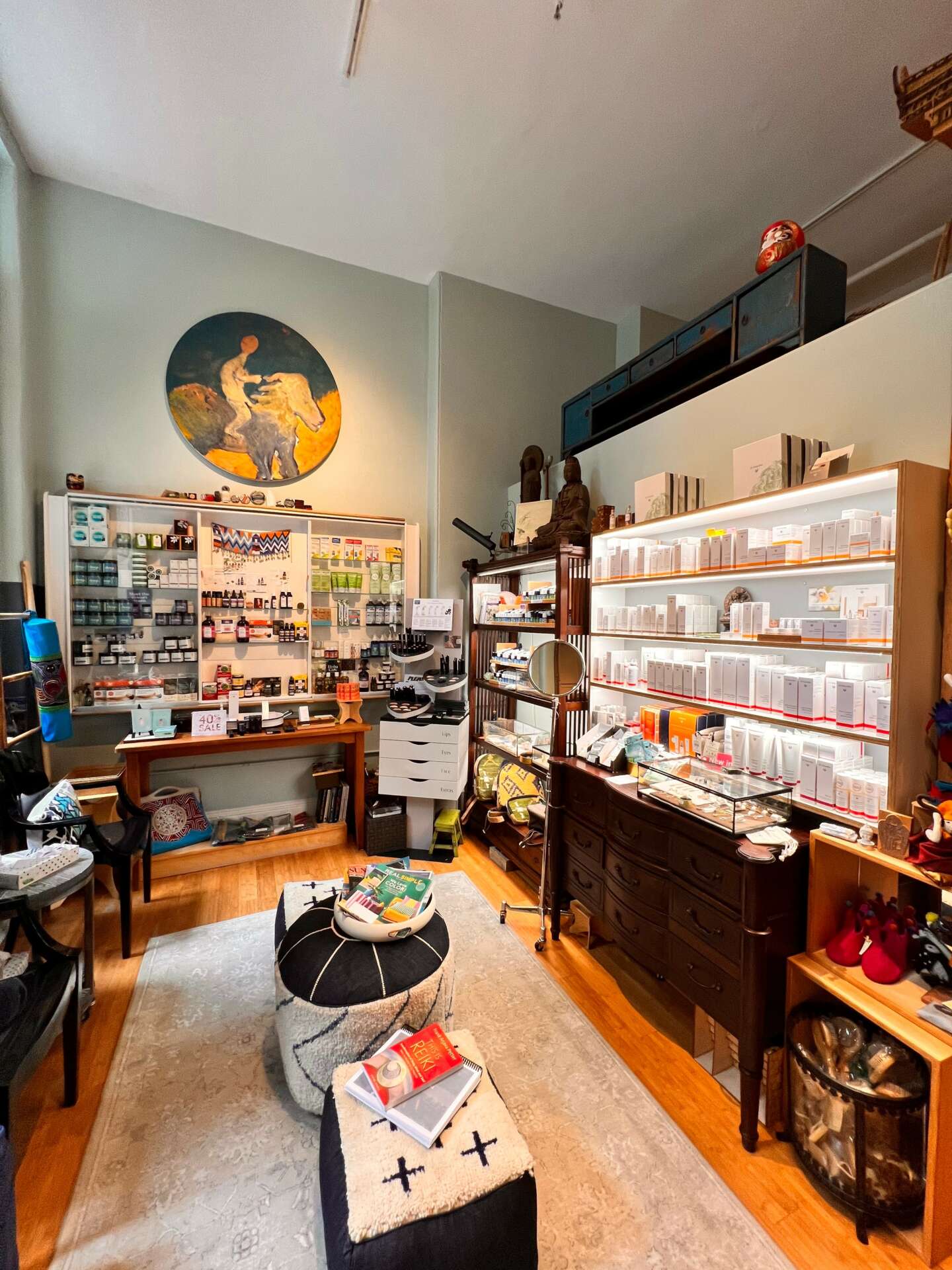 As I mentioned, we were required to close the spa for six months due to COVID-19. I had no idea how I could pay overhead and support myself. I knew my staff could get COVID relief, so that was incredibly fortunate, and a load off my mind. Ironically, I had scheduled renovations for the spa the very day we had to shut down! So instead of being closed for a few days to paint, install cases and lighting, I had nothing but time. I moved all furniture and product myself. One man came to paint with me; we wore masks and worked in separate areas or different times. The cabinetmaker delivered and installed a custom display case when it was safe and permitted. It all happened somehow. I rearranged our meditation space and library. I tore through old files and storage and recycled and shredded so much, the whole spa actually felt freed from some jumbled captivity.