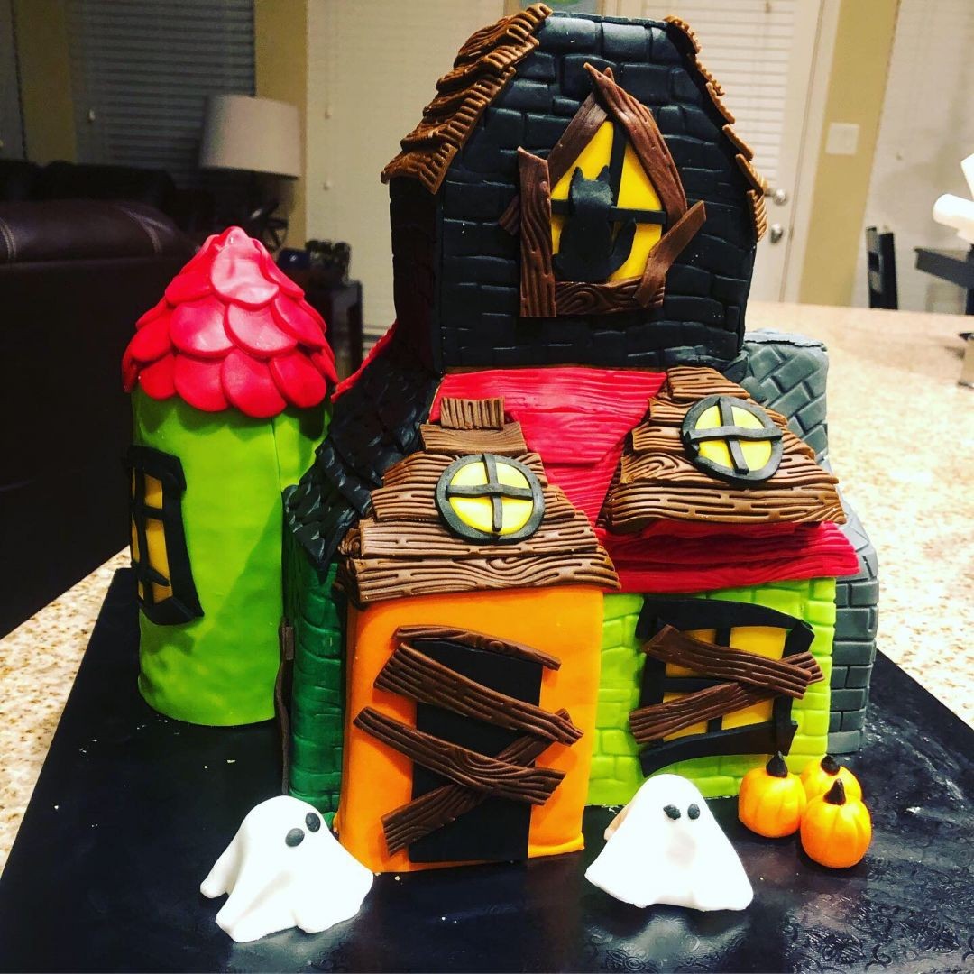 My friend’s son really wanted to make a haunted Halloween house for his school party. He drew a two-story house, including a colour guide for different sections of the house and scattered ghosts and a black cat in one of the windows. I was able to replicate his extremely creative design and turn it into a sugary, buttery but still spooky haunted house cake.