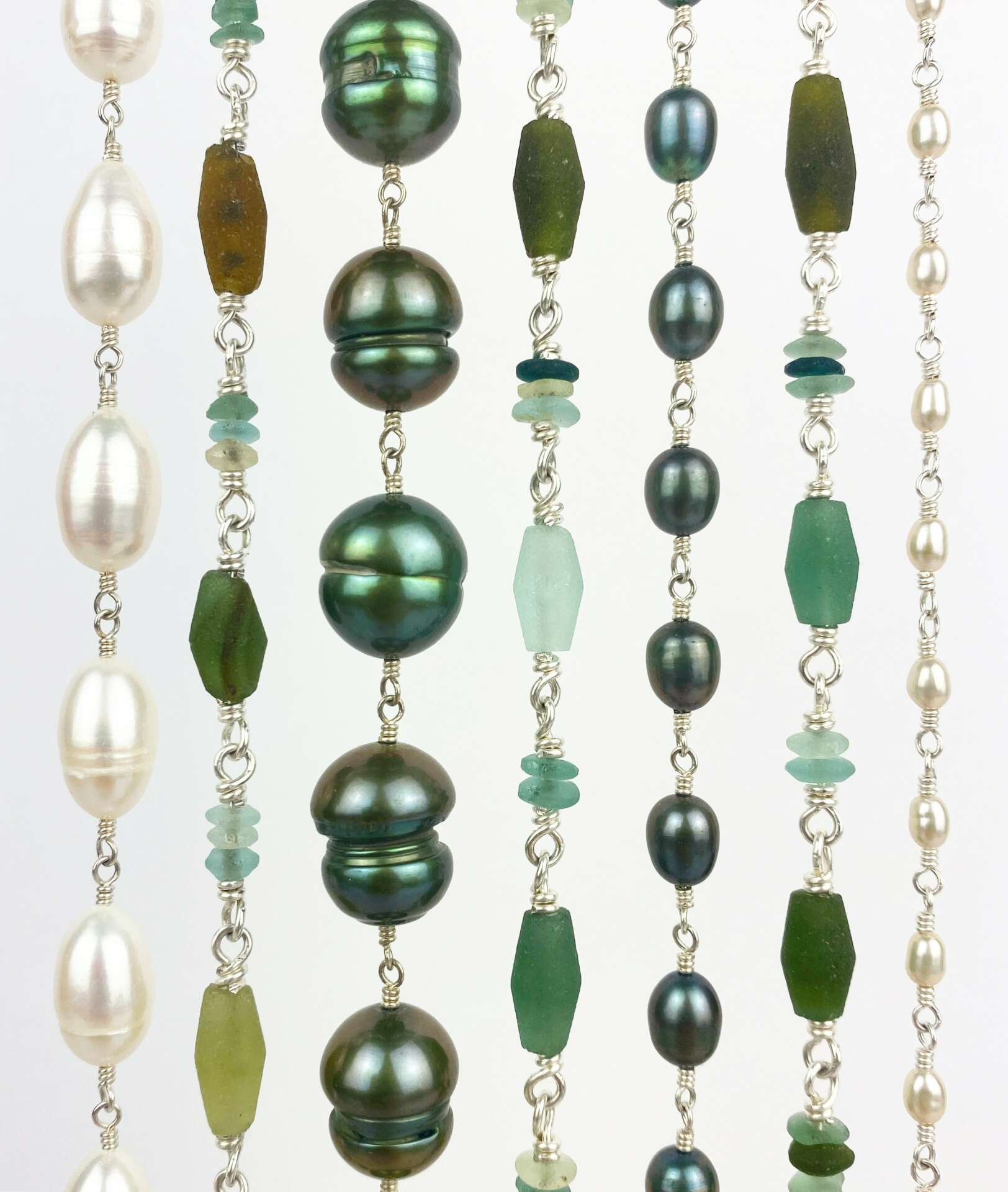 I also work with a few other gemstones and antique glass. The glass has been a fun way to expand my offerings while keeping the same ethos. There is a similar organic quality to pearls that you find in glass, each piece is unique and slightly one of a kind.
