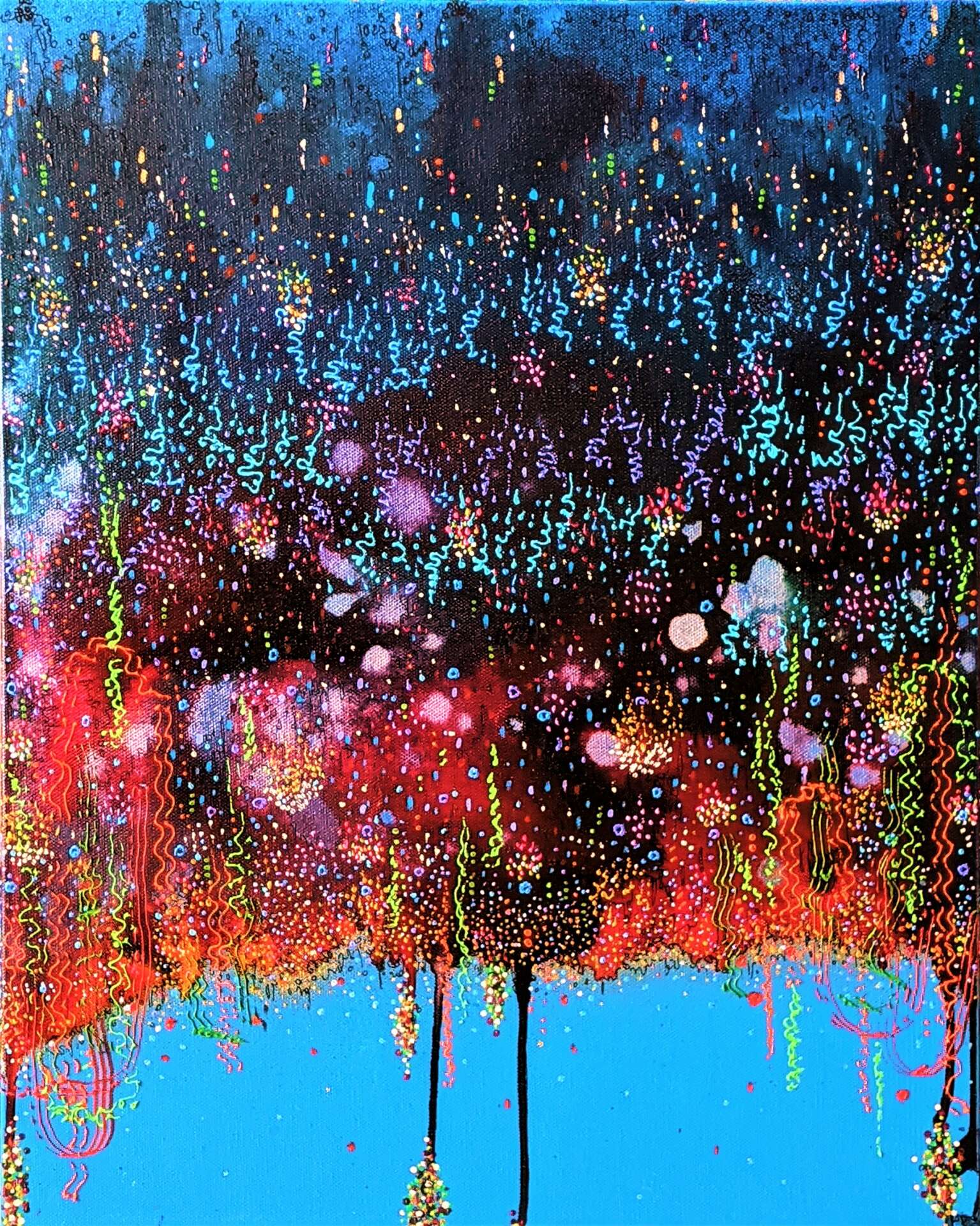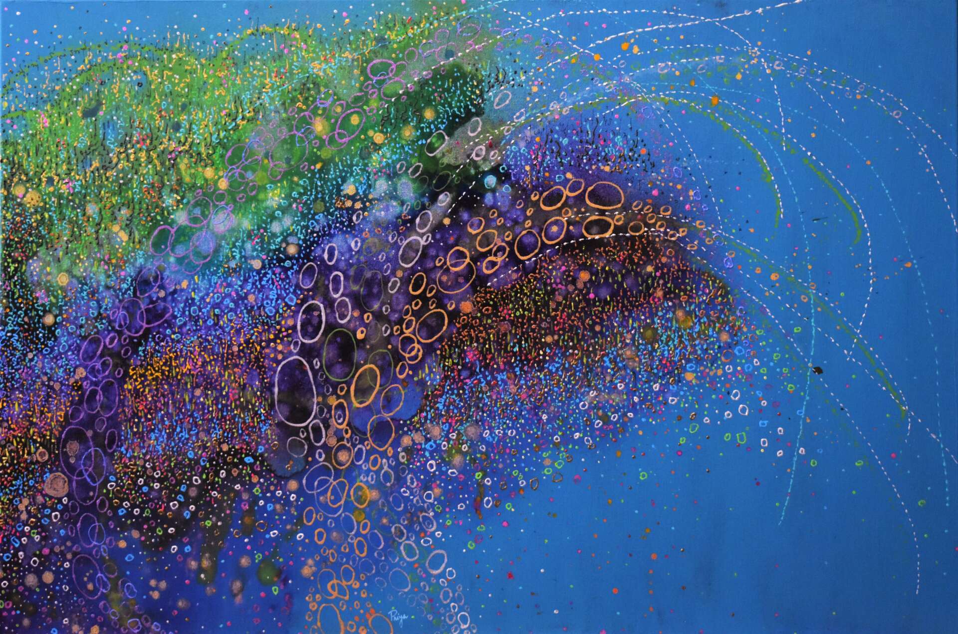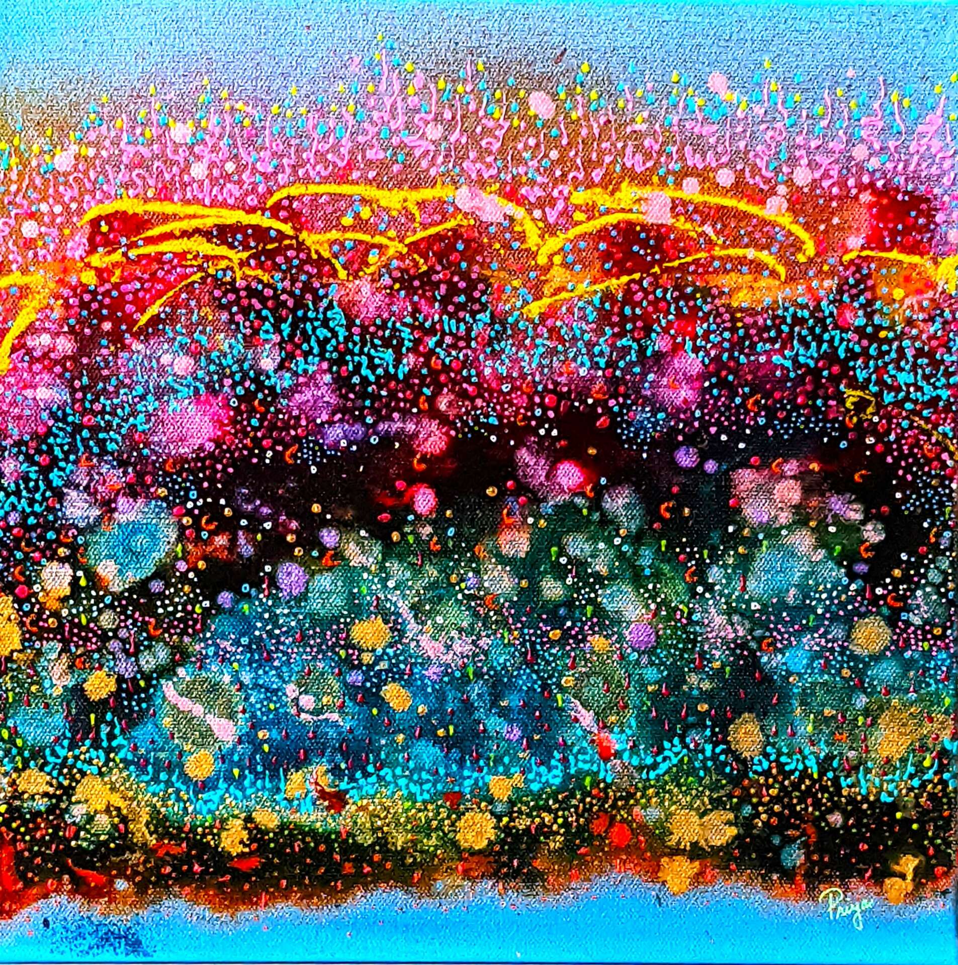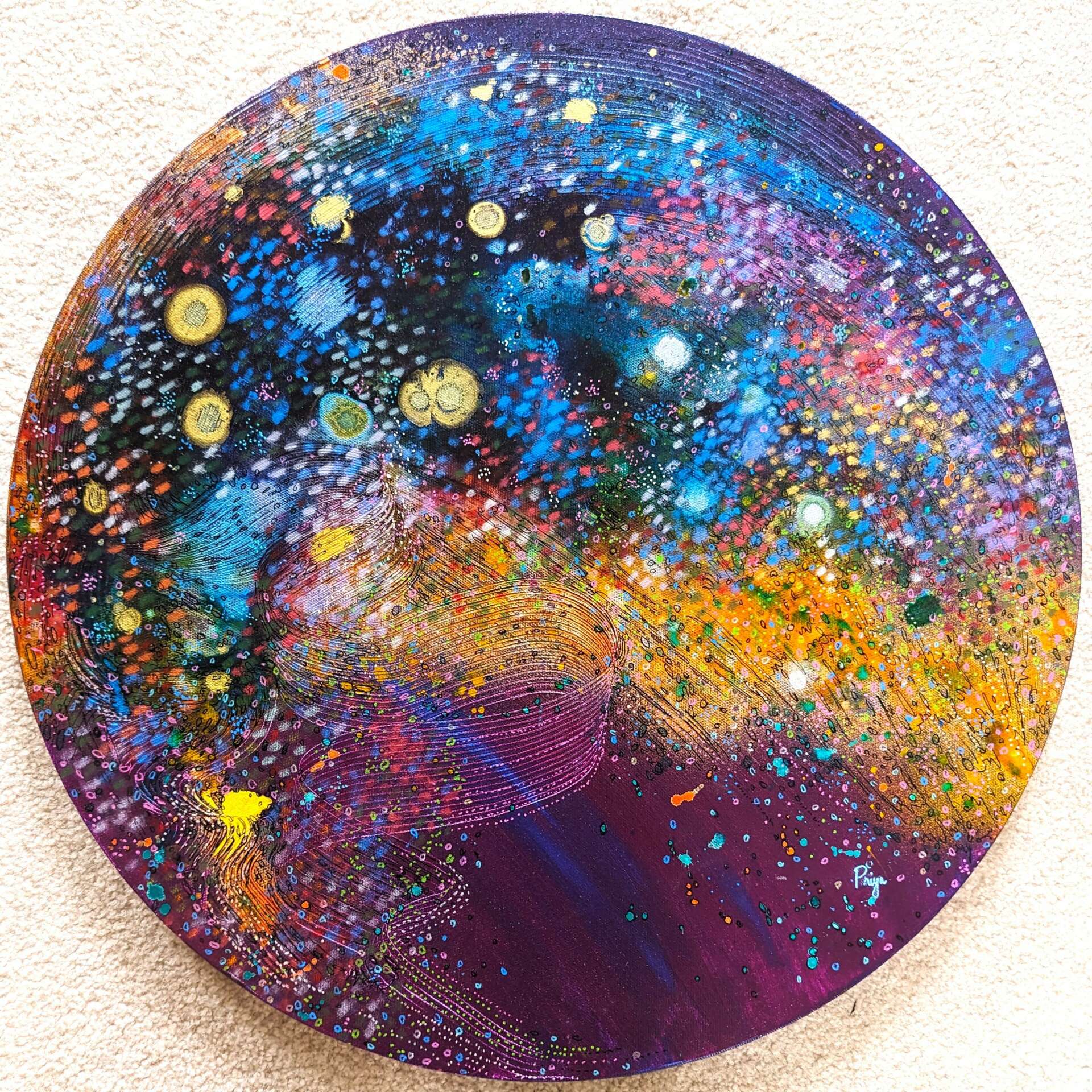 I paint the images I experience inside my head when a migraine comes on. If you searched for ‘migraine images’, what you’ll typically see is works by migraine sufferers that depict what their pain is like. What my work offers, which makes it unique, is the depiction of a migraine inside the head. When the pain and pressure of the migraine gets underway, my mind is slowly flooded with color, textures, play of light alongside movement. It is like a slow-motion movie that I am able to travel within and get immersed in. What I experience gets translated into my paintings. Of course, I don’t paint during the migraine, but as soon as I begin to feel better, I do: I am able to remember these images and paint at a later time. So, my paintings offer an ‘inside out’ perspective of the migraine experience.