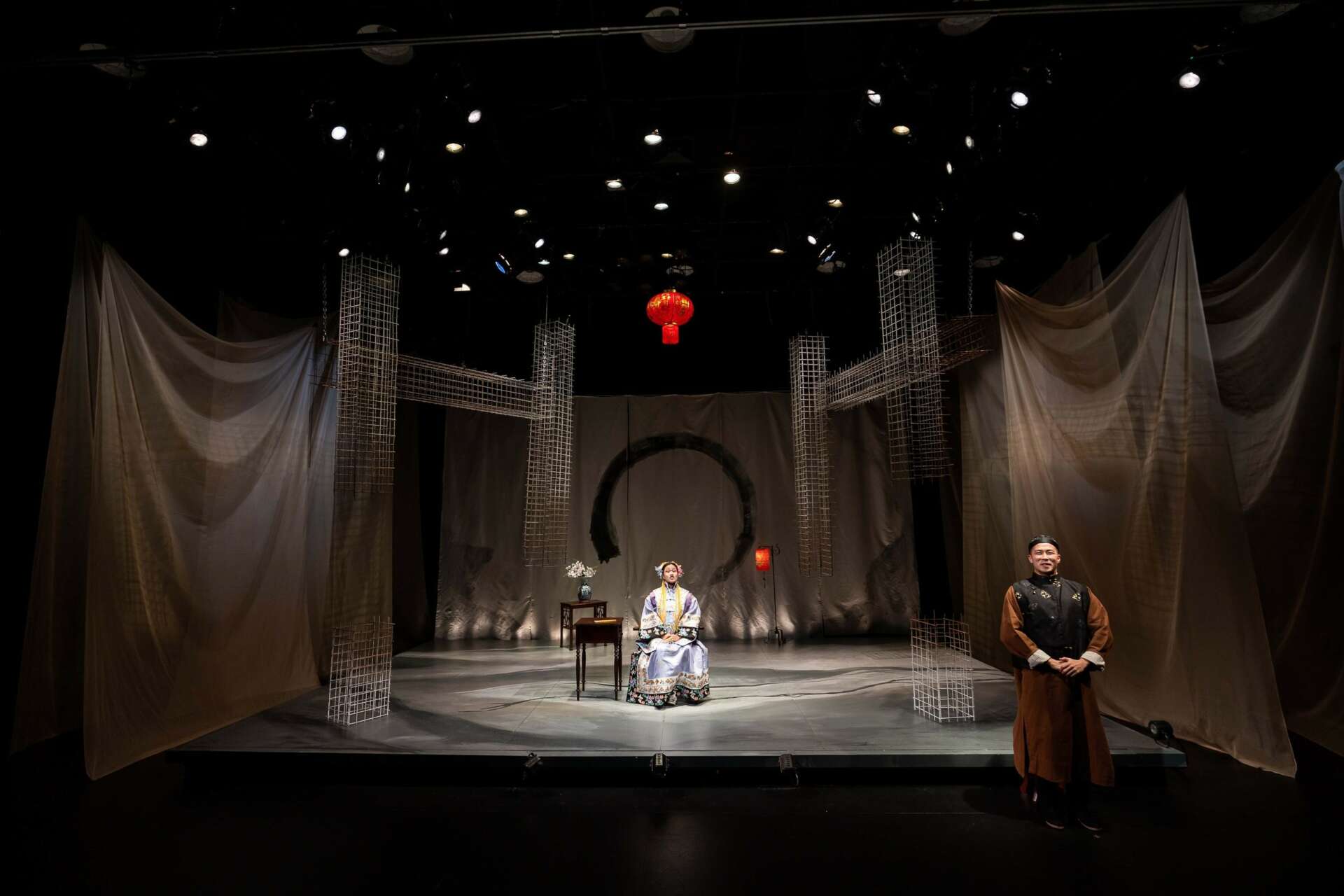 For example, in the set I designed for “The Chinese Lady” at Central Square Theater in Boston in 2022, I introduced wire mesh sheets to build a structure that captured the architectural essence of a traditional Chinese home gathering space but more timeless and balder in a sense while wrapping the entire space with translucent fabric curtains which finally teared down by the main actor. During the final scene, a round mirror was revealed upstage as a motif of a reversible observer-audience dynamic between what was happening on stage and the rest of the world. What I would like to communicate through the materials and the transformation of the set was to bridge the gap between a historical narrative and contemporary social contexts through the physical boundaries of the set itself. Why would this story matter to the present audience? How could I break the boundaries or at least make it permeable? These were two of the major conceptual questions I kept asking myself during that time.