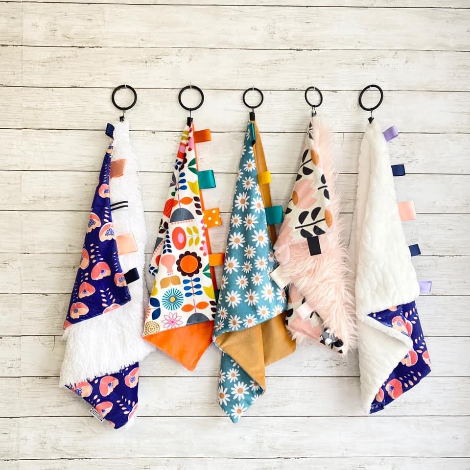 I started Montgomery Jane Kids in January 2020, because of my daughters love for tags. She has to rub a tag to fall asleep, and I wanted a lovey blanket with tags for her that was both functional and stylish at the same time. I came up with the design so that the lovey could also be used as a blanket in the stroller and carseat, but is also cuddly enough for the kids to soothe and fall asleep with, and with a cute print!